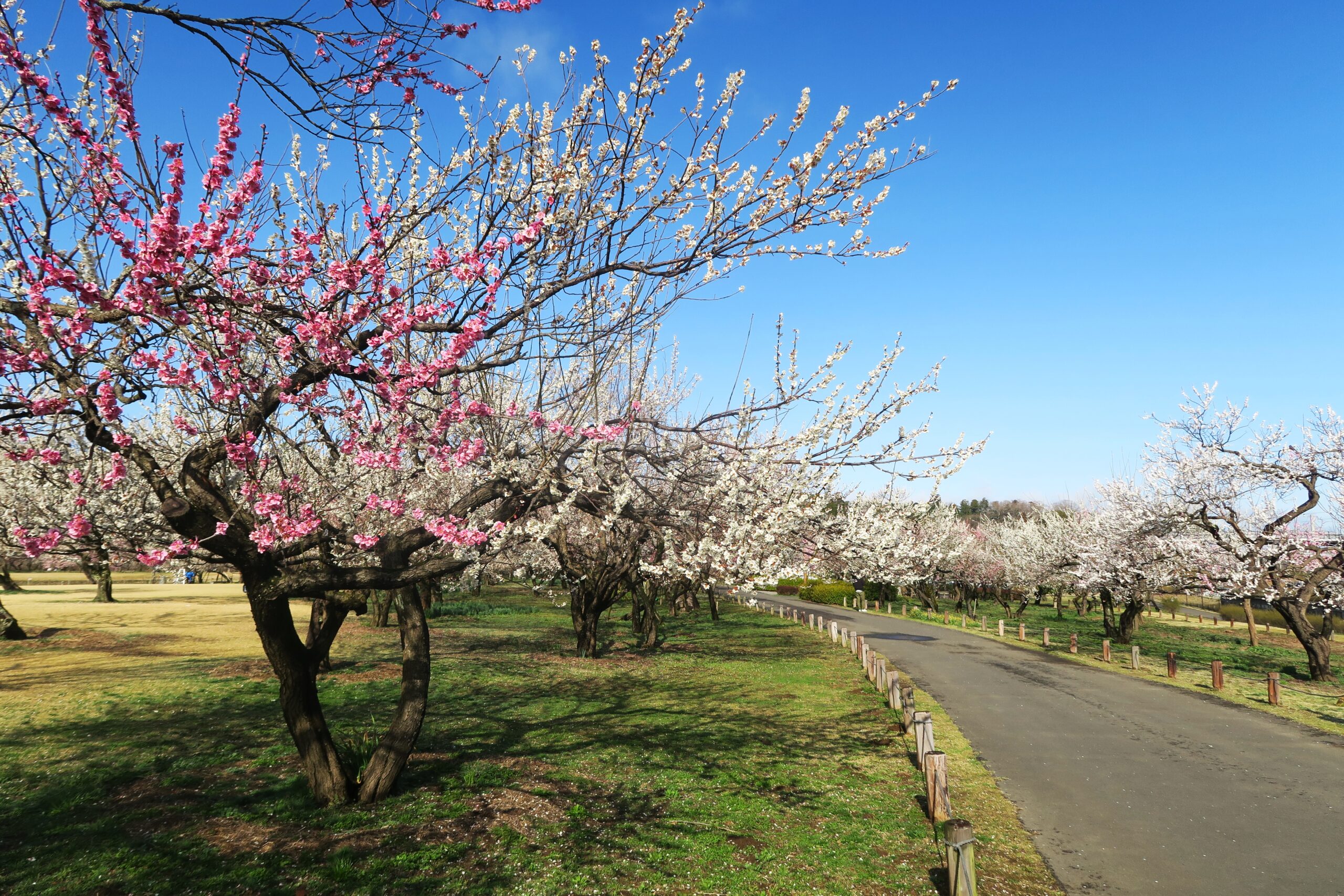まさに陰から陽へ踊り出る感覚が味わえます。東西梅林では、色とりどりの梅の花が咲き乱れ、空気までふくいくたる梅も香りに包まれます。とくに東西梅林の東端から大杉森を背景に見ると白や淡い紅色に咲く梅花と、暗緑色の杉森との調和が美しいとのこと。