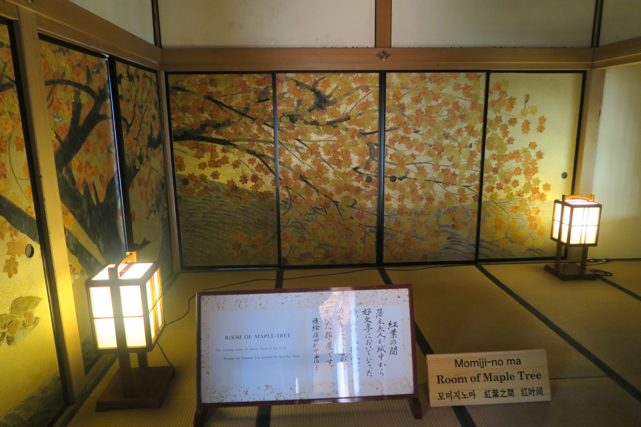 玄関から順路はまず奥御殿を見学します。10室からなる質素な平屋造りで藩主夫人などの休養の場ですが、城中で出火した際の備えともいわれています。菊の間・つつじの間・桜の間・萩の間や藩主夫人の座所や奥対面室として使用された松の間・控えの間の紅葉の間。