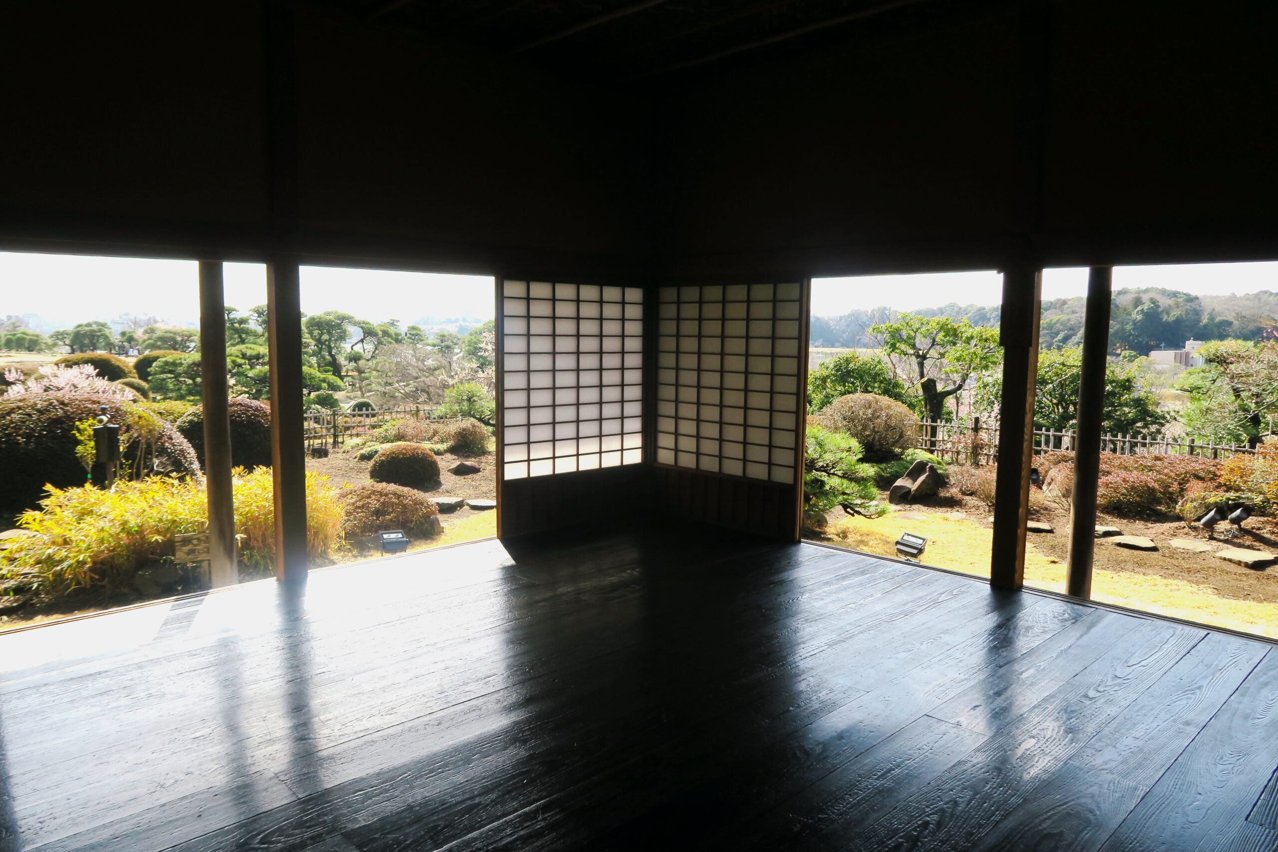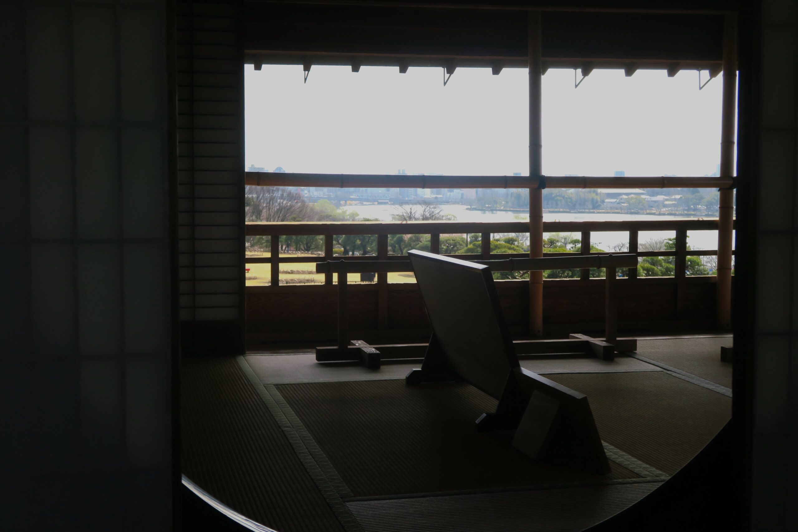 表門から続く狭い視野がここで一気に広がり、感動を呼び起こすようにと視野を妨げぬように細かい心配りが見て取れます。創建時の床柱は島津斉彬から贈られた薩摩竹でした。眼下に梅林や園外の千波湖まで一望でき、この建物を境に「」の世界に入ったことに気付きます。紅白の梅が一面を染める光景は息を呑むほどに美しい。