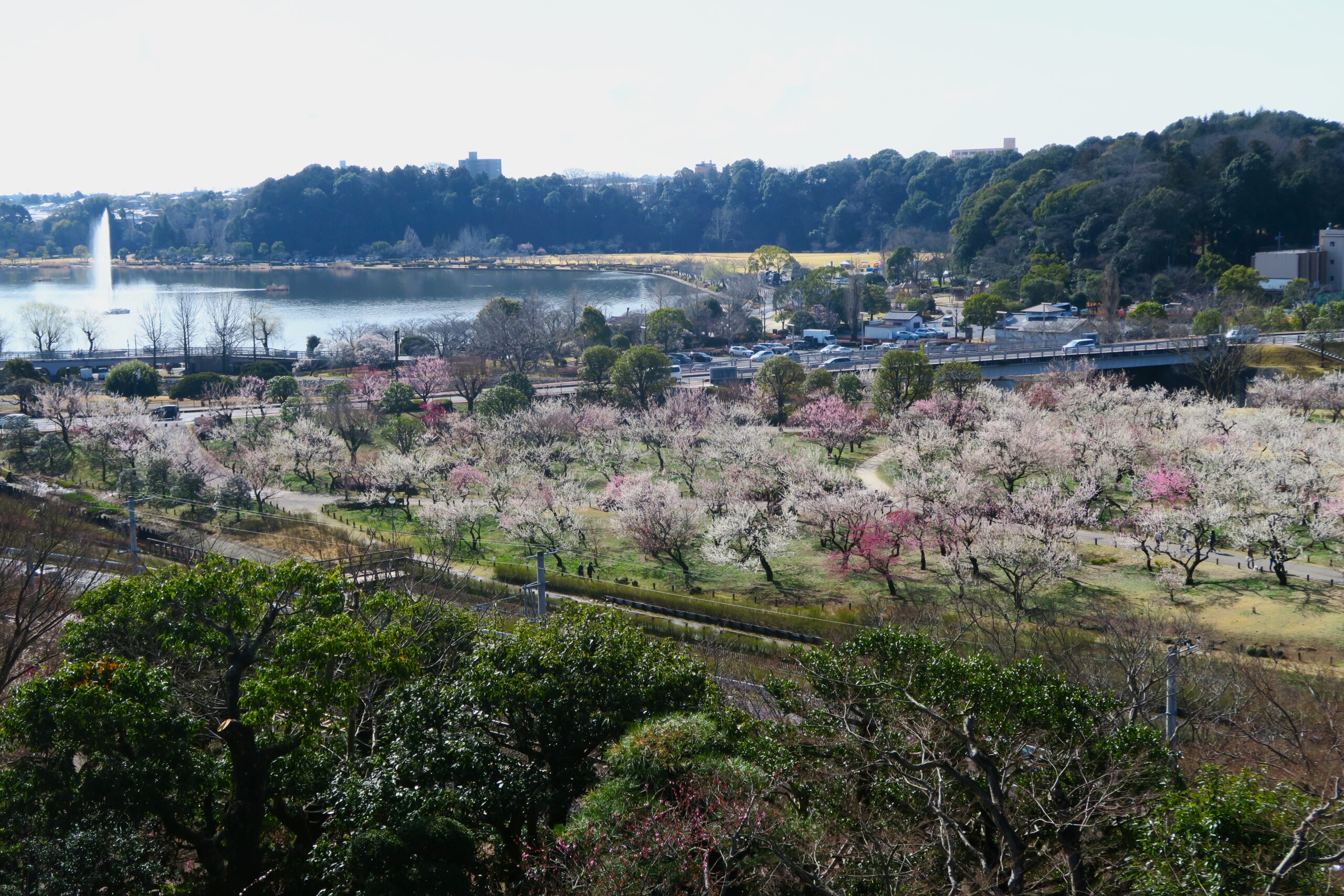 東西梅林を楽しんだあと東門から出てJR常磐線を跨ぐ偕楽橋を渡ります。偕楽園の眼下には梅を中心とした田鶴鳴、猩々、窈窕の各梅林、明るい芝生広場、水鳥たちが遊ぶ月池が点在し、水戸藩の黄金期を主導した斉昭の希宇を体現するような大空間が広がっています。