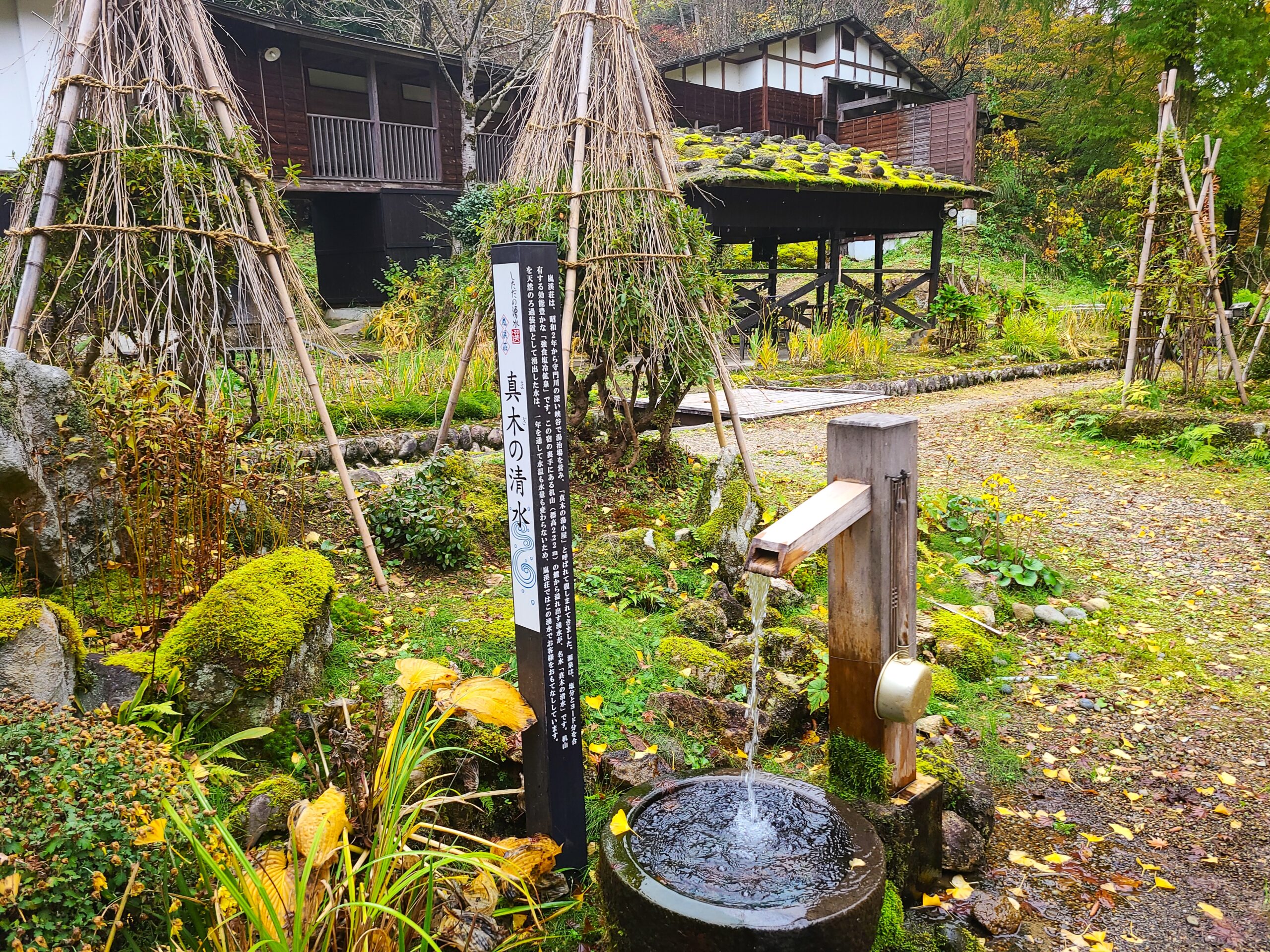 嵐渓荘には水道が通っておらず、全館で「真木の清水」を利用しています。真木とは土地の一番上手の意で宿の裏手の机山(標高222m)の麓から溢れ出す湧水です。机山を天然のろ過装置として湧出した天然水は、一年を通して水温も水量も変わらず、調理を含めて嵐渓荘内全ての飲料水として使われています。