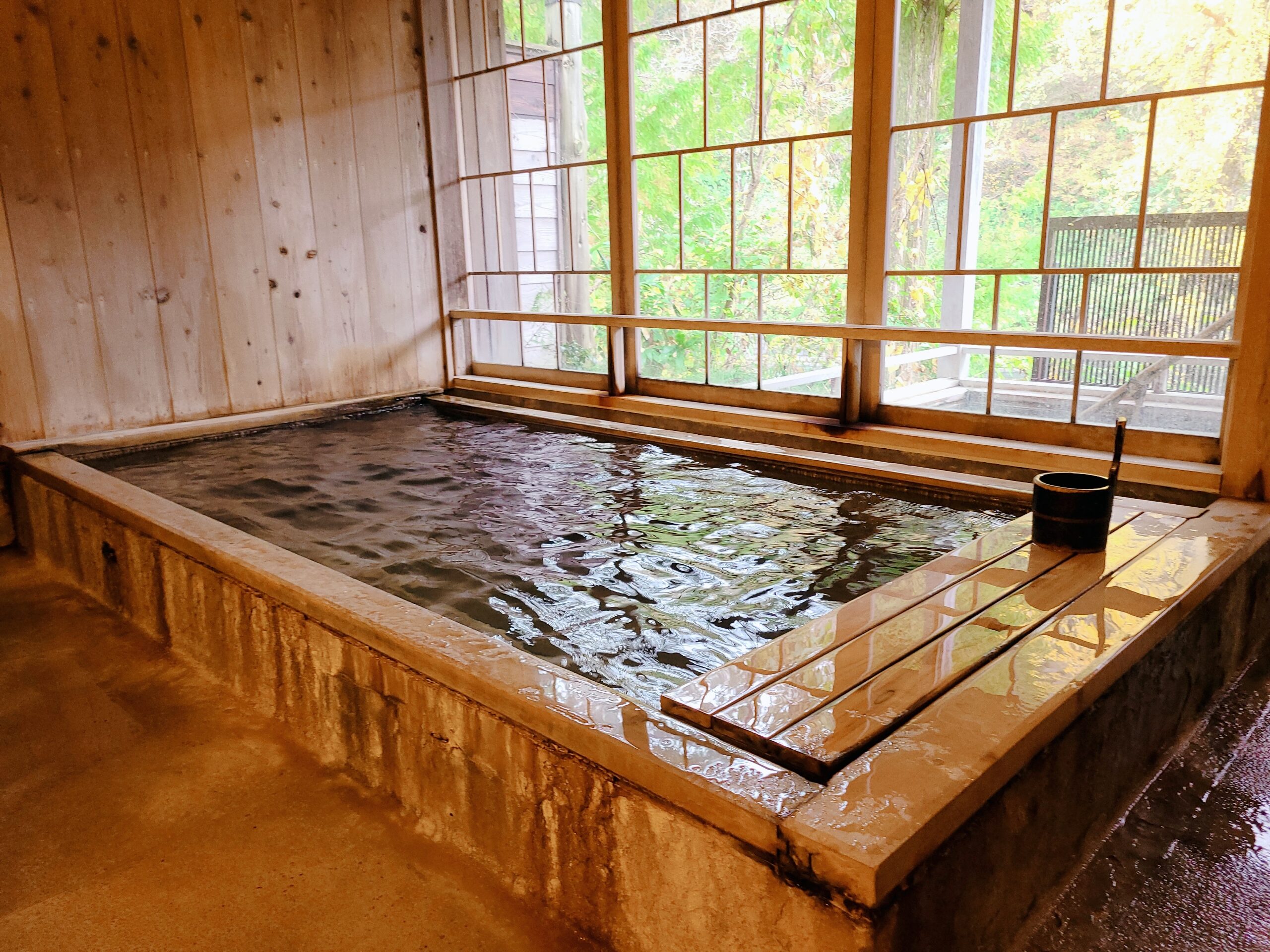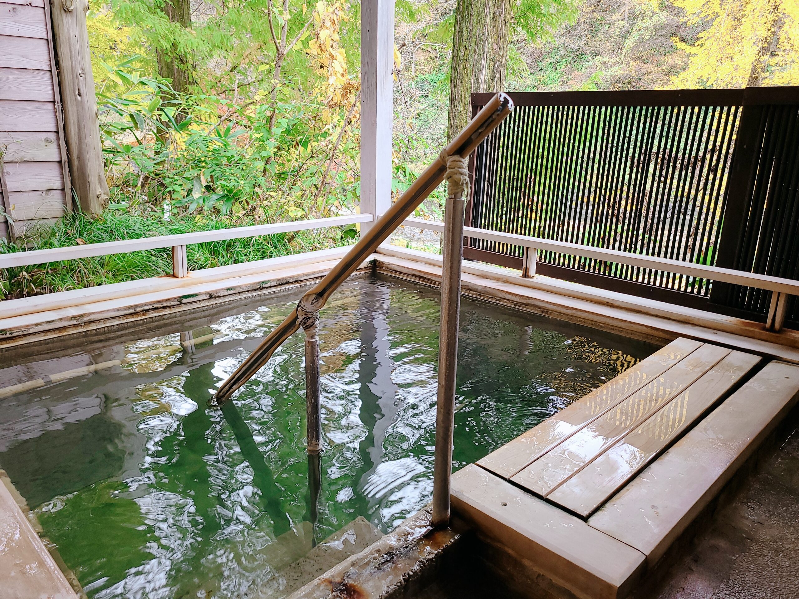 瀬音が届く場所に設えた貸し切りもできるりんどう館の奥にある二つの露天風呂「山の湯」でその源泉を浴びると日本屈指の濃厚な塩分とヨードを含有する効能豊かな強食塩冷鉱の湯は肌にまとわりつき、良く温まる。今回は入浴させていただいた深さが約130cmある「山の湯 深湯」は立ったまま入る湯船です。ふわふわと体が浮き、湯の感触も相まって独特の心地良さです。