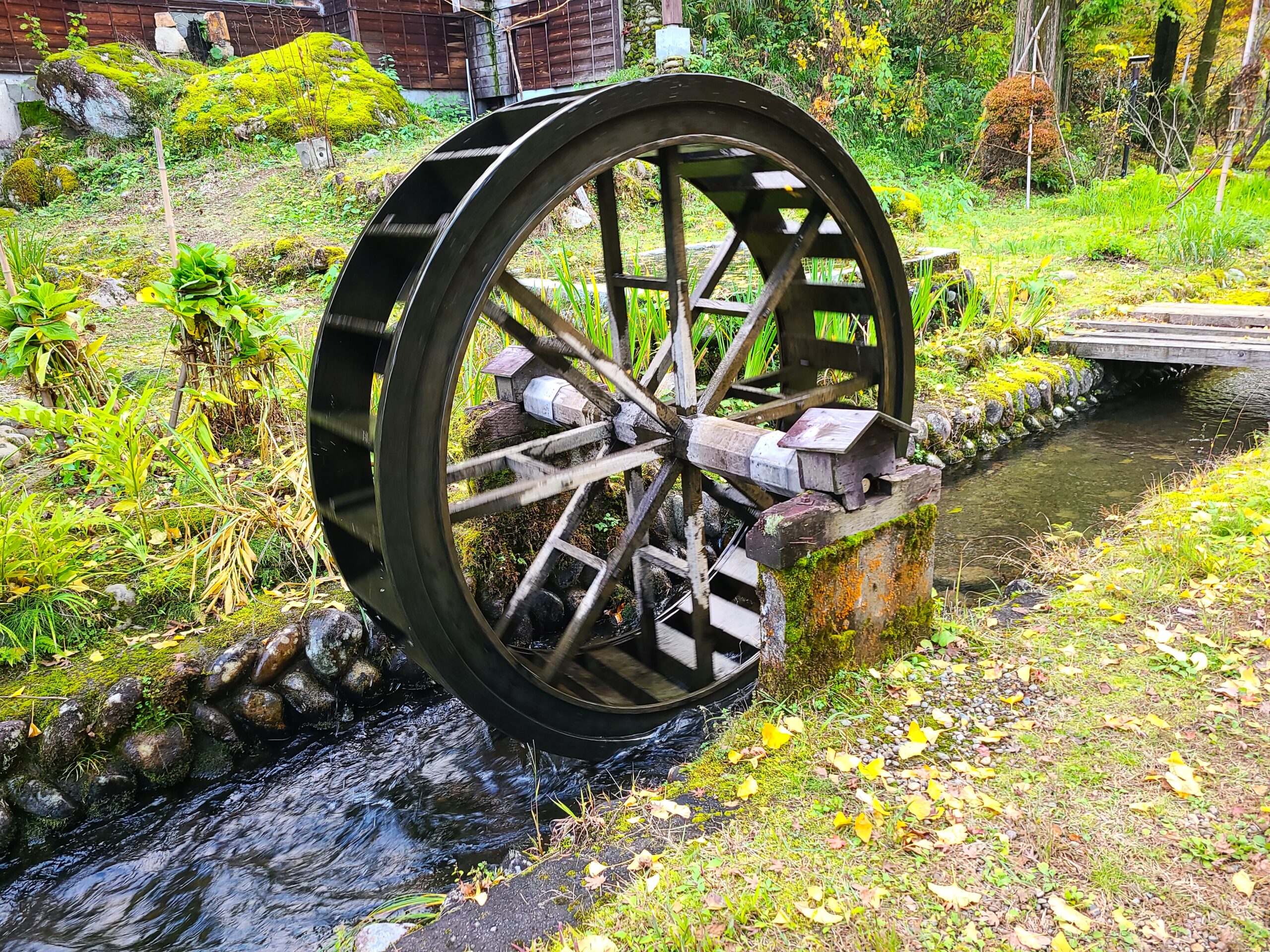 のどかな山里の風景が、越後山脈の名峰・守門岳から流れる守門川に沿って3000坪の敷地が広がり、涼やかな風が渡り、スイスイとトンボが飛ぶ。敷地内には清冽な山水を引き入れた堰が設けられ、瀬音に混じって水車が音を立てています。水車の脇には石置き屋根の東屋や炭窯もあり、いかにも郷愁を誘う情景がそこにあります。