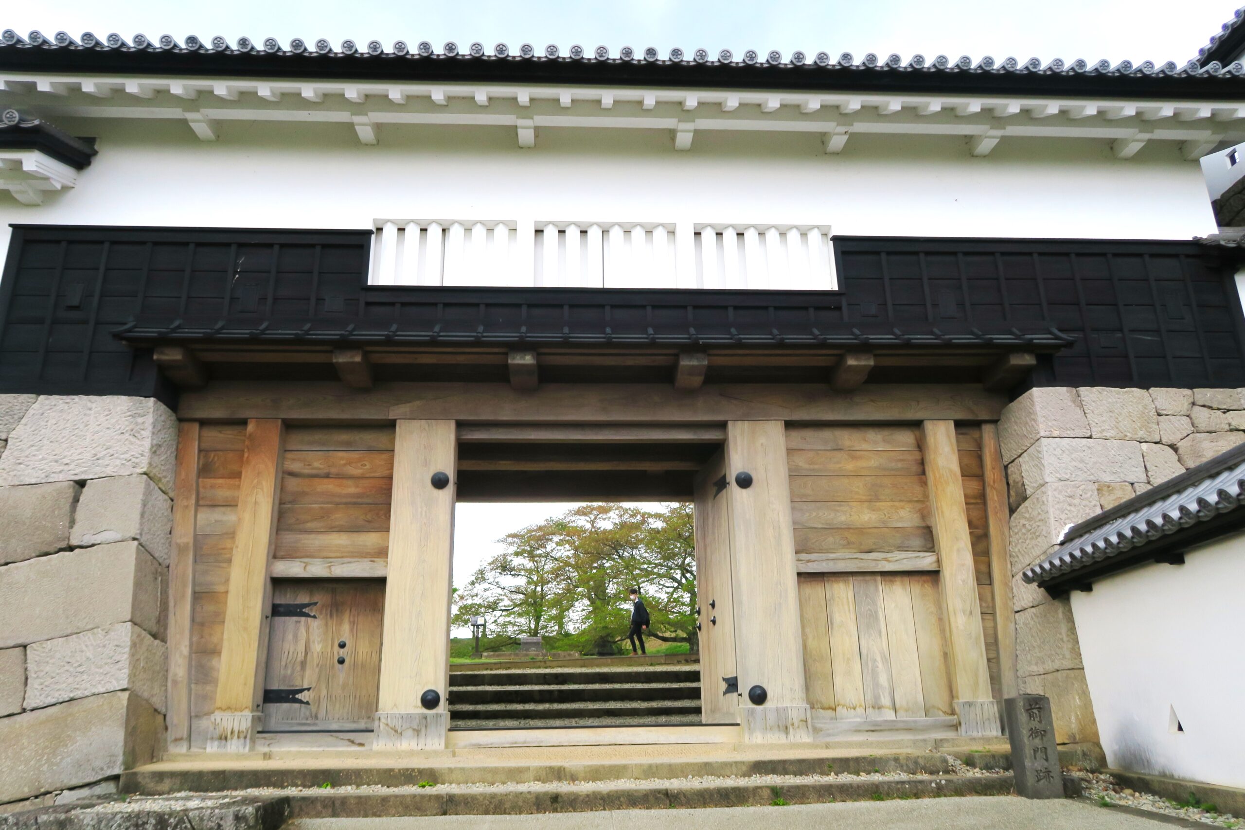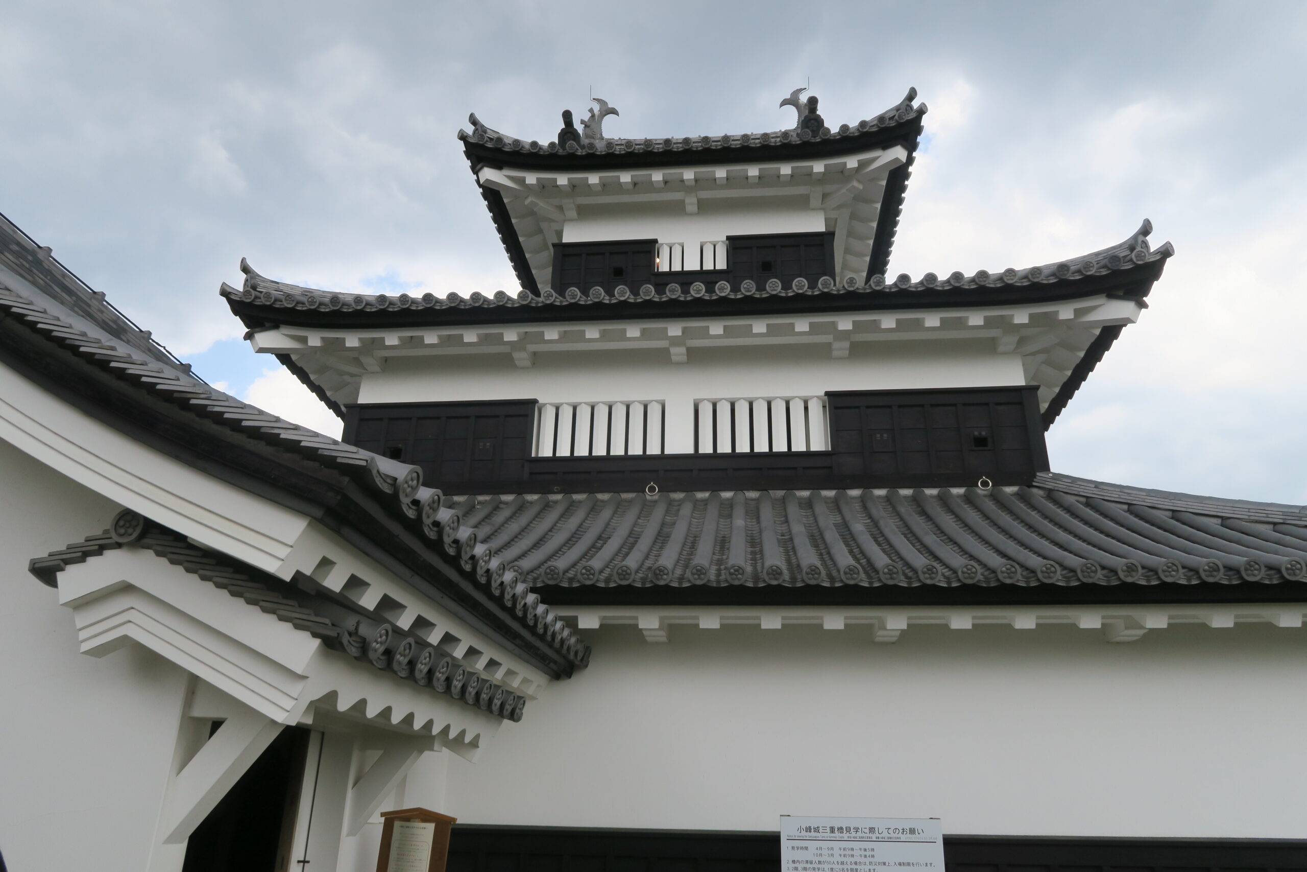三重櫓は、本丸の北東隅に建つ三層三階の櫓で小峰城のシンボルです。外観はそれぞれの階の半分を板張りとする「下見板張り」で耐久性が高いとされます。天守の代用の櫓で中は急な階段を上って最上階から白河市街を見渡せますが、中はとても小さいです。