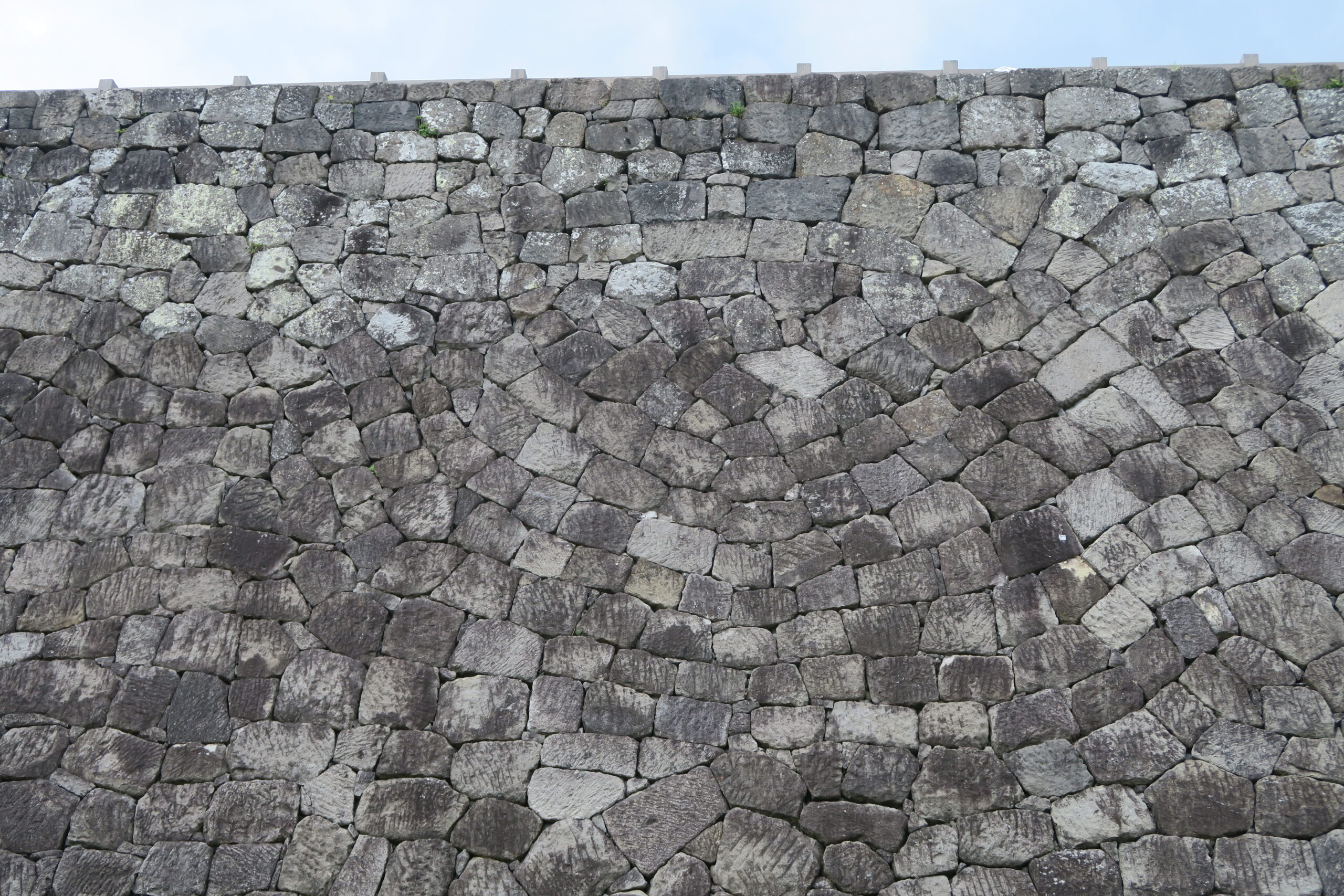 本丸の高石垣には遊び心あふれる半同心円状に石垣を斜めに積んだ「落とし積み」の石垣が見られます。