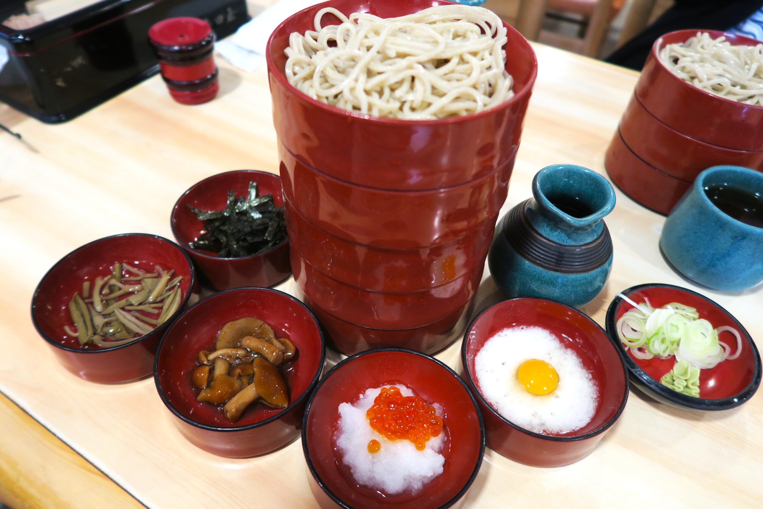 白河そばを代表するメニューが割子そば。出雲の割子そばと違い、山菜やイクラ、とろろやなめこなど、具材も小分けにされて提供されるところです。小分けのそば皿に小分けの具材を一つずつ入れて、味の違いやそばの具材のバランスを楽しみながら味わえます。本日の具材は、海苔、とろろとうずら卵、イクラと大根おろし、しいたけとなめ茸、ジュンサイの5種でした。