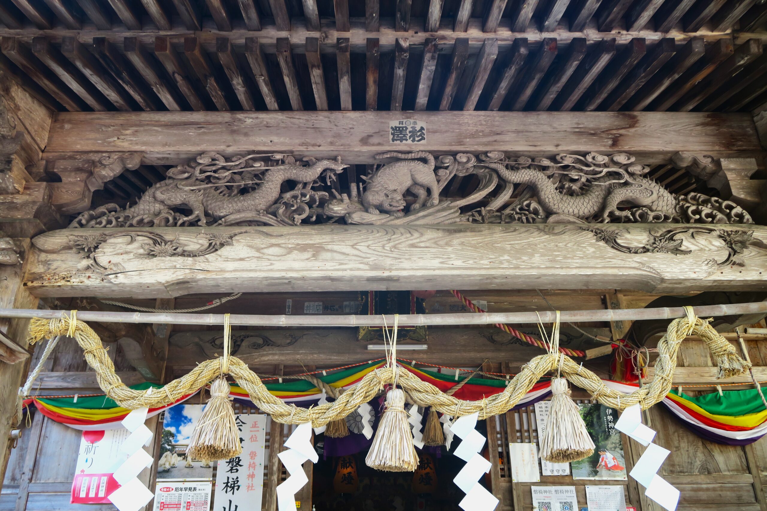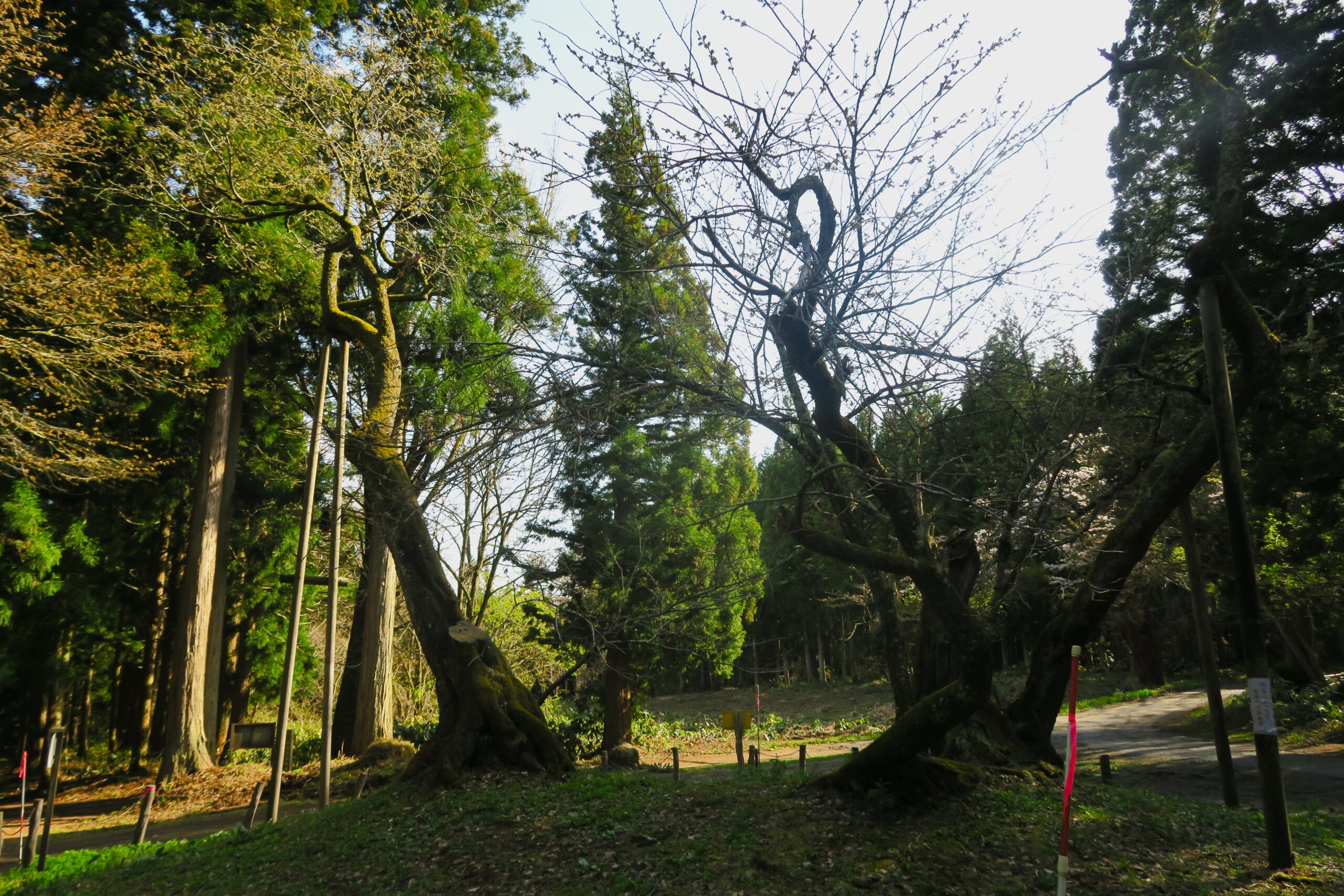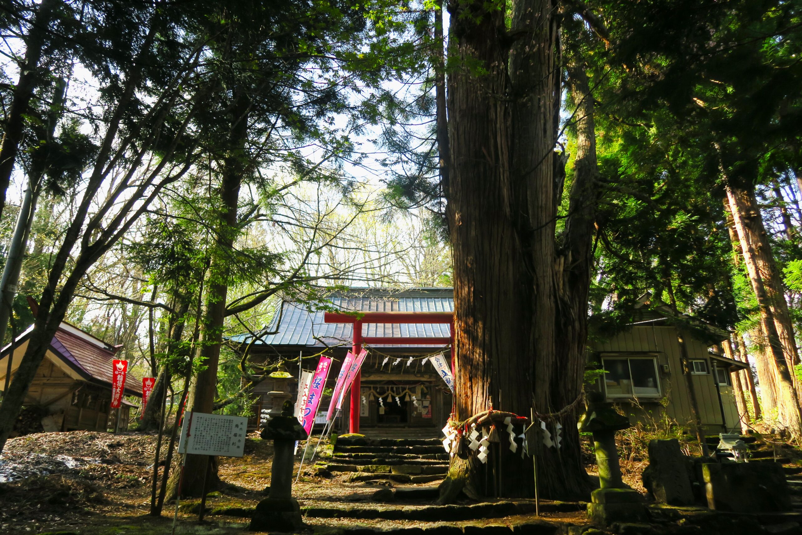 入口付近に植えられた「大鹿桜」は天暦元年(947)に村上天皇の勅使が奉納したと伝わるサトザクラの一種で、散り際に花が鹿の毛色に変化することから名付けられました。標高580mの磐椅神社境内にあるため開花が遅く見ごろは5月上旬から中旬頃のこと、長く咲くことから「翁桜」とも呼ばれます。