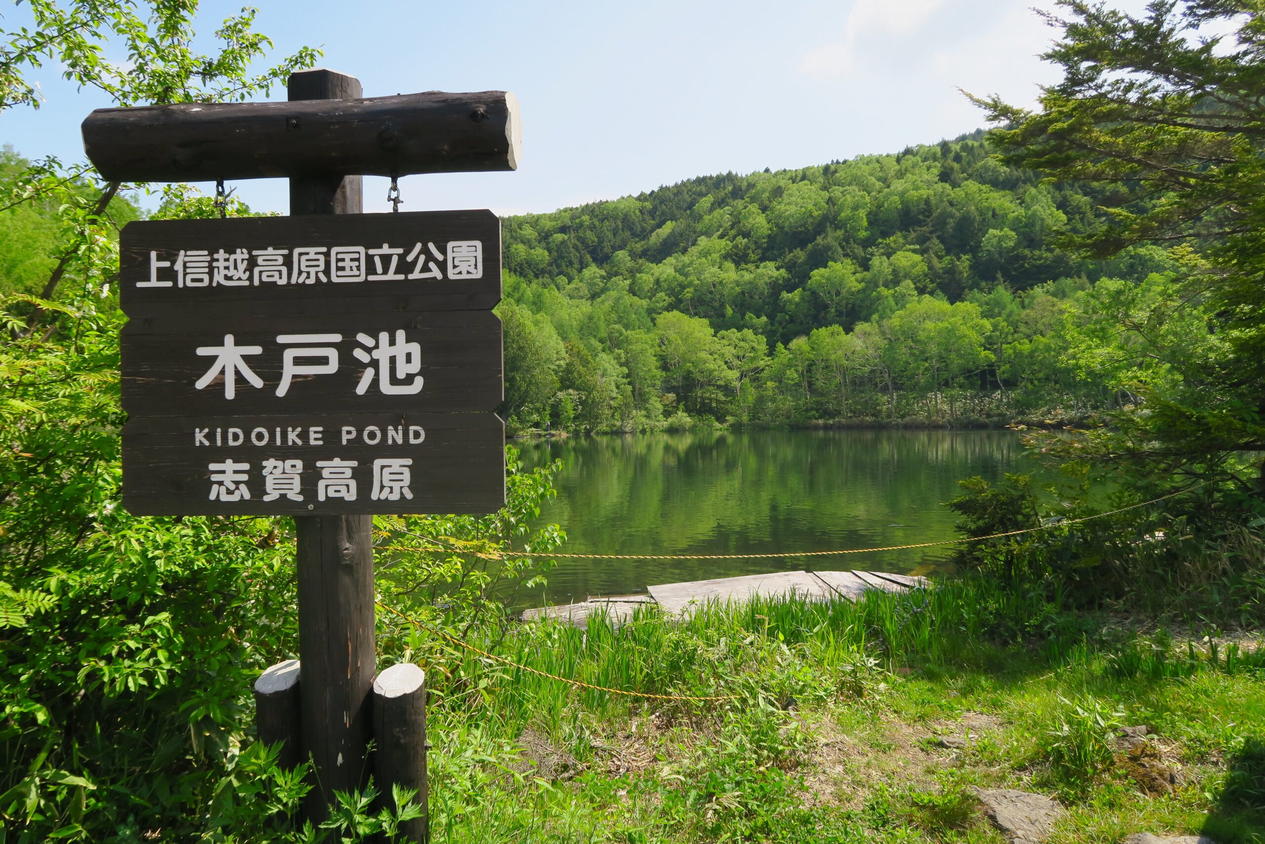 出発地点の木戸池までバスに乗って向かいます。志賀高原山の駅発渋峠行9:01発のバスに乗って所要時間7分で木戸池バス停に到着します。木戸池バス停横に木戸池温泉ホテルがあり、目の前に白樺やダケカンバの森に囲まれた「木戸池」があります。