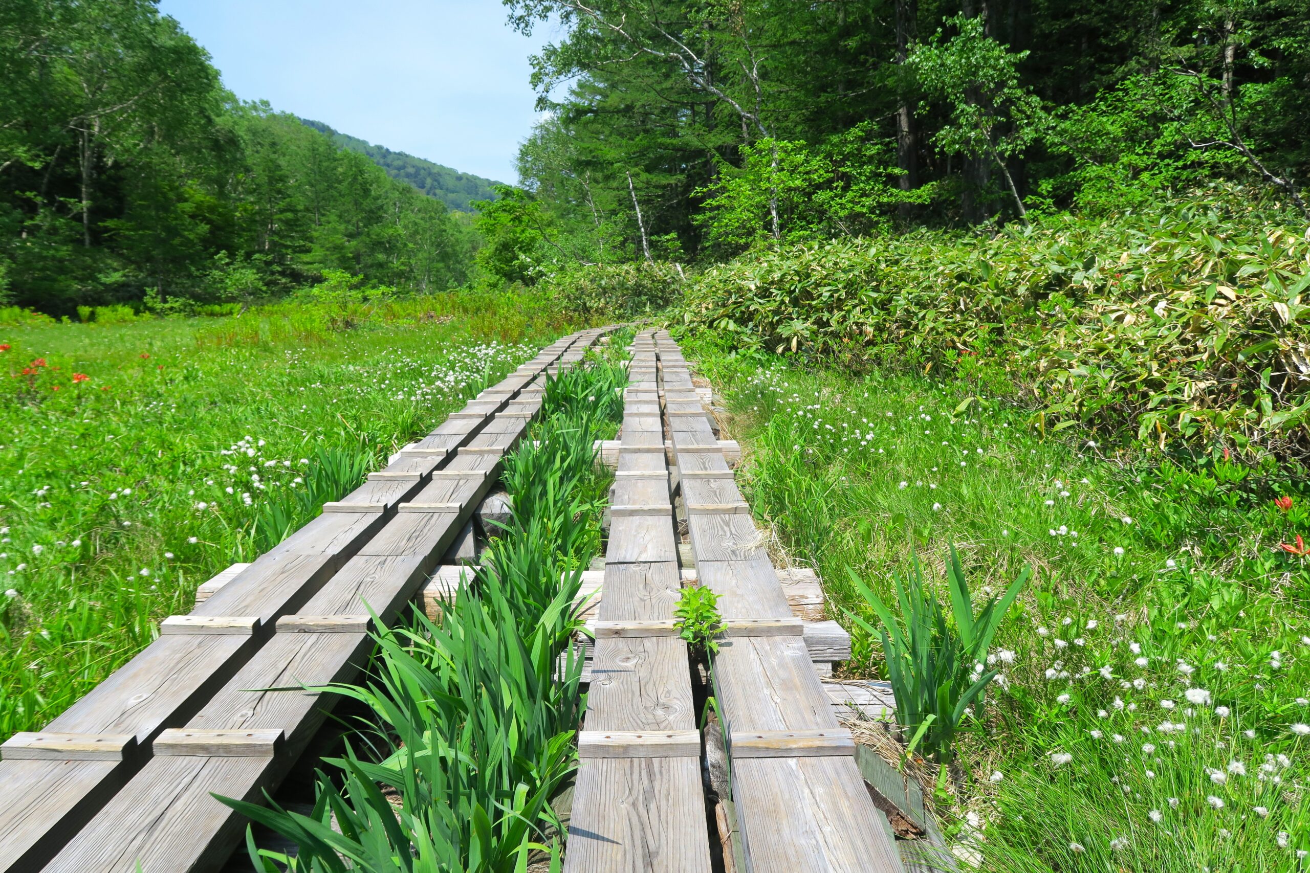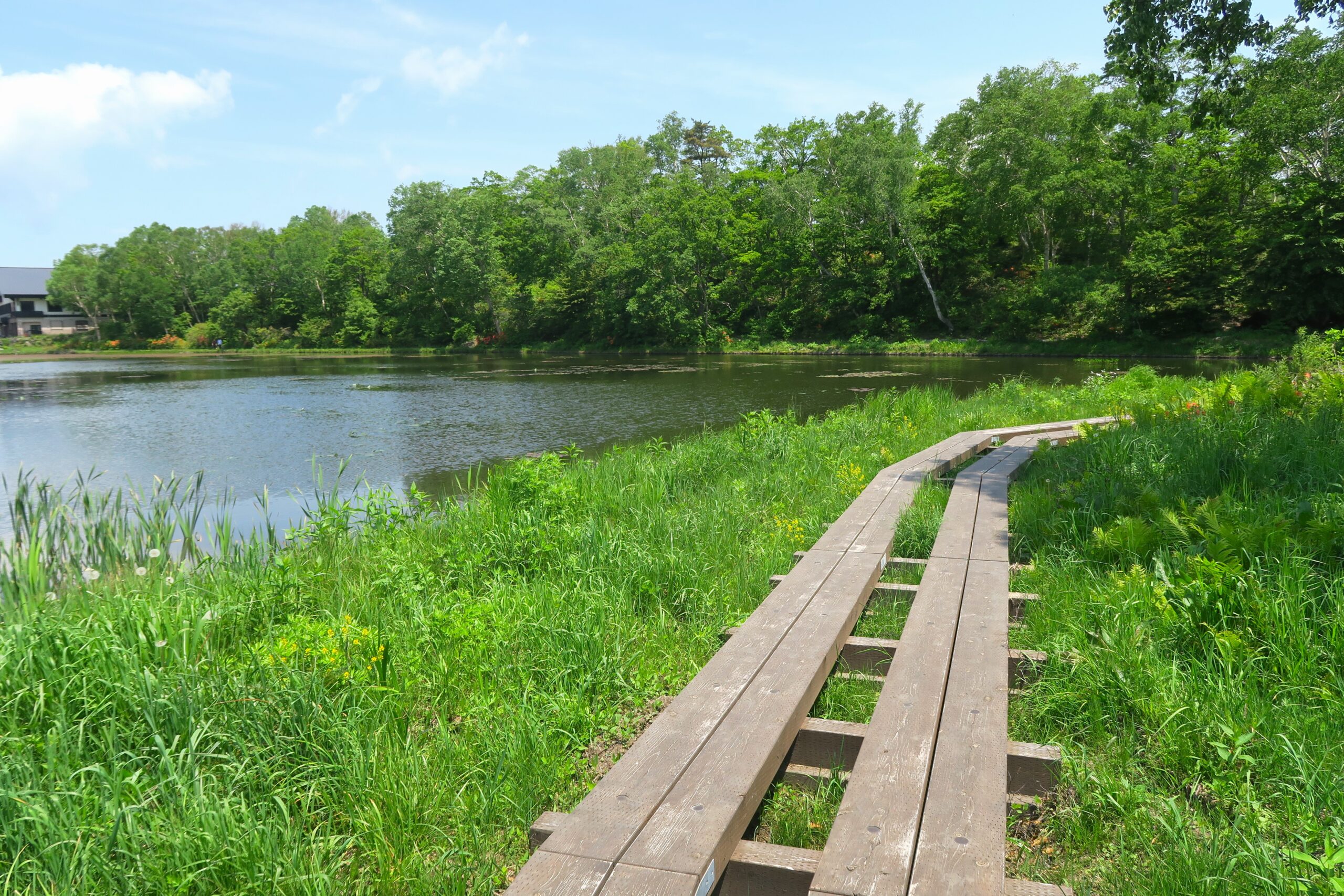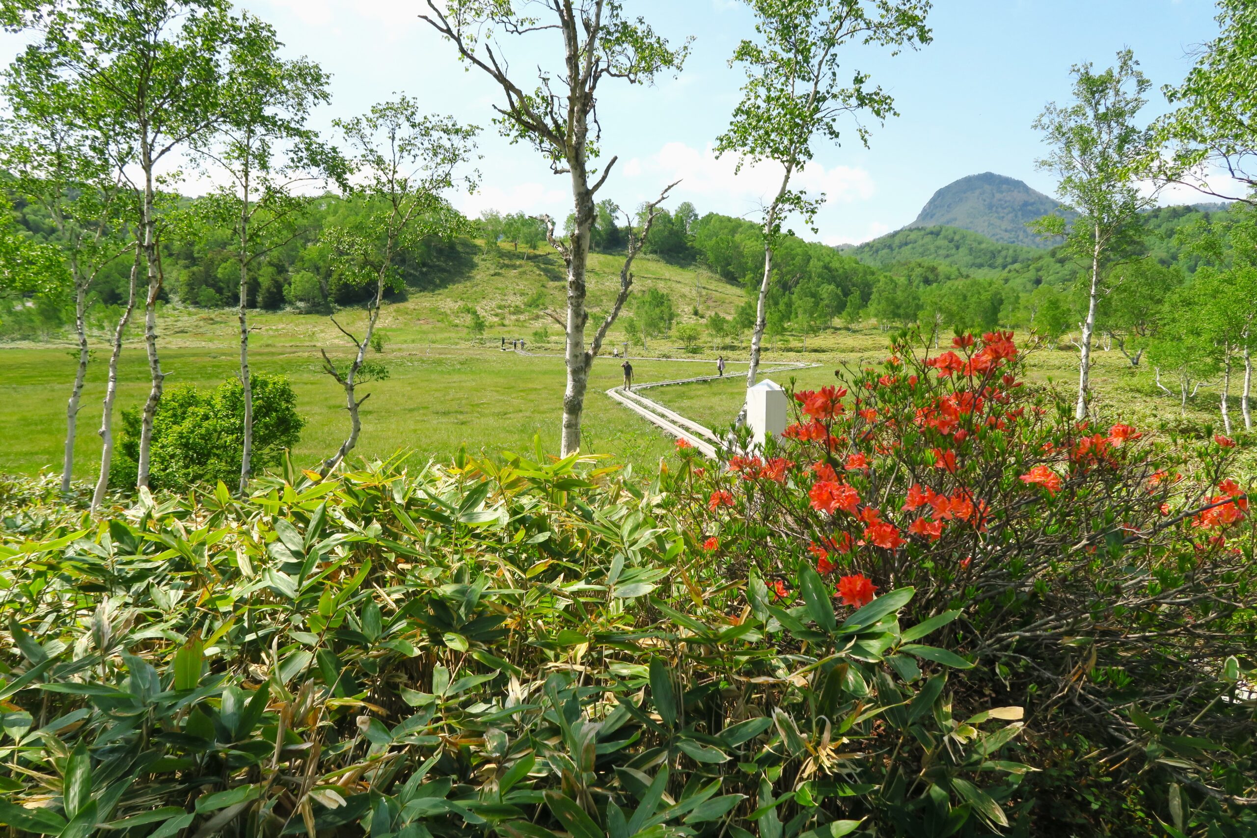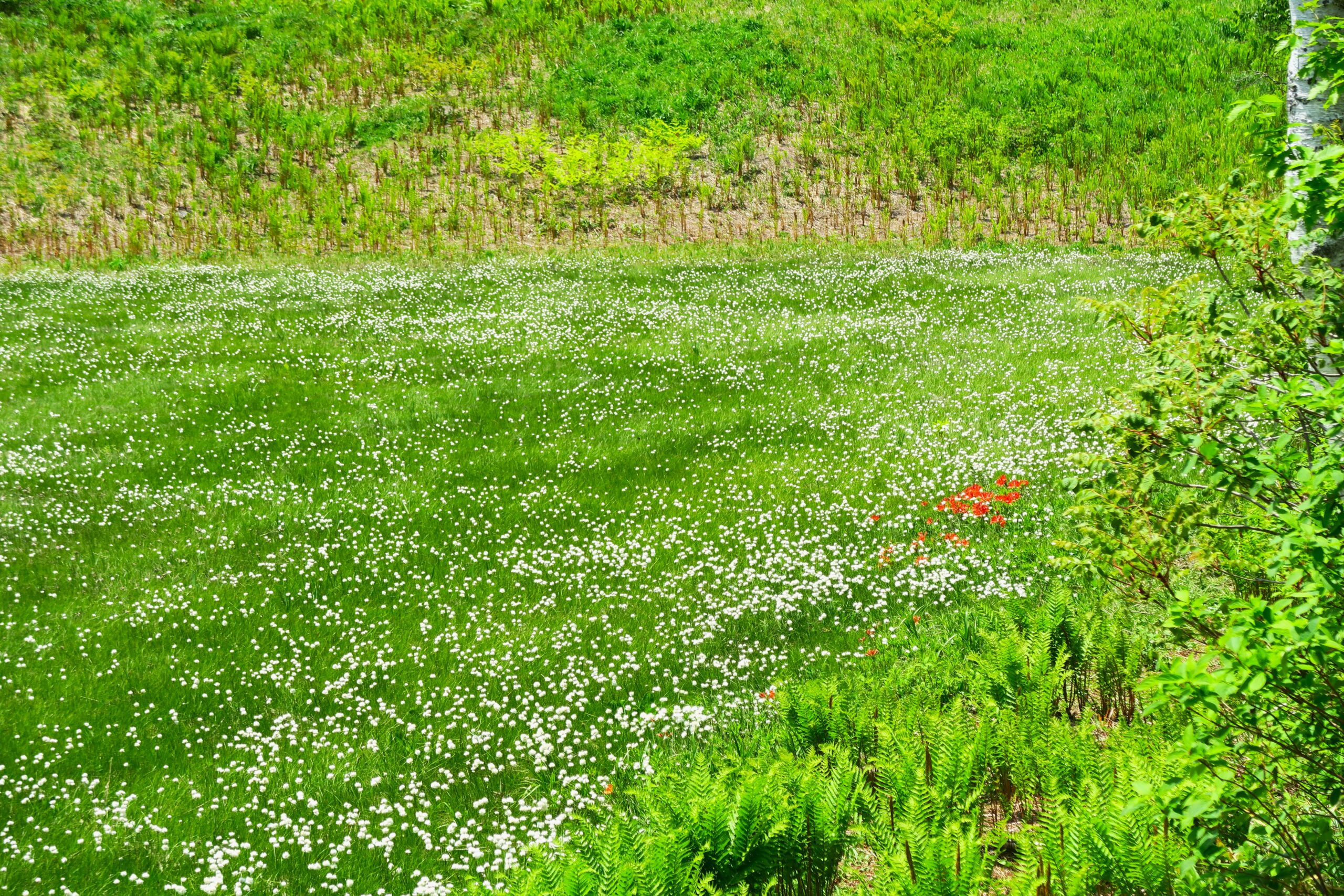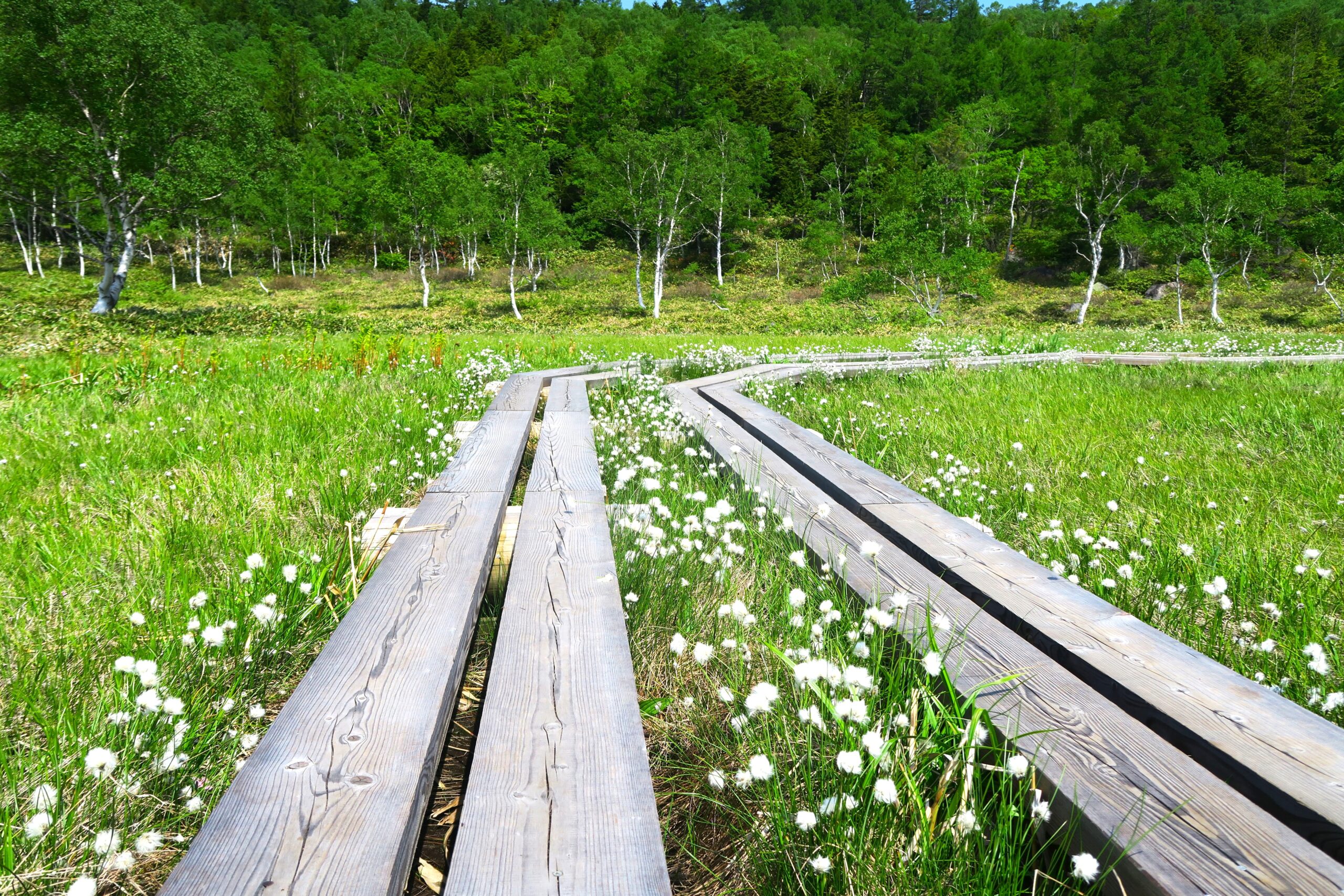 湿原の緑とシラカバのコントラストが美しく、また四季ごとにさまざまな花が咲きますが、初夏6月下旬から7月上旬にかけて、白くフワフワとしたワタスゲの果穂が一面に群生しています。整備された木道の間からものぞく白綿帽子をかぶったようなワタスゲの中を木道に沿って歩いていると雲の上を歩いているかのような気分です。