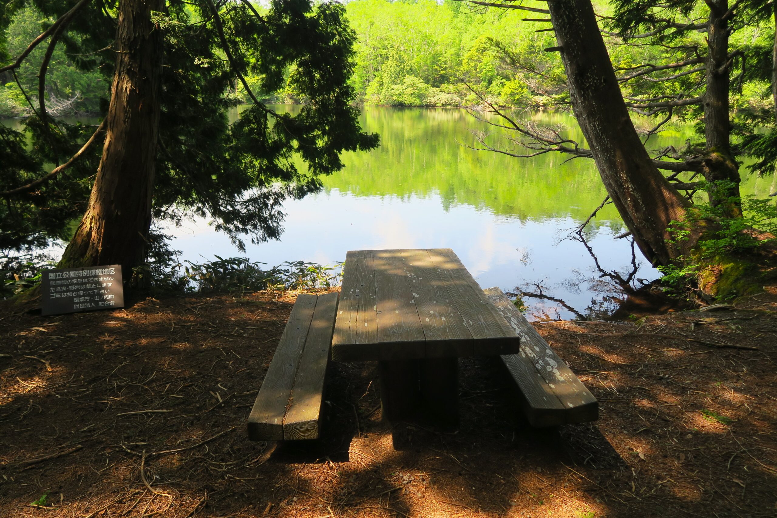 田ノ原湿原からまたひとピークを越して、車道を渡り900m先の長池を目指します。途中にある「三角池(ミスマイケ)」は、標高1630m、深さ8.5m、透明度7m、PH4.4の腐植栄養型湖沼で酸性度が高いため水中生物が少ない。ここからが特別保護区になり、周囲を見渡すと先ほどまでの明るいダケカンバの林から一変、巨木が根を生やす亜高山帯に属する樹林に被われます。池畔は浅根性で日当たりを好むコメツガ、クロベ、アズマシャクナゲの群落が繁茂しています。太古の記憶を宿す原生林の力強い芽吹きの鮮やかな緑が湖面に映り幻想的です。これこそが本来の志賀高原の姿で、ベンチもあるので少し休憩しながら太古に想いをはせます。