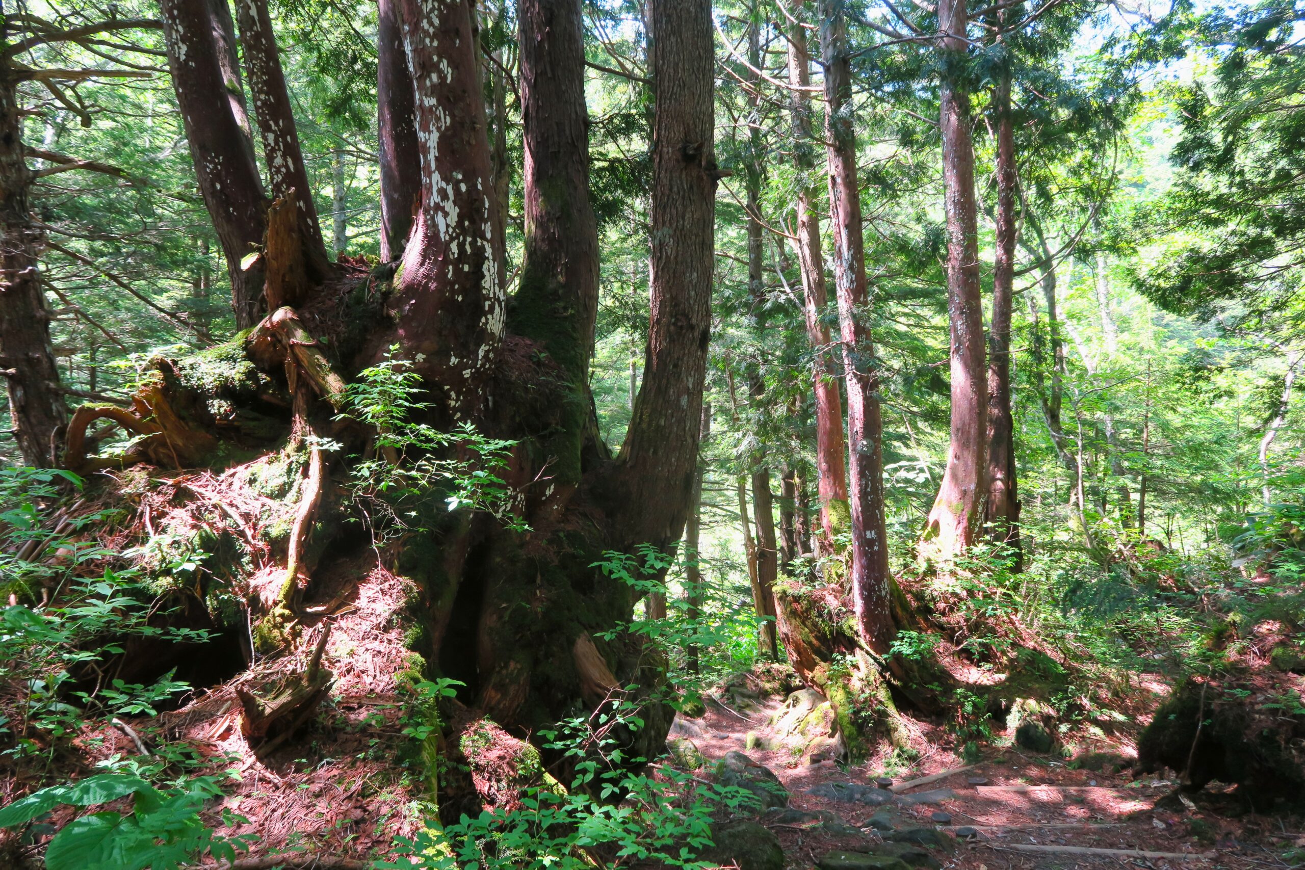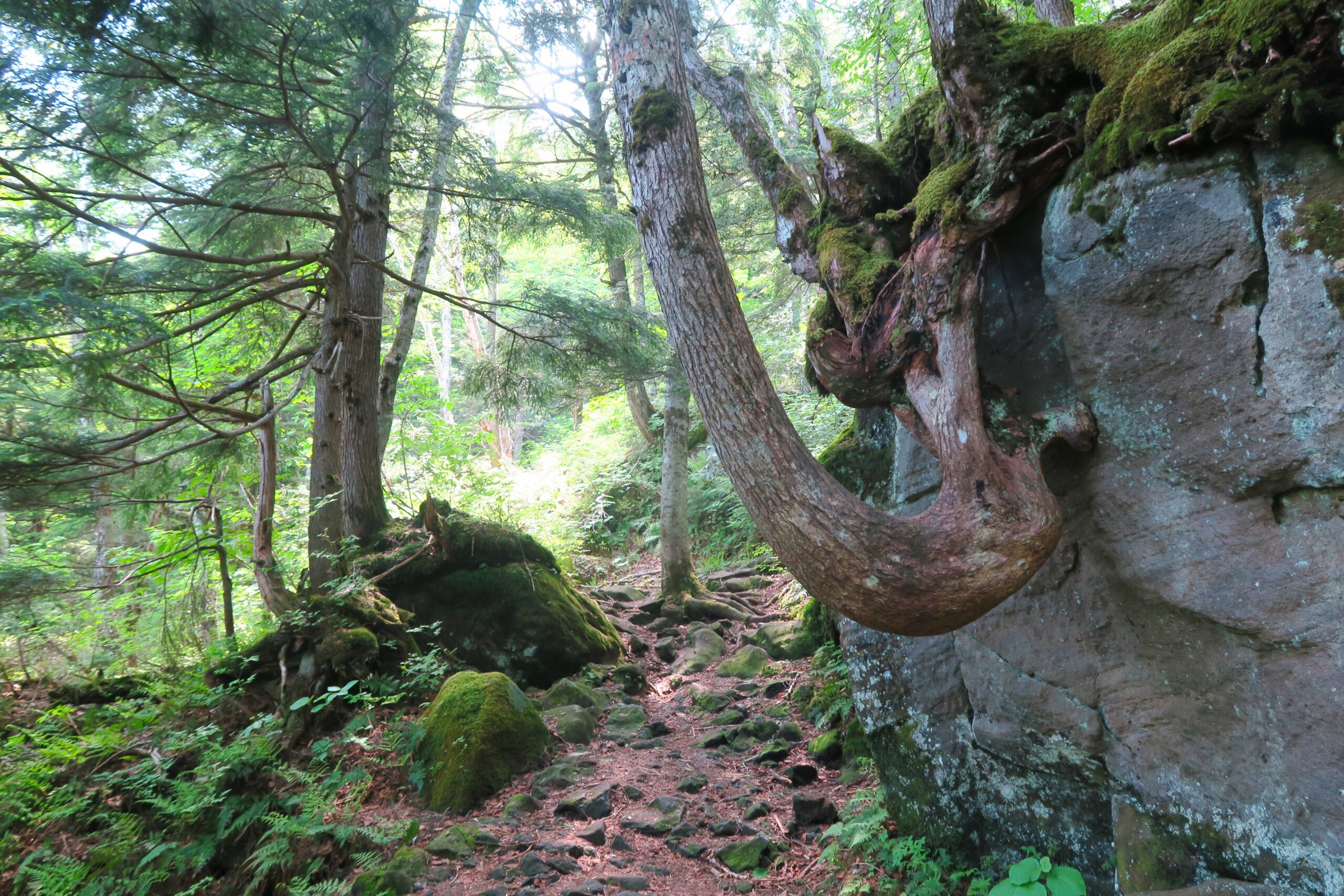 三角池から長池までは、腐敗した倒木の上に次世代の若木が育つ「倒木更新」が多く見られます。針葉樹の森では複雑な形をした「倒木更新」が多く見られ、注目スポットの根上りの木が目の前に立ちはだかります。地元の子どもたちから「ゾウさんの木」と呼ばれるコメツガの木は、岩の上に成長し、雪の重みで象の鼻のように下向きに伸びた幹が光を求めて上向きに枝を伸ばしています。
