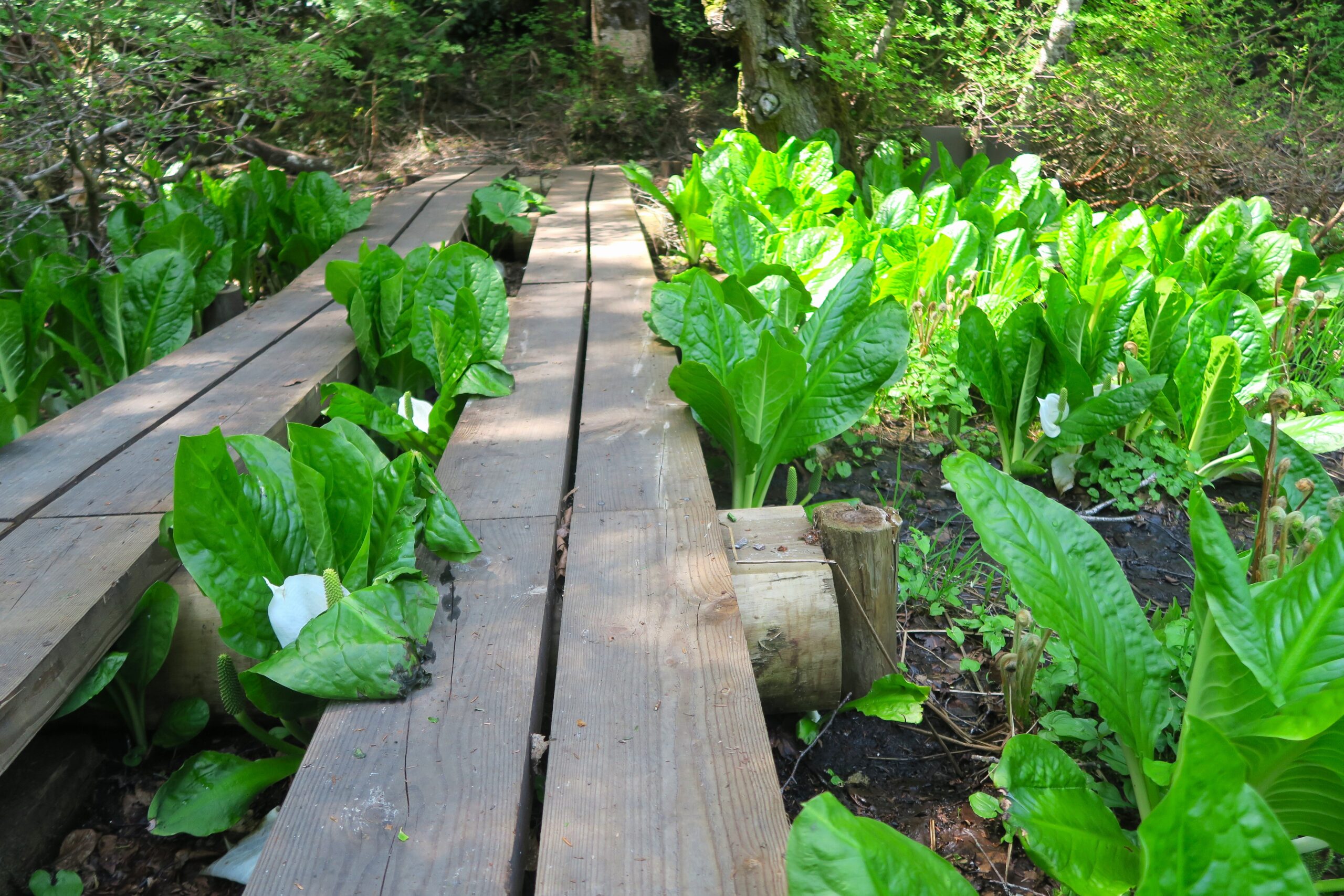 蓮池方面に下っていく途中、クロベ、コメツガの原生林の中に突然小さな湿原が現れます。標高1600mにある日影湿原で、湿原の周囲には水路があり、そのためミズバショウがよく育っています。