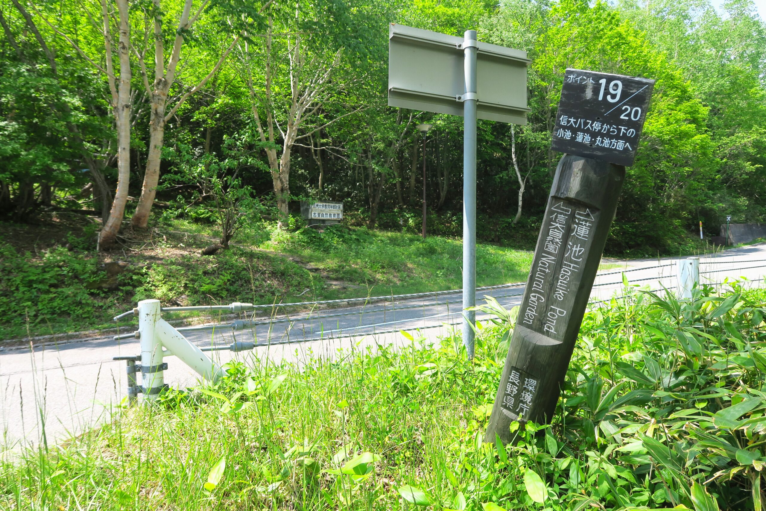 一帯は志賀山の噴火でできた国内で類例がない渦巻状溶岩流で、南には複雑な地形で一度迷うとなかなか出られないとされる「おたの申す平」が広がります。そのおたの申す平の展望ができる原生林の「まが玉の丘コース」までここから3.5kmの自然観察路になっているのですが、かなり急なところもあるので体力に自信がないのでまたの機会にしておきます。信州大学自然教育園の入口から再び車道を渡ります。