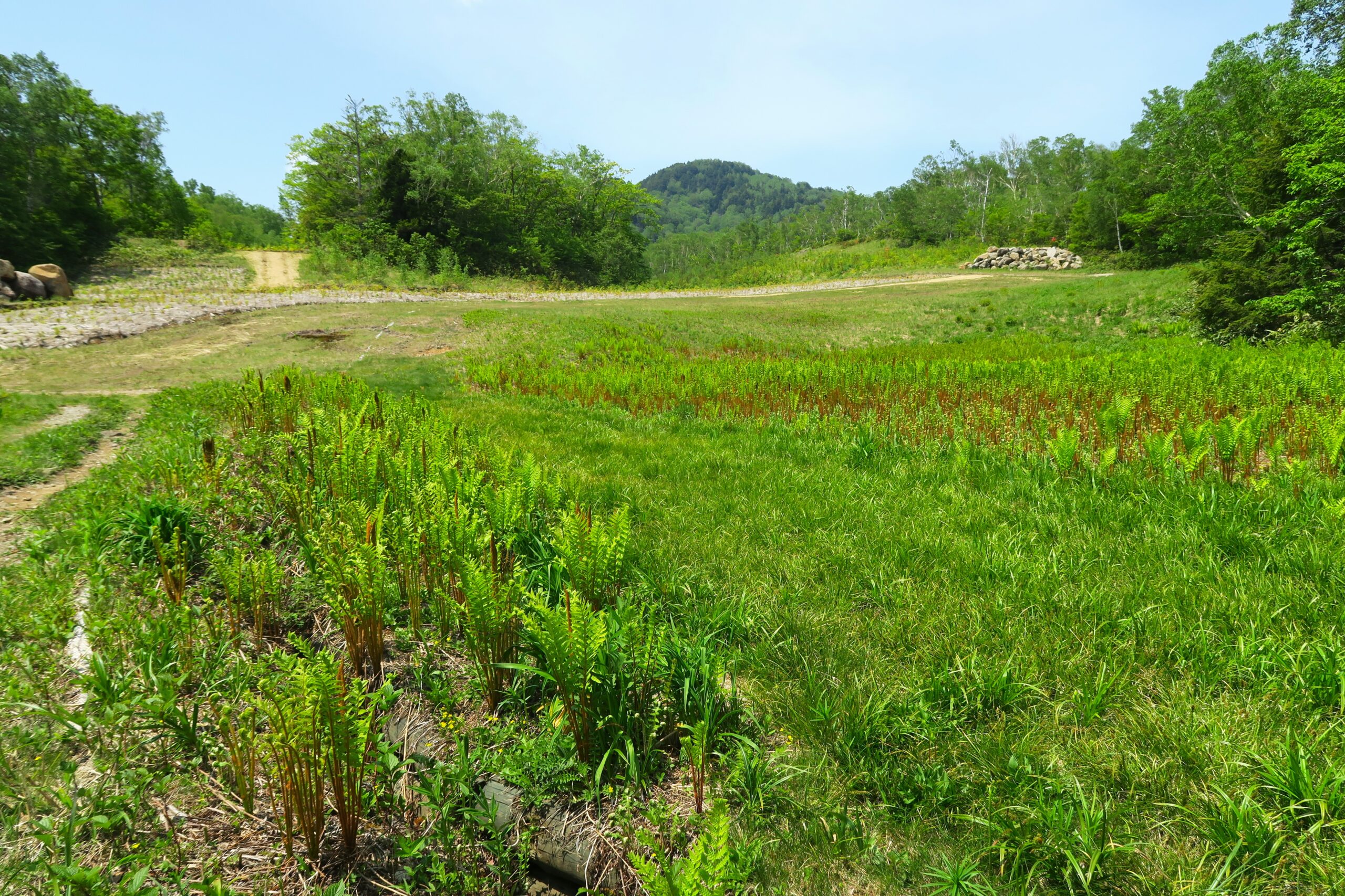 ホテルと木戸池の間から約20分、池を半周し、木戸池スキー場のピークをひとつ越したところに解放感あふれる広々とした「田ノ原湿原」が現れます。標高1620mに位置し、約5万年前の太古の昔、志賀山の噴火によって流れた溶岩が幕岩近くで角間川を堰き止めて造った旧志賀湖の湖底に発達した志賀高原で一番広い高層湿原。江戸時代、松代藩士の佐久間象山が開田研究をしたことにちなんでその名があります。
