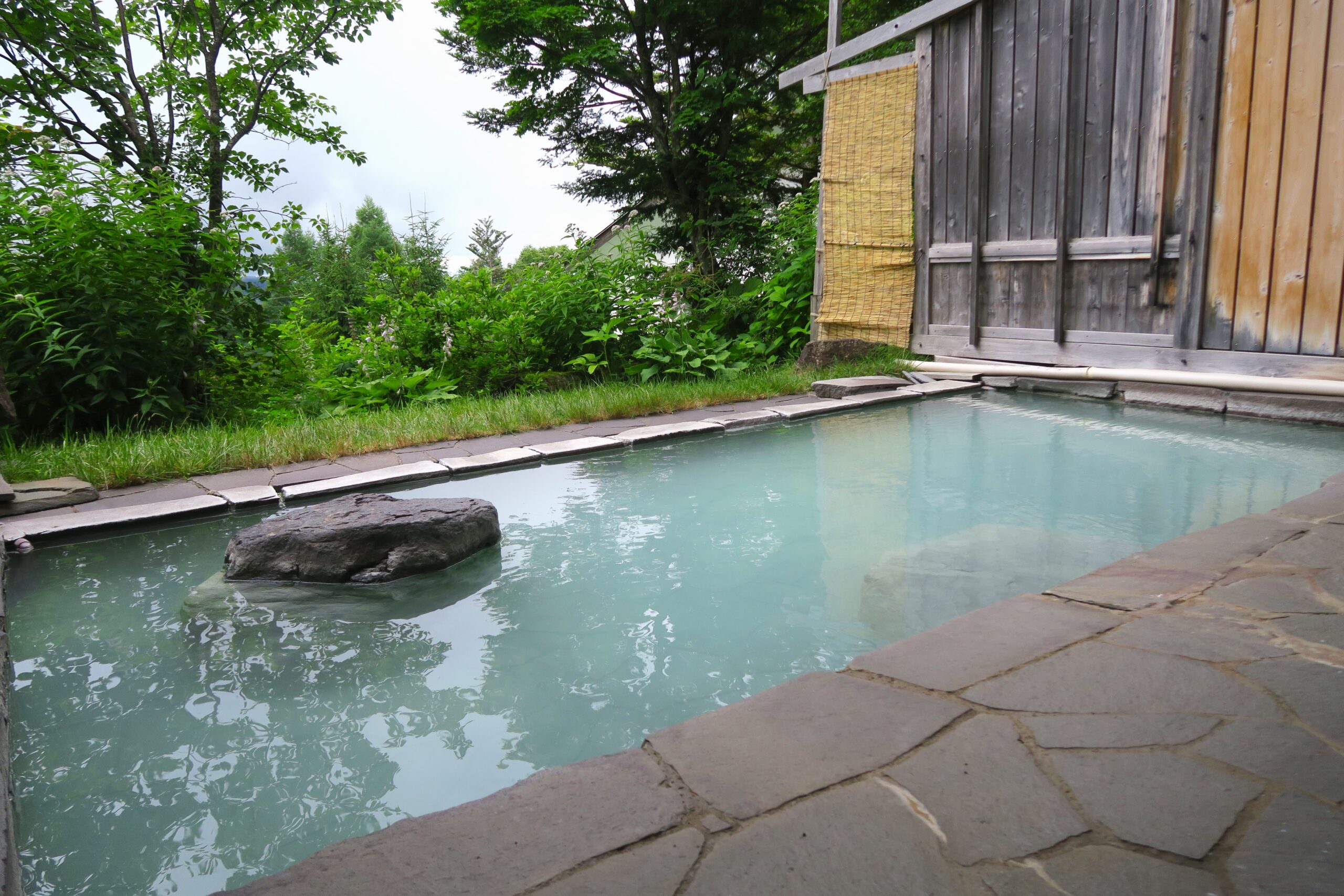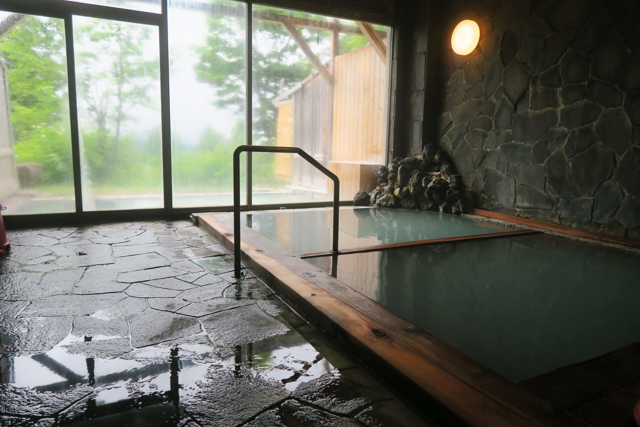 温泉はお隣の奥山田温泉「セルバン白雲館」で極上の白濁湯に身を鎮めます。牛がのんびり草を食べている牧場風景を見ることができる一風変わったロケーションの標高1500mの山田牧場に建つ高原のホテルです。内湯・露天風呂とも男女各一つずつ、計4つの浴槽があります。源泉かけ流しの湯が浴槽にあふれ、内湯は熱湯とぬる湯の二槽に仕切られています。