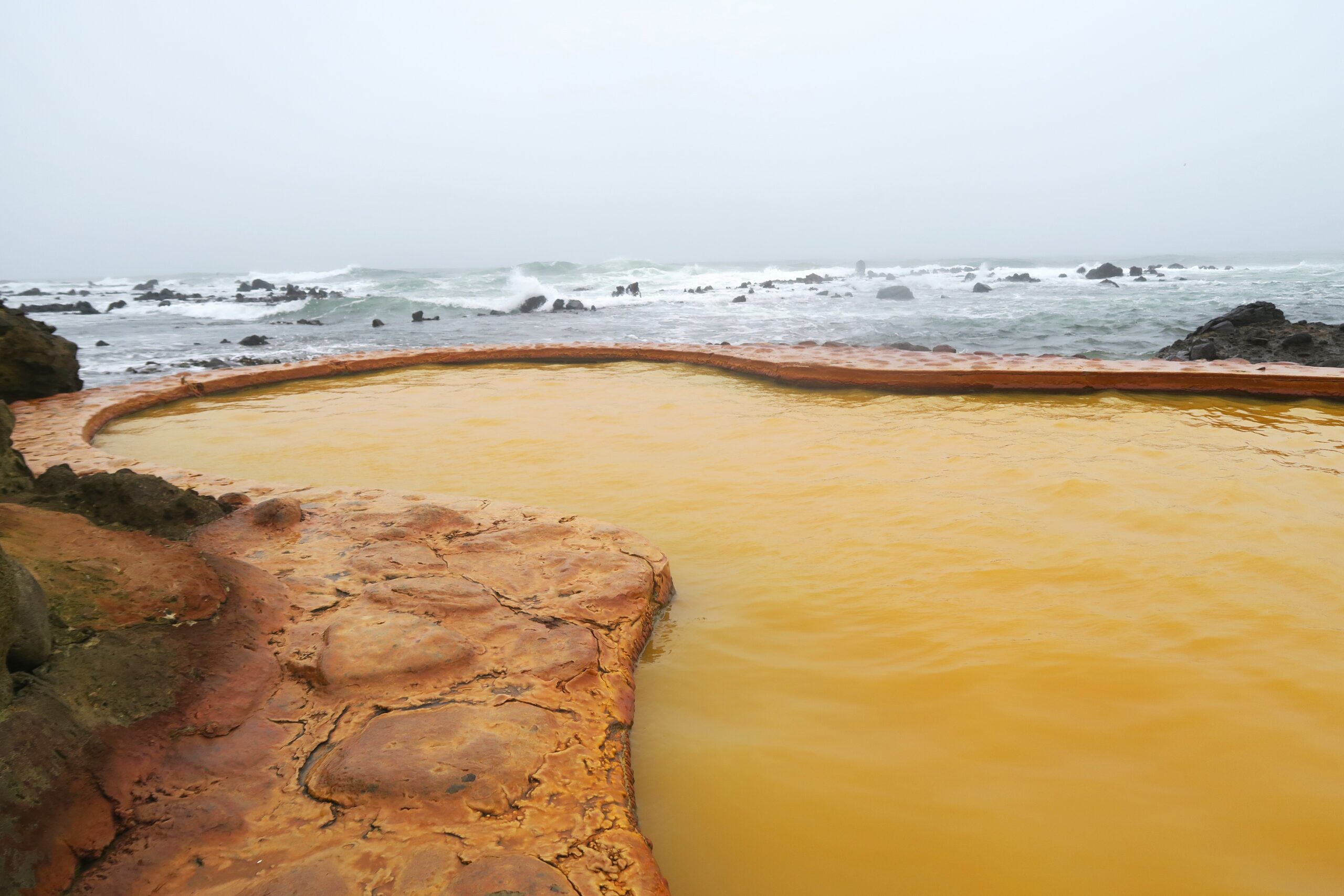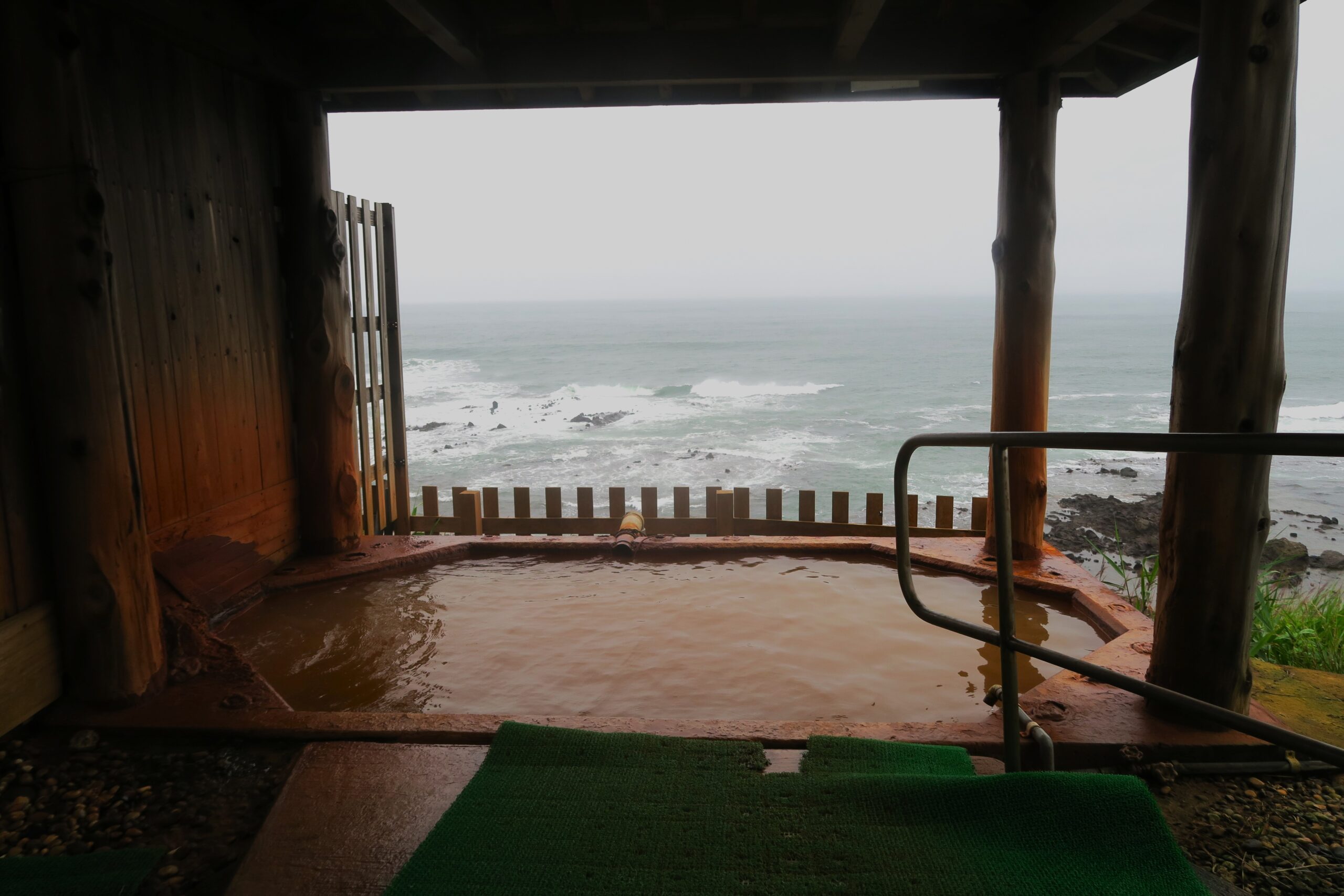最近は湯の質よりもビジュアルで話題になることが多く、眼前に迫る海は手が届きそうなくらいに近く、そのまま岩場へ下りて磯遊びをしたくなる距離感です。女性は湯浴み着をまとえば混浴の露天風呂にドボンと浸かることができ入ってしまえば15cm下の深さが見えないくらいの濃厚なにごり具合です。やはり一段高い女性専用露天風呂よりも海を間近に感じることができます。男同士、女同士はもちろん、ご夫婦、カップルの男女で遠く水平線を眺めながら、湯に浸かれば時の経つのも忘れてしまいます。