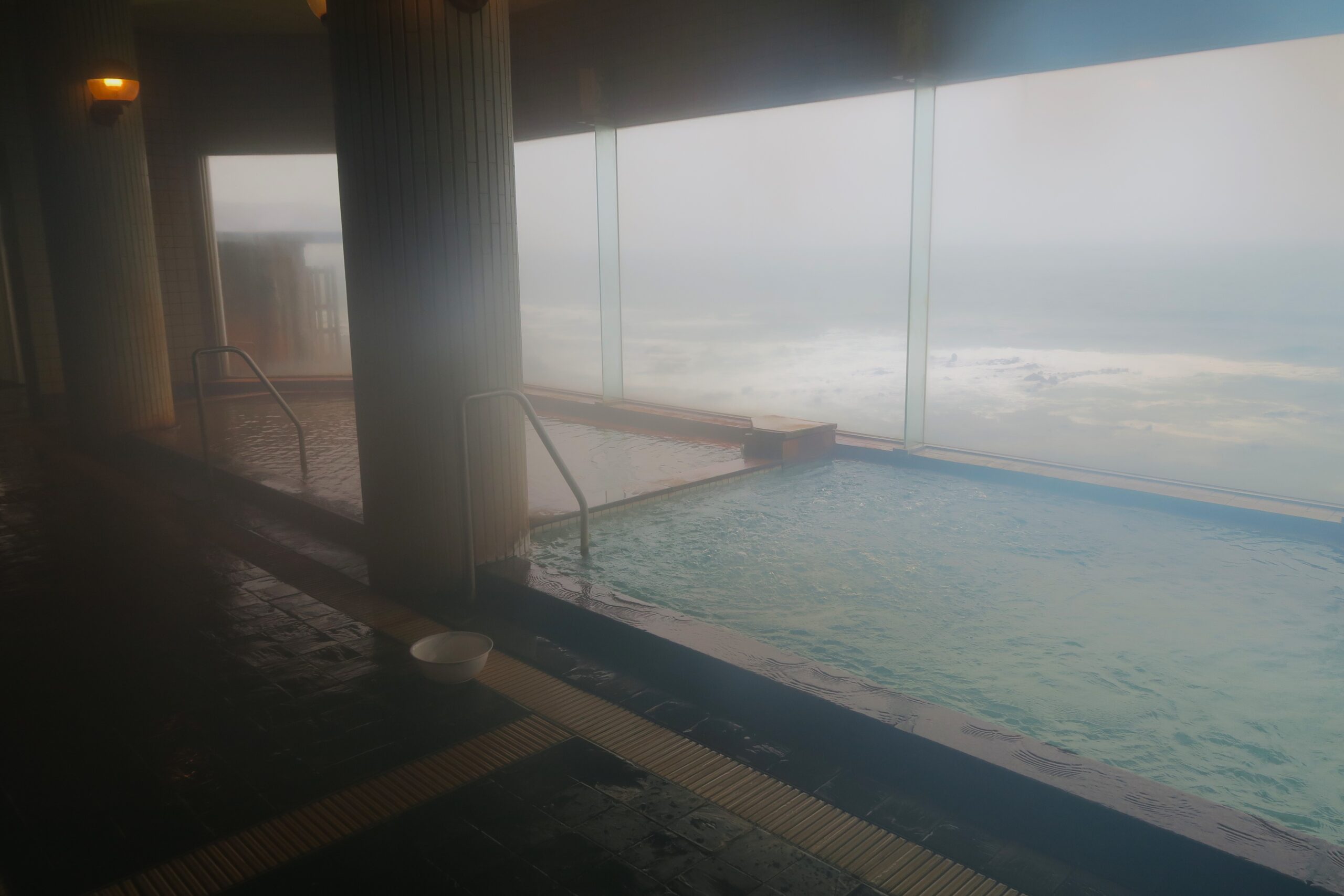 湯船に浸かりながら日本海を一望できる大迫力の内風呂は、源泉かけ流しの湯船と真水を沸かした白湯の湯船との二槽を備えています。大きなガラスが一面に設えてあって開放感ある空間を味わえます。