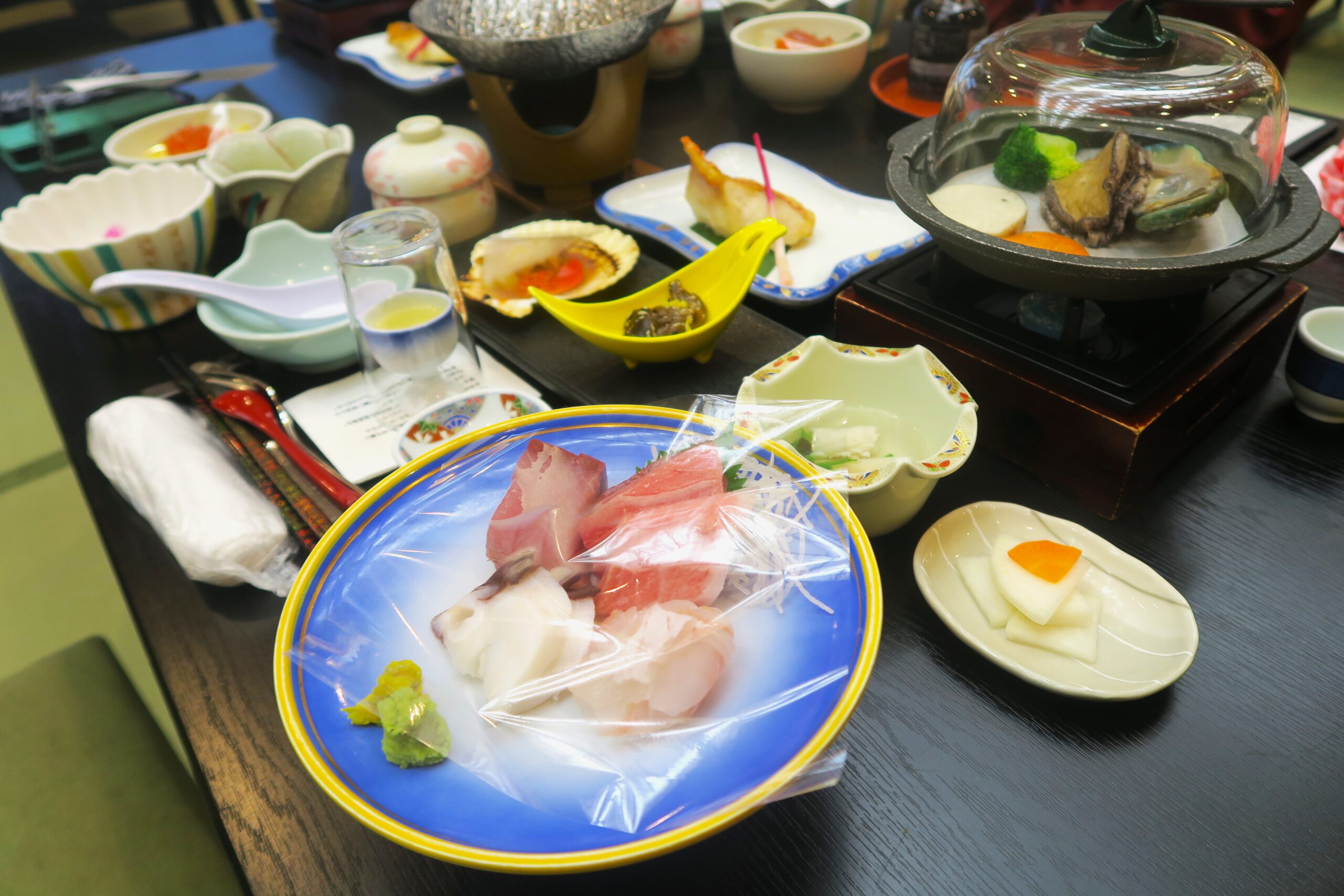 夕食は夕食会場「白神」でいただきます。近くの深浦産の海の食材が並びます。先付は深浦産ギバサ(あかもく)の五色和え、前菜に深浦産真鱈の煮たら子と奈良茸の子和え、焼き物はキンキン塩焼き、強肴は活鮑の踊り焼き、つがる風茶碗蒸し(栗の甘露煮を使用した甘めの津軽の茶碗蒸し)、深浦産恵胡天の酢の物、県産つがるロマンのいくらご飯、深浦産つるつるわかめ汁、デザートはふかうら雪人参アイスと深浦産づくしです。