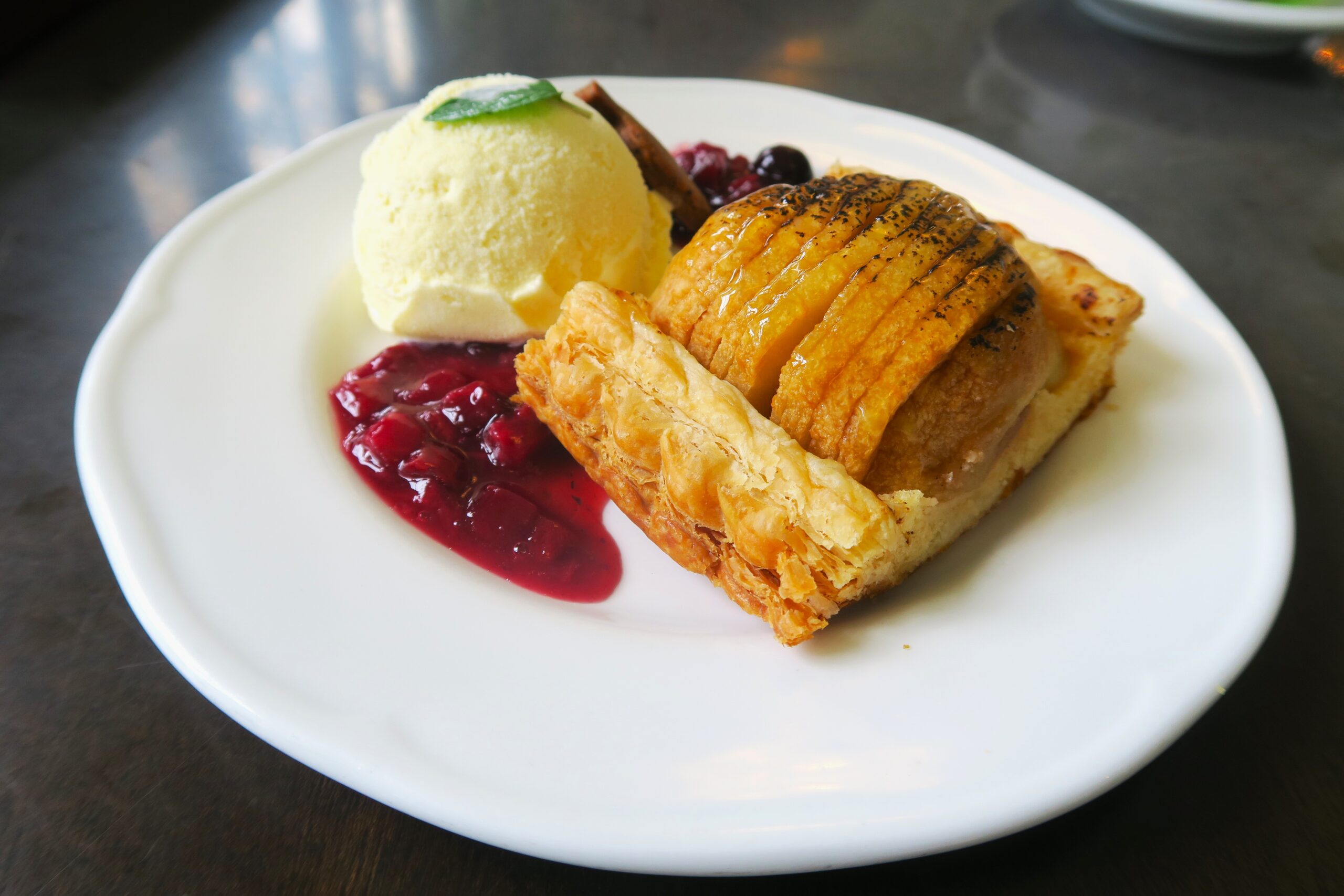 写真は生地からすべて手作りにこだわる老舗店「ジャルダン」のアップルパイ。さわやかな甘酸っぱさが人気の希少品種“紅玉”を使用したやわらかな煮リンゴとバター香るやさしい甘さのパイがマッチしています。