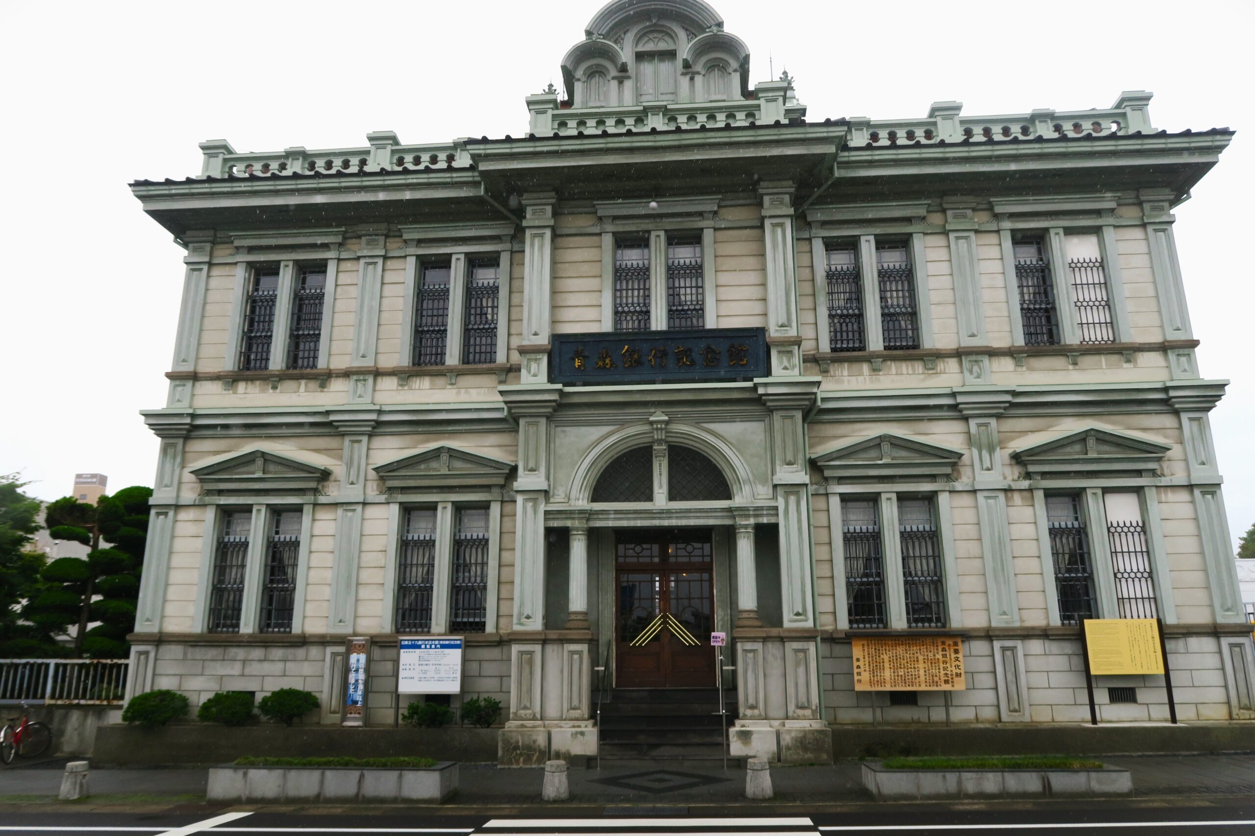 裁判所の先には青森県初の銀行第五十九銀行の本店として明治37年(1904)、堀江佐吉が晩年59歳のときに設計施工した「旧第五十九銀行本店本館(青森銀行記念館)」があります。木造2階建てルネサンス風建築でシンメトリーな外観が調和よく建てられています。洋風ですが、外壁を張り瓦の上に漆喰塗りにするなど、構造は堅固な土蔵造りにし、防火や防犯に対する配慮がなされ和洋折衷の趣です。外壁は漆喰の明るいグレー、そして窓枠や柱の淡いペパーミントグリーンと屋根瓦の黒の対比が美しい。屋根に飾られたパラストレード(装飾欄干)、ドーマーウィンドー(屋根窓)や柱頭部分の装飾が、建物の景観を引き締め、銀行にふさわしい荘重さを感じさせます。展望台を兼ねた塔屋はこの建物の象徴のひとつです。