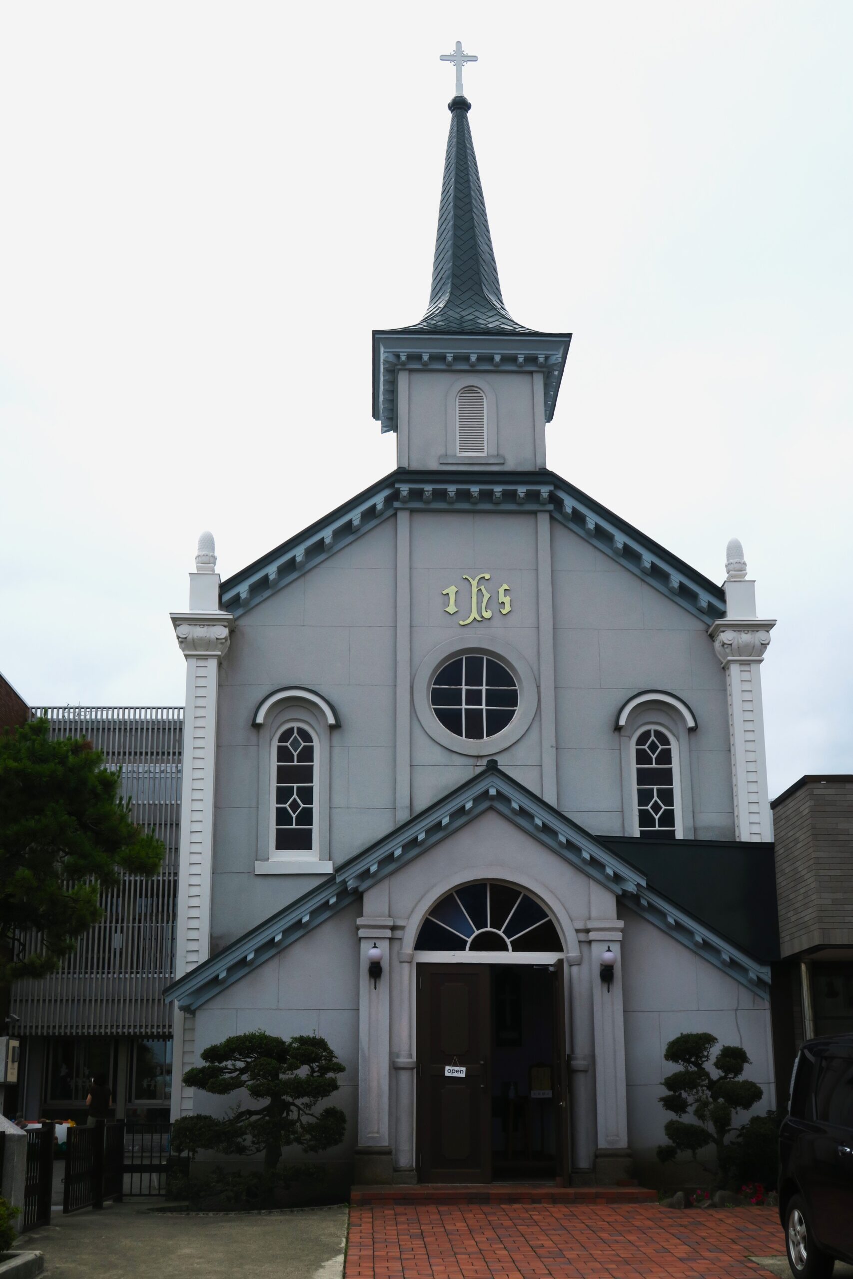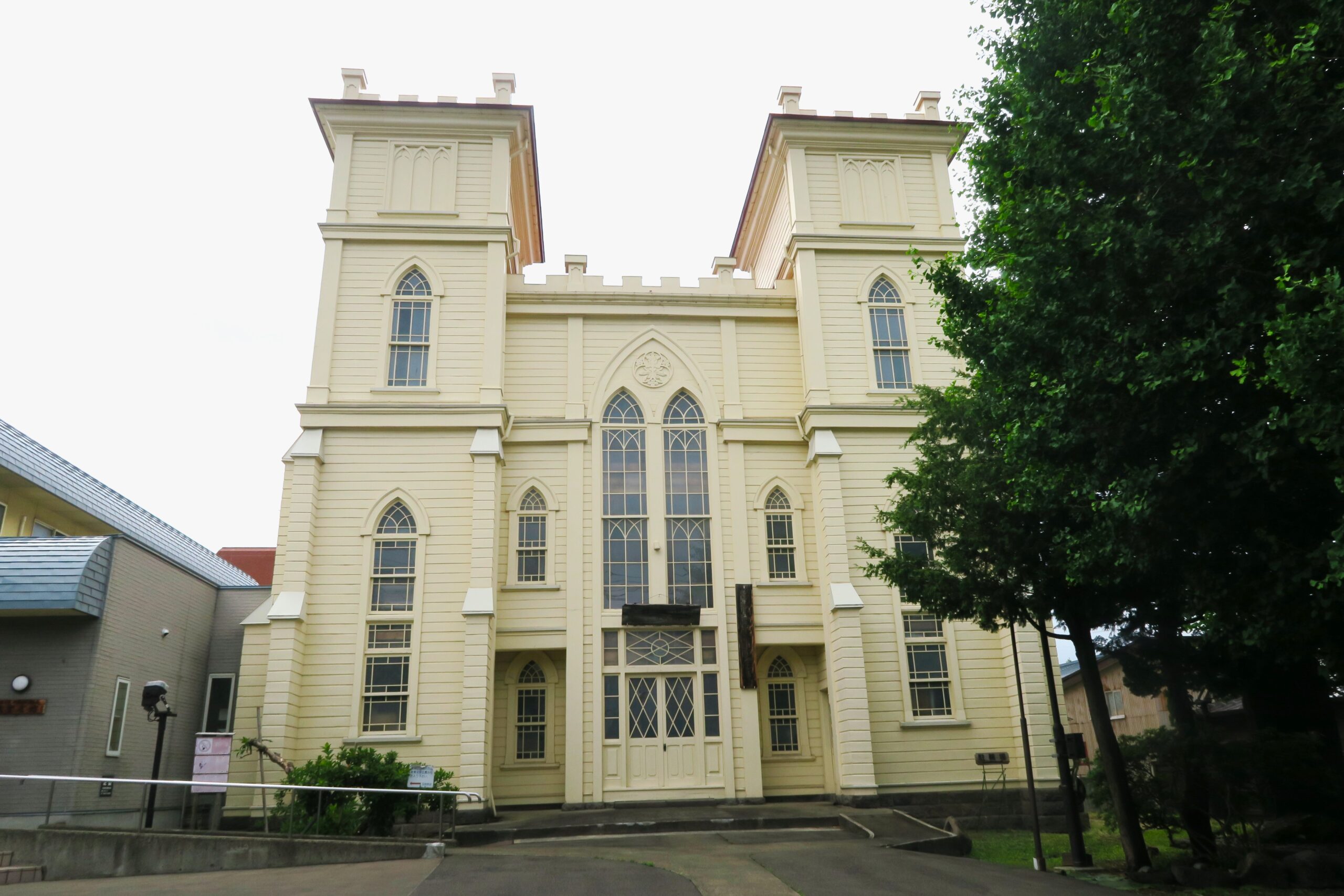 弘前城東門方向には二つの教会があります。「カトリック弘前教会」は、明治43年(1910)オージェ神父が設計し、堀江佐吉の弟である横山常吉の施工による当時、ヨーロッパで流行していた尖塔をもつロマネスク様式の木造モルタルの教会堂で、厚い壁に小さな窓が特徴的です。白を基調とした優美な建物と重厚な雰囲気を持つ祭壇とが美しく調和しています。慶応2年(1866)に制作されたというゴシック様式の祭壇は、高さ約8mにもおよぶもので、オランダ・アムステルダムの聖トマス教会にあったもので、当時の主任司祭、J・コールス神父が特別に譲り受けて、昭和14年(1939)帰任の際に持ち帰ったと伝わります。扉には津軽地方の伝統工芸「こぎん刺し」の白い十字架、壁には聖マリアの日本画が飾られています。カナダのカロン神父から贈られたステンドグラスには、岩木山、りんご、津軽三味線など弘前がまるごと描かれ、春分の日と秋分の日には、朝の6時半くらいにステンドグラスからの光がイエス様にあたり、とても美しいとのことです。