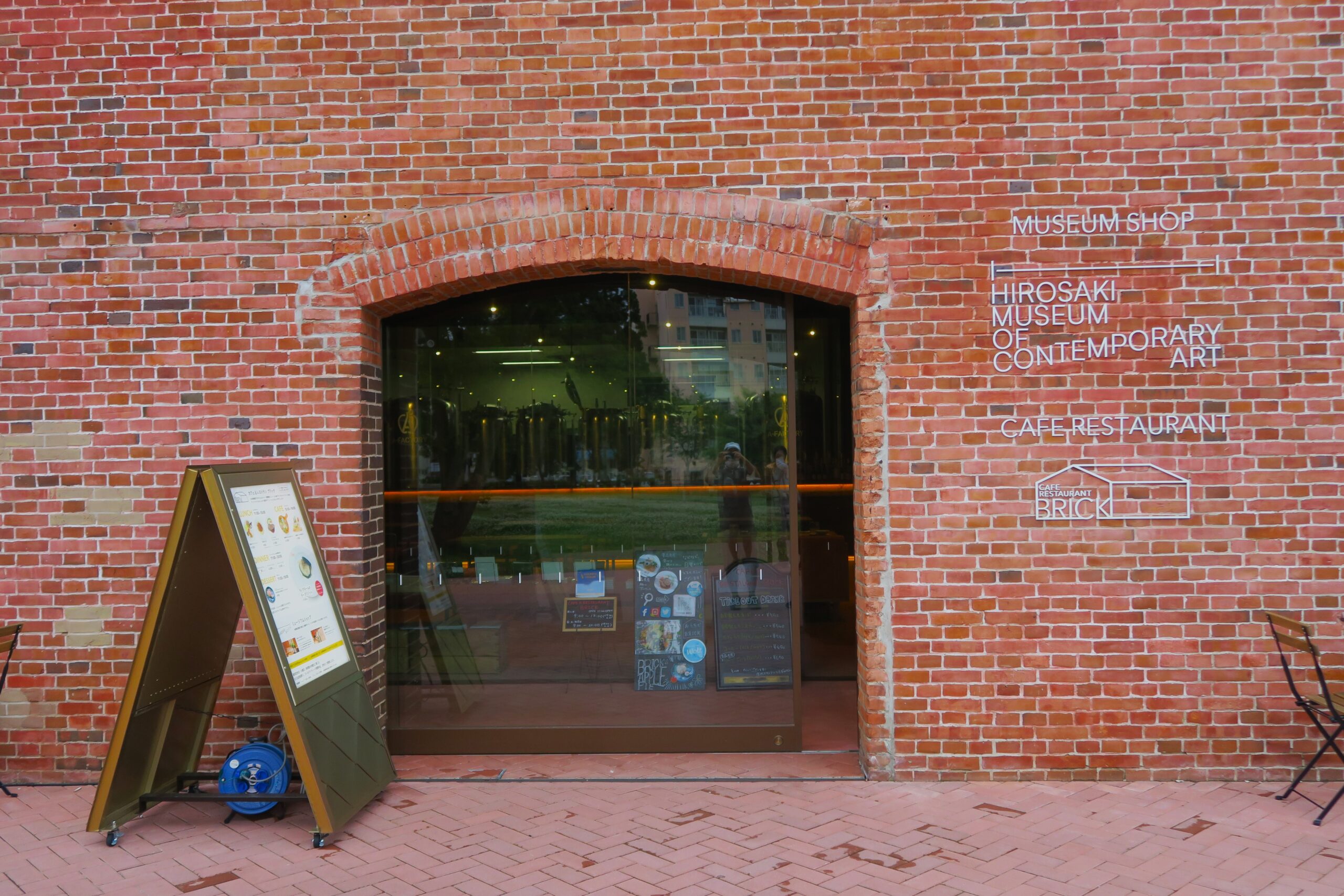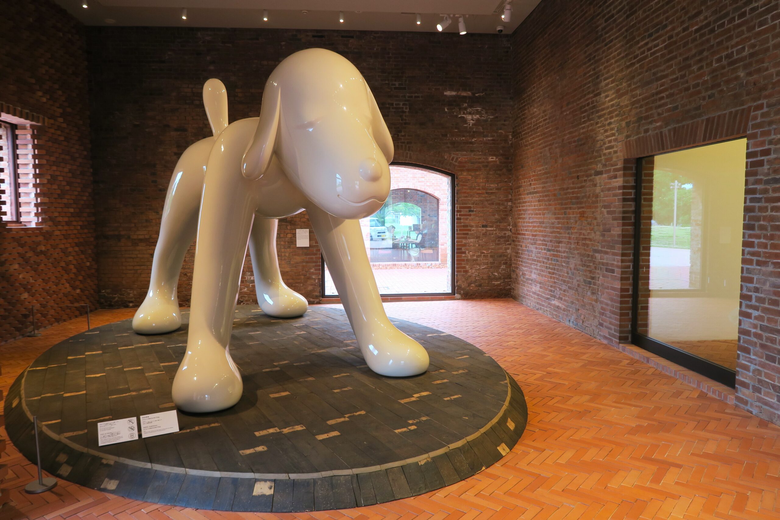 美術館として展示を行うミュージアム棟とシードル工房や物品の販売を行うカフェ・ショップ棟の二棟からなります。アーティストと地域の交流から生まれた作品を展示・収蔵するなど、年2階の企画展を中心に弘前ならではの現代アートが楽しめるミュージアム棟の入口では、真っ白な犬の彫刻・奈良美智制作「A to Z Memorial Dog」が赤いレンガの前に立って来場者を迎えてくれます。この場所で2006年に開催された展覧会を支えたボランティアの方々へ感謝の気持ちとして贈られた作品です。