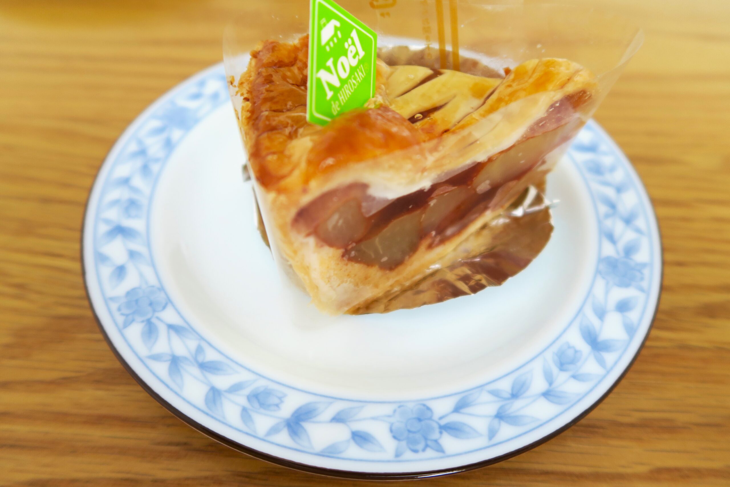 中央弘前駅駅前に戻る前に立ち寄るお店が、2021年6月12日付日経新聞『ご当地食の旅』アップルパイ(青森県弘前市)で掲載されていたのが「洋菓子工房ノエル」です。甘さ控えめのシナモンの香り豊かな「りんごが主役」のアップルパイは、平成14年(2002)地元の第2階アップルパイコンテスト弘前市長賞を受賞。年間を通してお客様に提供できるよう“ふじ”りんごを使用し、パイ生地を薄くして、りんごをどっさり詰めた「ろんごたっぷりパイ」です。