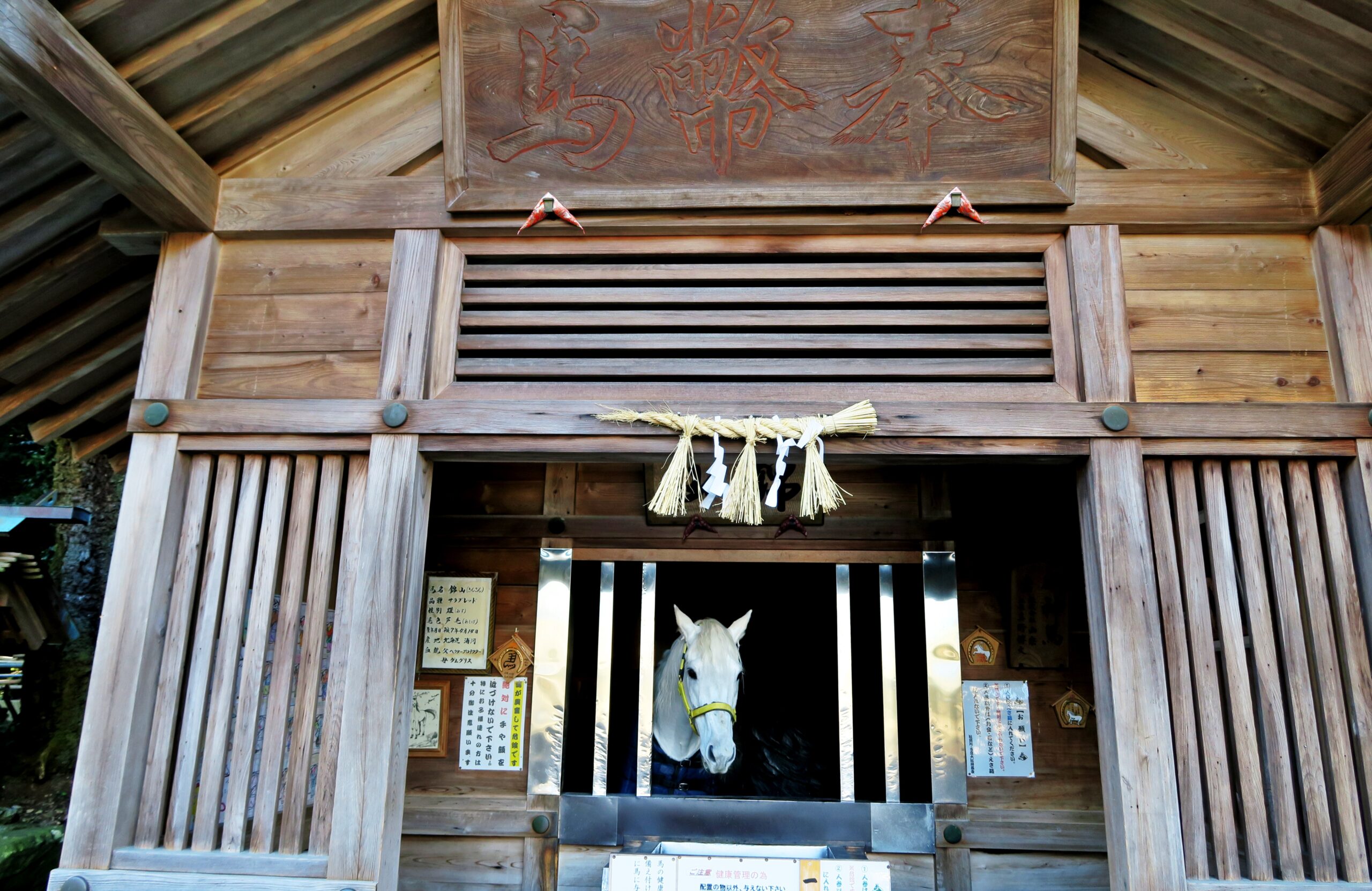 神の使者である白馬が人々に幸せを運んでくるという「白馬伝説」や毎年5月の「上げ馬神事」など馬との関わりが深い神社で、境内には参拝者の幸せを運ぶ神馬がお仕えしていて”物事の成就”に御利益があるとされています。出迎えてくれるのが神馬の「錦山」号。白い馬体に、愛くるしい表情で参拝者を和ませてくれます。お守りには「うまくいく御守」と馬が9頭描かれた馬をあしらったお守りがユニークです。