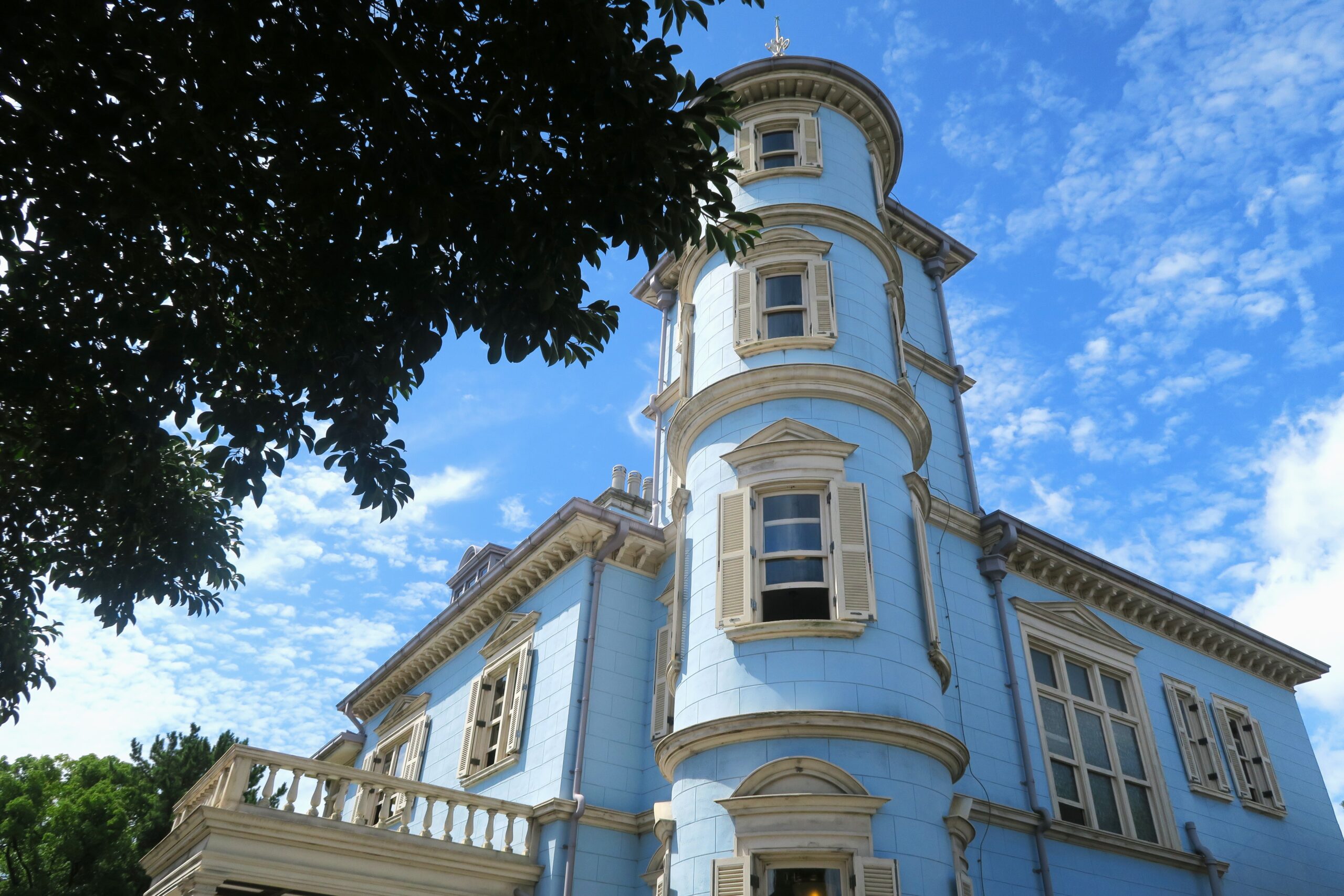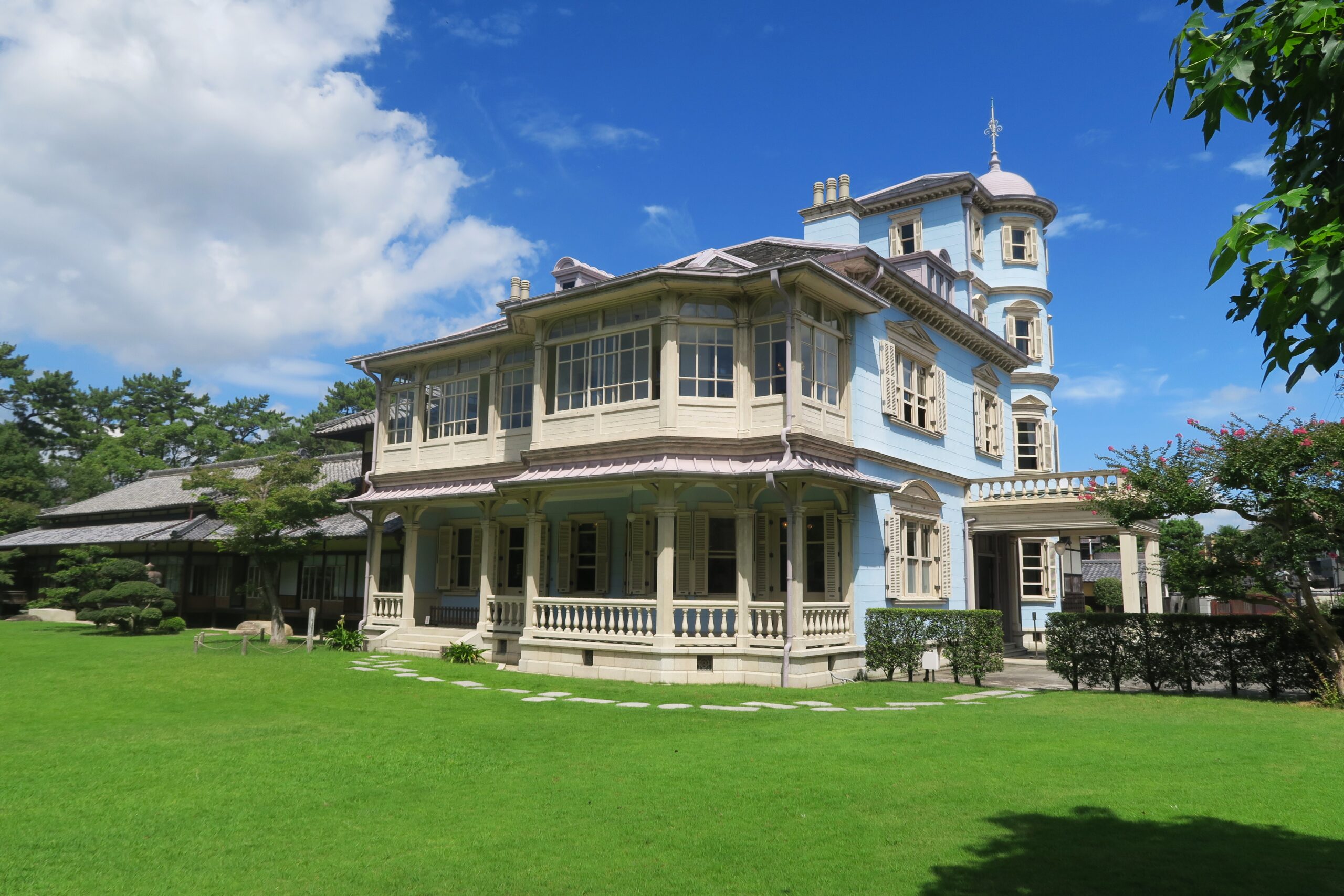 JR関西本線・近鉄名古屋線・養老鉄道線の3線が乗り入れる桑名駅から八間通りを東へ進み海蔵寺交差点を左折してまずは「六華苑」を目指します。揖斐・長良川を望む約18000㎡の広大な敷地に、ひと続きの洋館と和館、「池泉回遊式」日本庭園を配した邸宅は、山林王と呼ばれた桑名の実業家の二代目諸戸清六(1888~1969)の住居として大正2年(1913)に建てられたものです。清六はわずか24歳、鹿鳴館の設計で有名な「日本近代建築の父」と呼ばれたジョサイア・コンドルが手掛けた邸宅のひとつで、依頼した実業家ではもっとも若かったといわれます。晩年のコンドルは上流階級の邸宅建築家として「和」と「洋」の懸け橋を担っていきます。コンドル最晩年の作品としては、大正6年(1917)竣工の足尾銅山などで財を成した古河家の3代目虎之助が住んだ旧古河邸(現大谷美術館)があります。当初3階建てで計画されていた洋館の塔屋は、「揖斐川を見渡せるように」という清六の遺構で4階建てに改められたといいます。曲線が美しい4層の塔、光がたっぷり差し込むベランダやサンルームなど、優雅で繊細な造りが印象的です。和洋折衷の明治・大正期を代表する近代建築ですが、これほど大規模な和館が併設された建物は珍しいとのこと。四季折々の表情を見せる庭園と建物の調和も見事です。