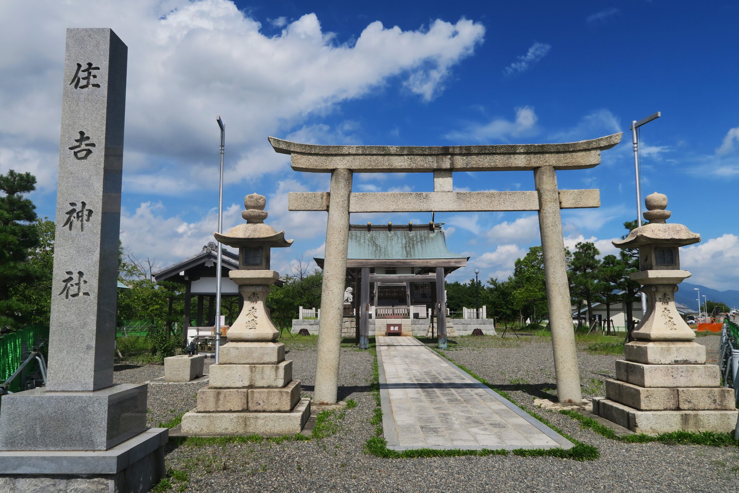 (国営)木曽三川公園桑名七里の渡し公園から揖斐川沿いの住吉浦を歩いていくと住吉神社があります。桑名は古くから伊勢湾、木曽三川を利用した広域的な舟運の拠点港として「十楽の津」と呼ばれ、木材や米などの集散する自由活発な商業都市として発展してきました。ここ住吉浦は、廻船の船溜まりで、全国から多数の廻船業者が集まっていました。これらの人たちによって航海の安全を祈り、正徳5年(1715)に摂津国「住吉大社」より勧請して建立されました。神社前の石鳥居や石灯籠は江戸時代の材木商たちによって、狛犬は明治中頃に備前・備中や阿波国の廻船業者たちによって寄贈されたものです。