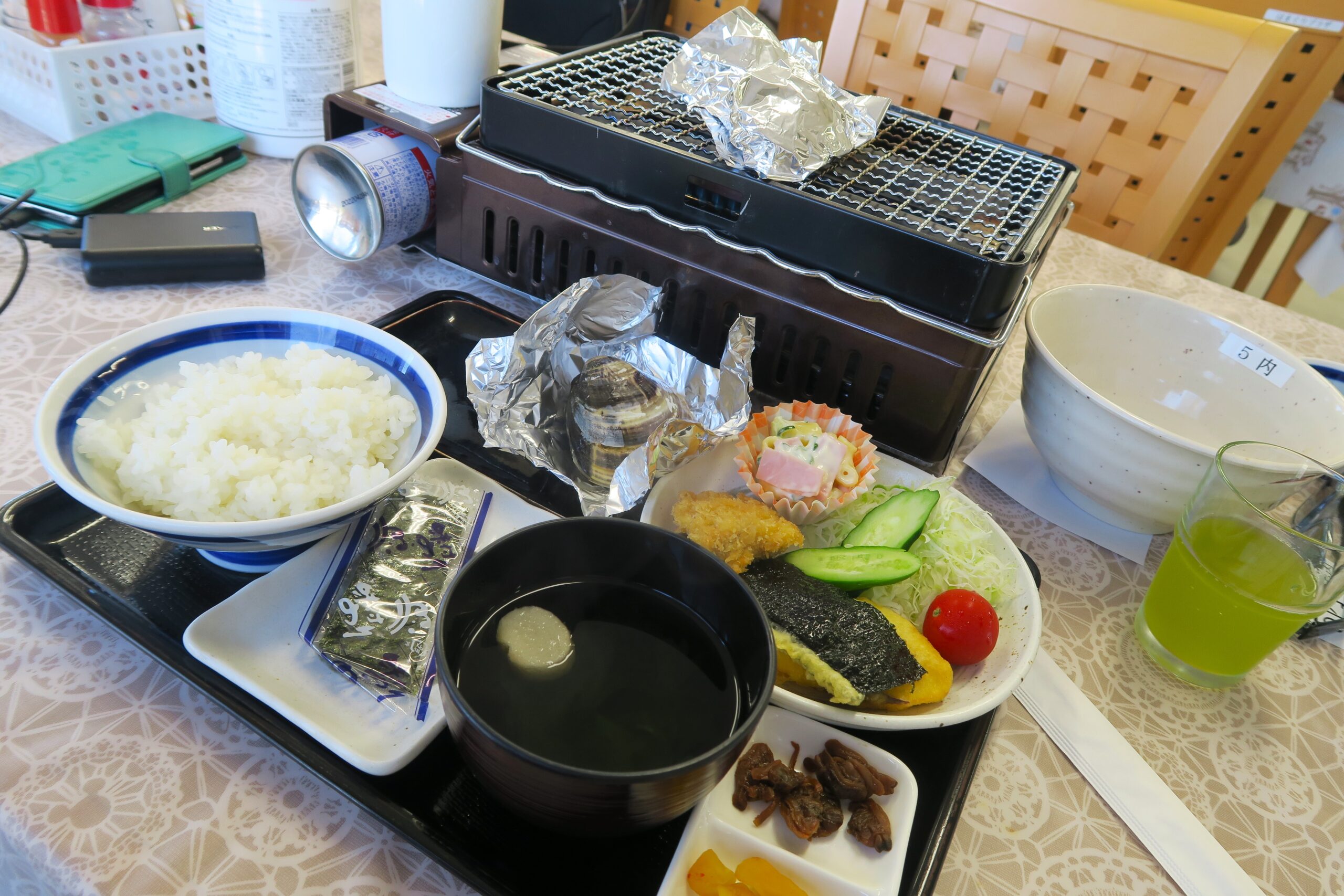 はまぐりプラザ」は漁業交流センターや公民館の複合施設ですが、11時半から13時半の間だけ食堂「はまかぜ」が開店します。ここでは、揖斐川を眺めながら、ふっくら柔らかい桑名産天然蛤を自分で焼いて食べられるということで、予約でしか食べれない炊き込みご飯セットの「はまぐり定食」を一週間前にTELするも売り切れで仕方なく当日食べれる「赤須賀定食」を注文します。焼き蛤3個と蛤とかぼちゃの天ぷら、サラダ、吸い物、ごはんとで2000円です。