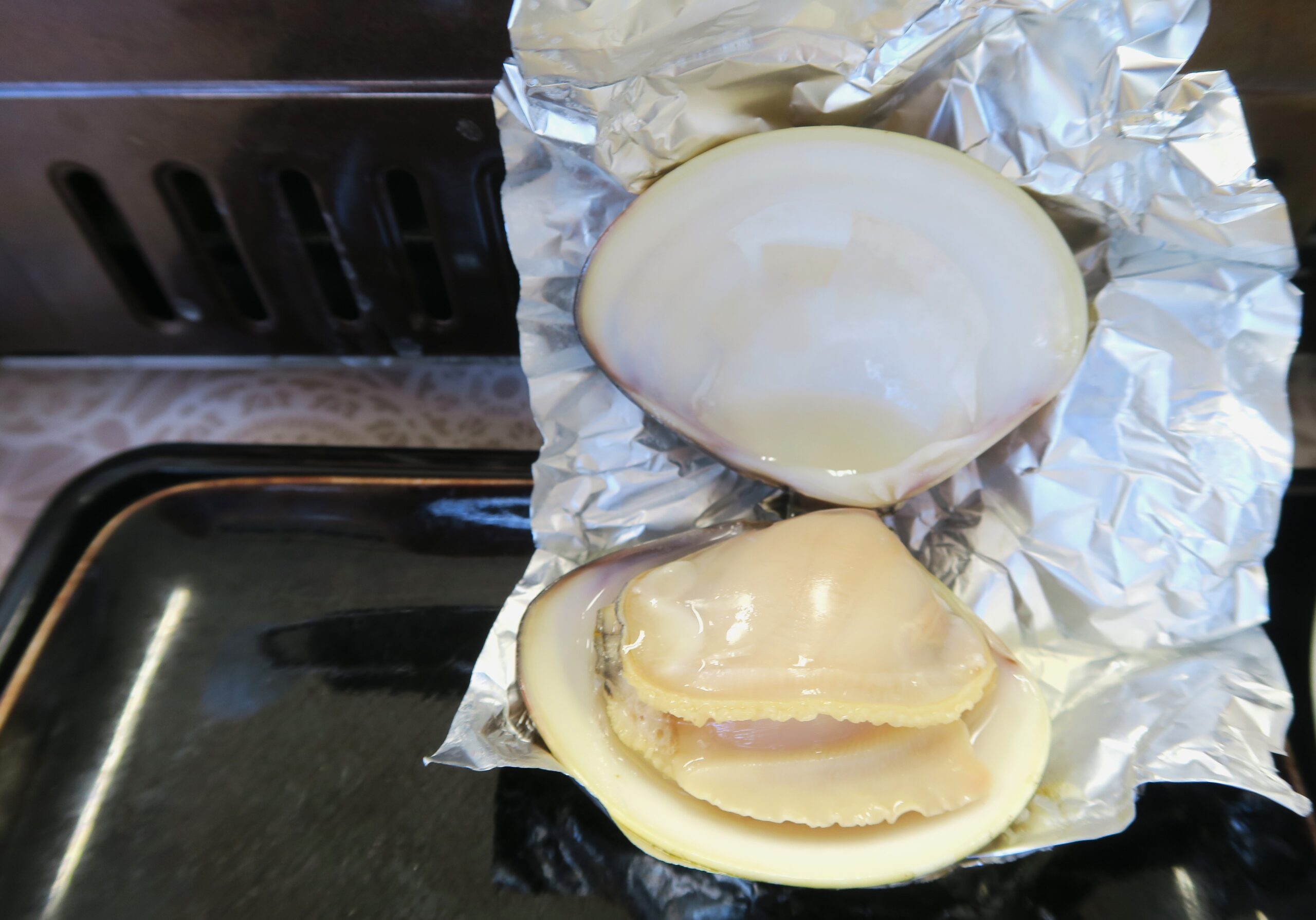 殻には光沢と茶褐色で「ハ」の字模様があり、身はやわらかくて甘い内湾の干潟を好む「ハマグリ」種です。目の前でアルミホイルに包まれた蛤を焼くと、ぷーんと磯の香りが漂ってきてたまらない。水分が沸騰し、貝殻がパカーンと口を開けたら出来上がり、この焼け具合の確認も楽しい。弥次喜多気分で、焼きはまからいただきます。殻が開いたらふうふうして汁を吸い、肉厚でぷりぷりの大きな身を舌へ、潮の香、旨味、甘みがさざ波のように押し寄せ、濃厚な味はやっぱり国産と大満足です。