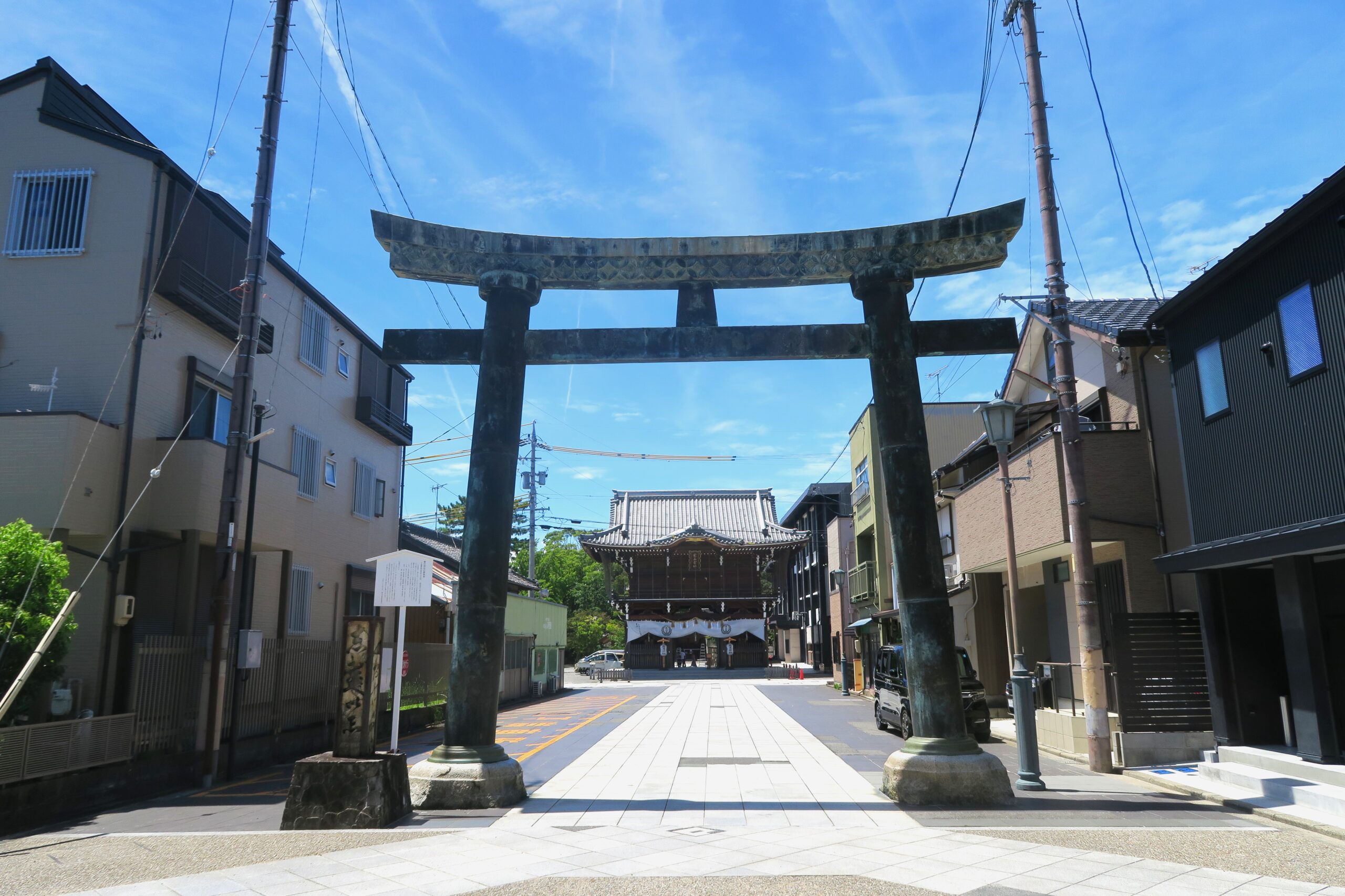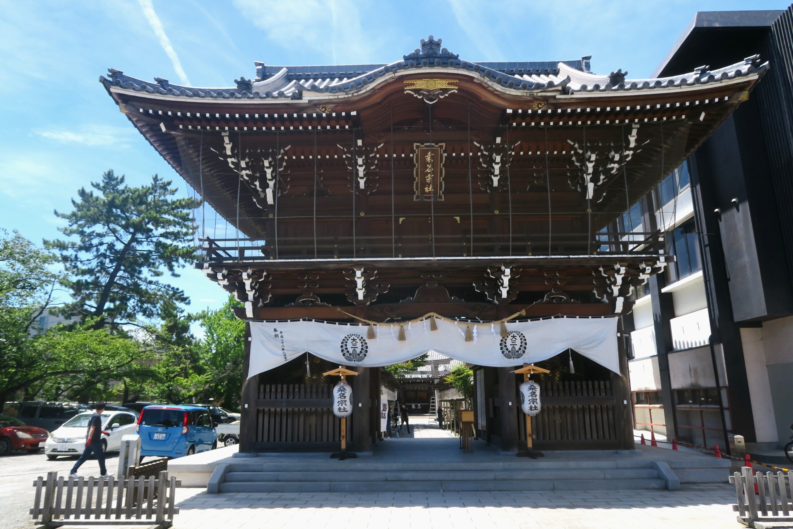 鳥居をくぐるとこれも立派な楼門です。天保4年(1833)松平定永によって寄進された三間一戸・重層入母屋造りの楼門で、正面左右には左大臣、右大臣、裏側には金剛力士像が安置されていましたが、昭和20年(1945)の空襲により焼失、平成7年(1995)に再建されました。