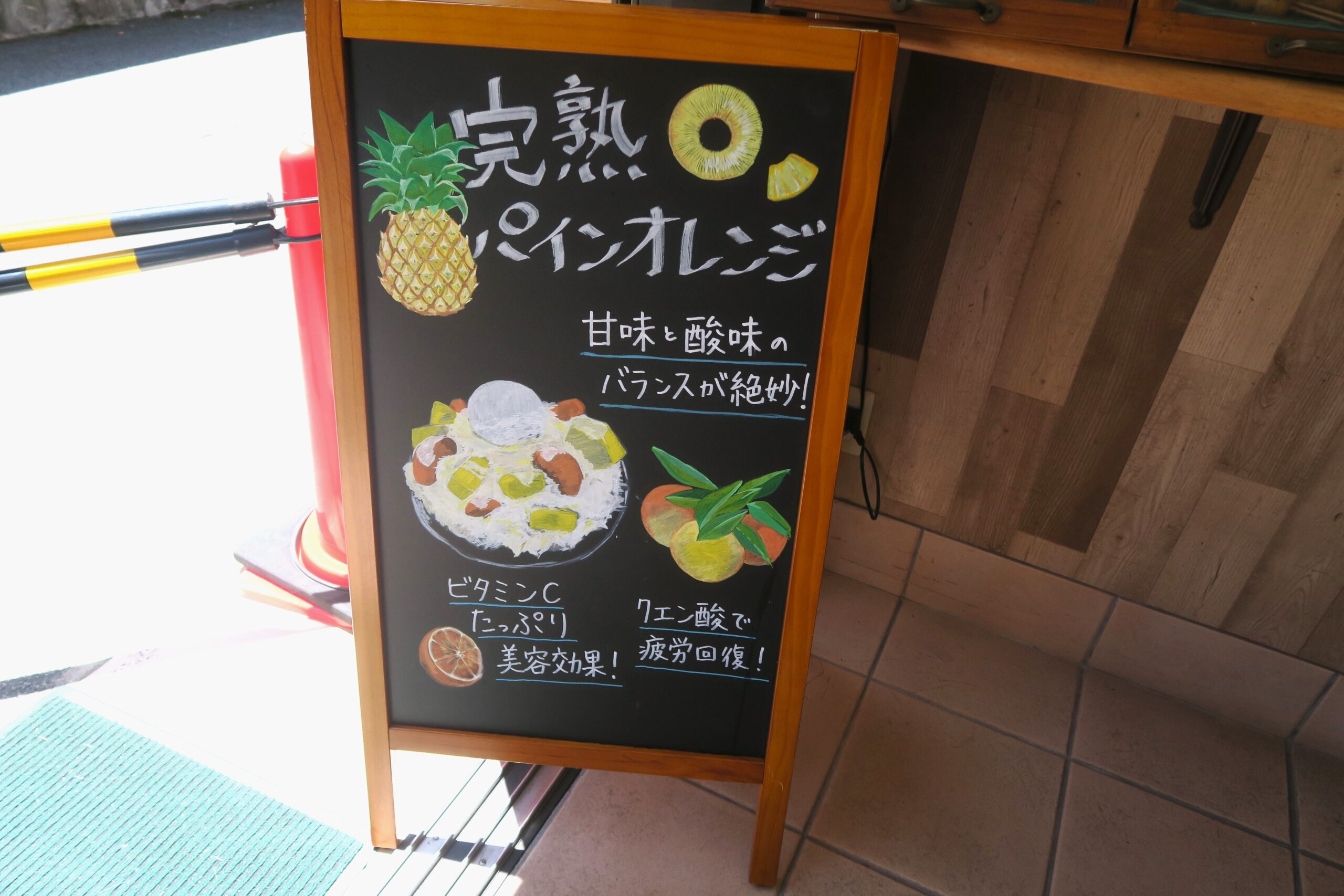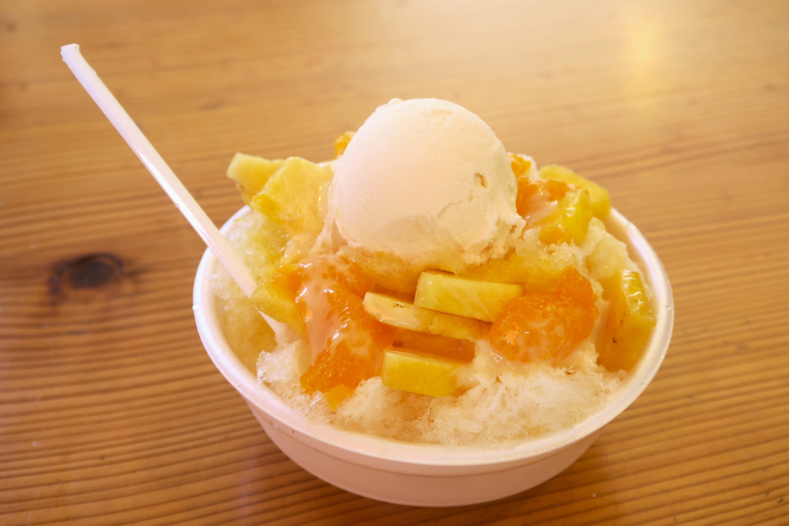 三重天然水の氷「美里氷室」を使用したかき氷の完熟シリーズ2種類のうち完熟パインオレンジは果物を贅沢に使った酸味と甘味のバランスが絶妙の人気のかき氷です。