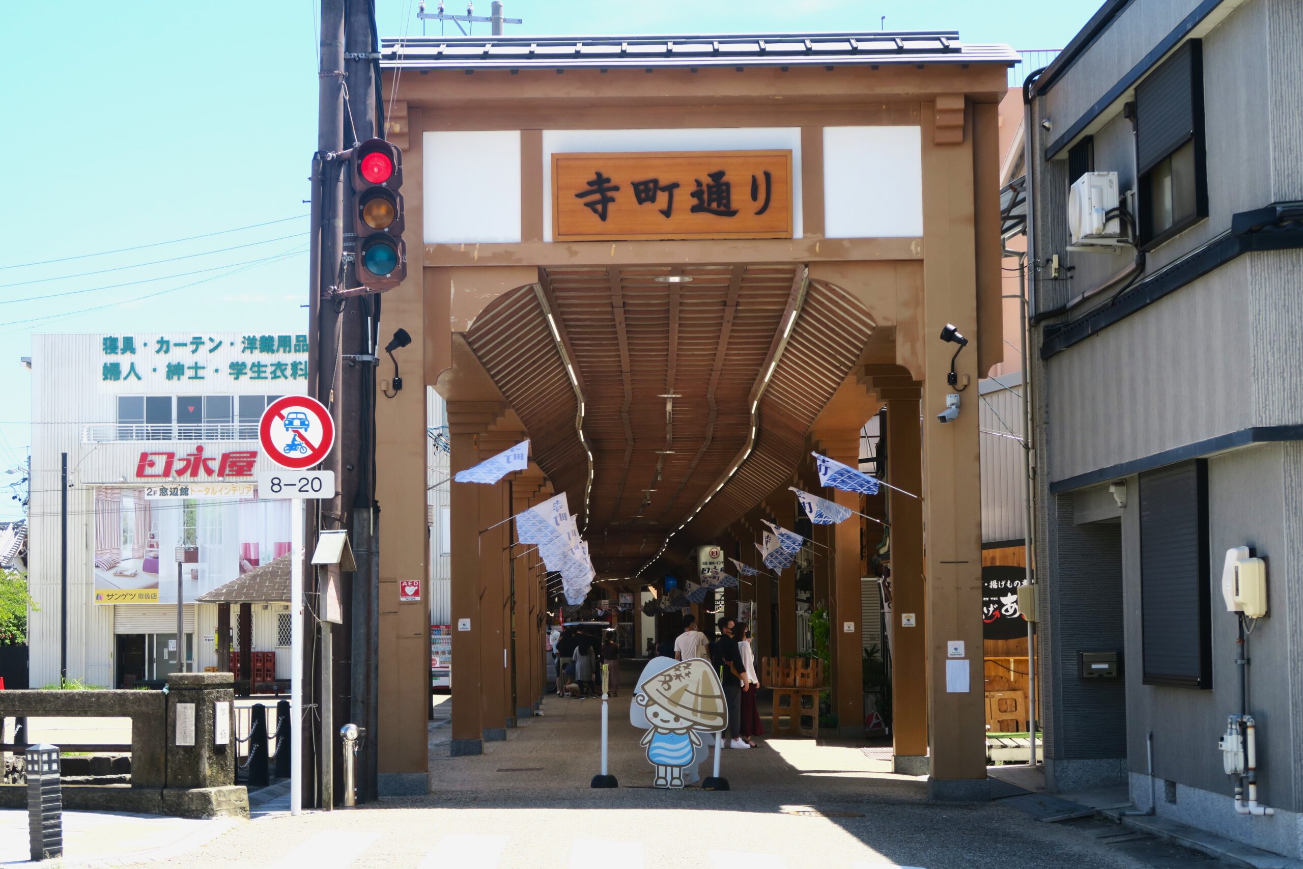 更に駅方向に向かい、駅を挟んで二か寺を訪れます。八間通りに面して入口のある200mのアーケードが美しい寺町通り商店街。三と八の付く日の名物朝市には、露店が並び食べ歩きや堀出し物発見も楽しみです。入口では桑名のイメージキャラクター“ゆめはまちゃん”が迎えてくれます。衣装の三本線は木曽三川を表現しています。