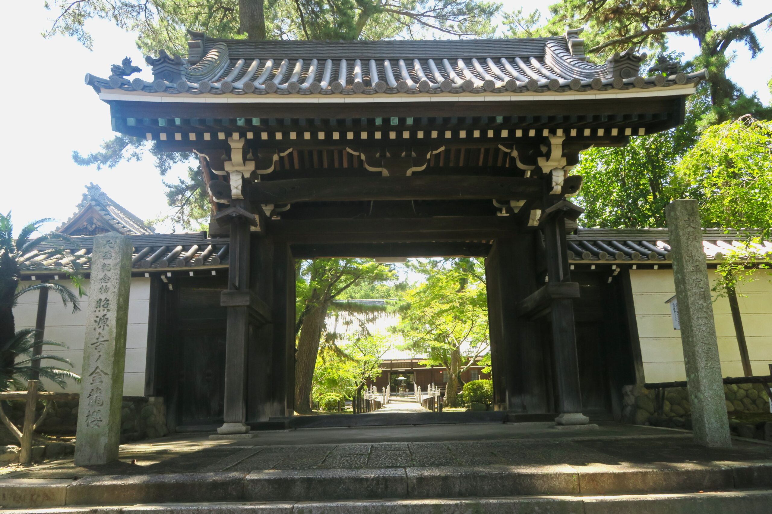 線路を跨いで500m先にあるのが久松松平家菩提寺「照源寺」です。寛永元年(1624)、桑名藩主・松平定勝(徳川家康の異父弟)の死去の際、2代将軍徳川秀忠の命でその子松平定行が建立したお寺です。山門は寛永元年(1624)建立で棟高710cm、軒先高410cmの切妻、本瓦葺、一間一戸の四脚門、総欅造です。