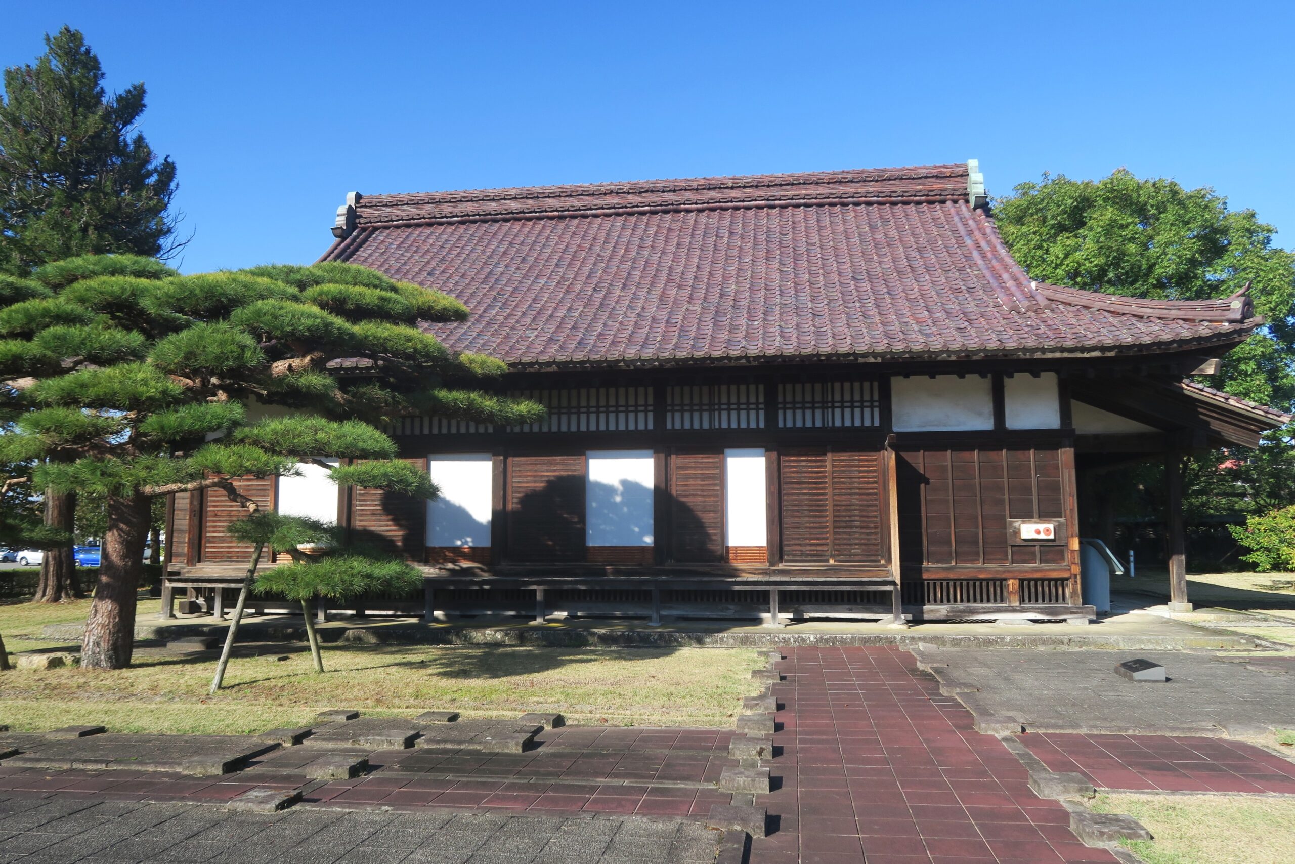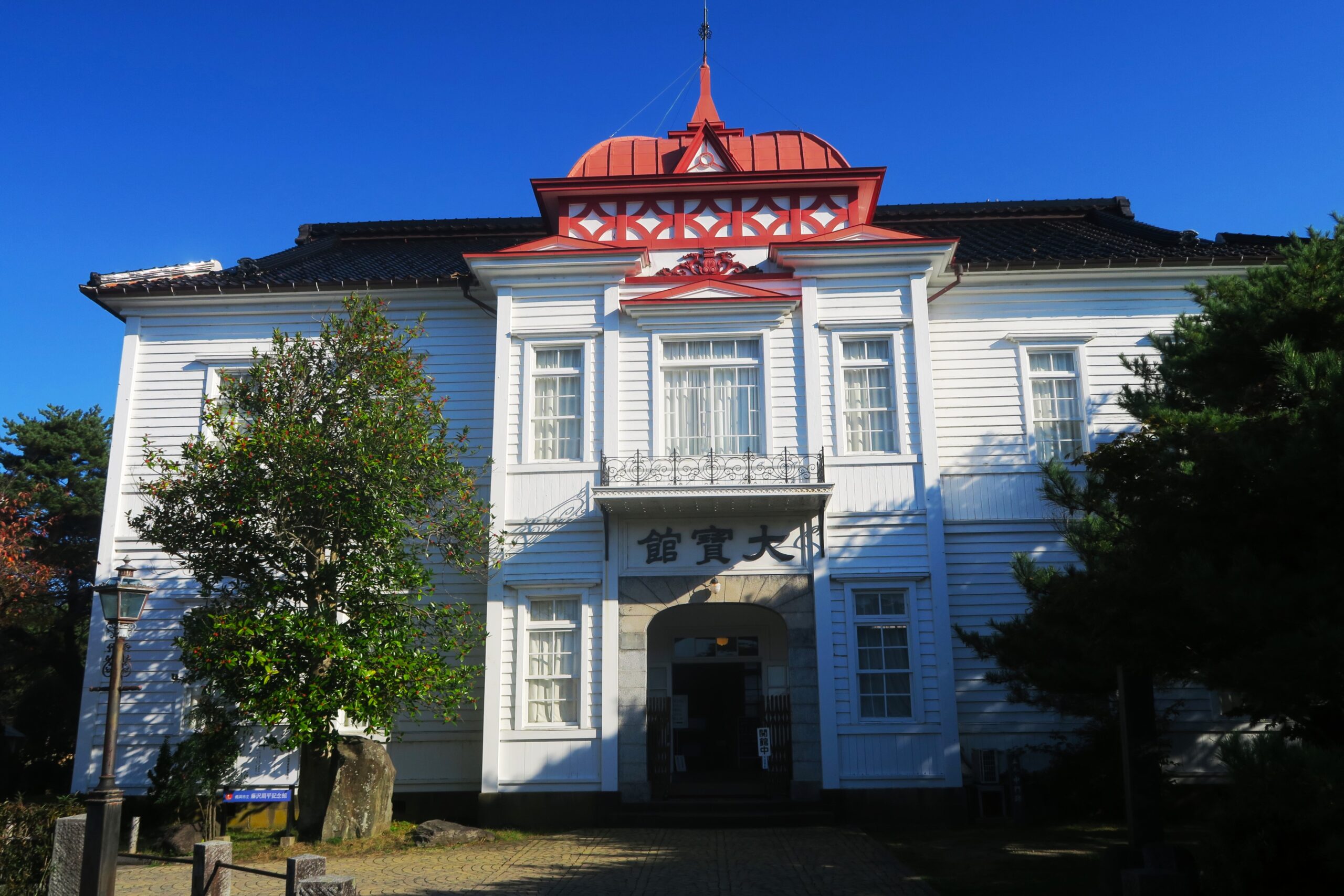 城址公園内、中の御門址には大正天皇の即位を記念して大正4年(1915)に建てられた「大宝館」があります。大宝館の名は、中国の易経にある「天地の大徳を生という。聖人の大宝を位という。」に由来します。オランダバロック風の窓とルネッサンス風のドームを併せ持つ完成度の高い疑洋風の大正建築。シンプルな左右対称も姿が美しく、白亜の壁と赤いドーム風の屋根が屋根が印象的です。明治の文豪高山樗牛をはじめ、日本のダ・ヴィンチといわれた松森胤保、昭和初期の日本の代表作家・横山利一など鶴岡市の郷土人物を紹介する資料館になっています。