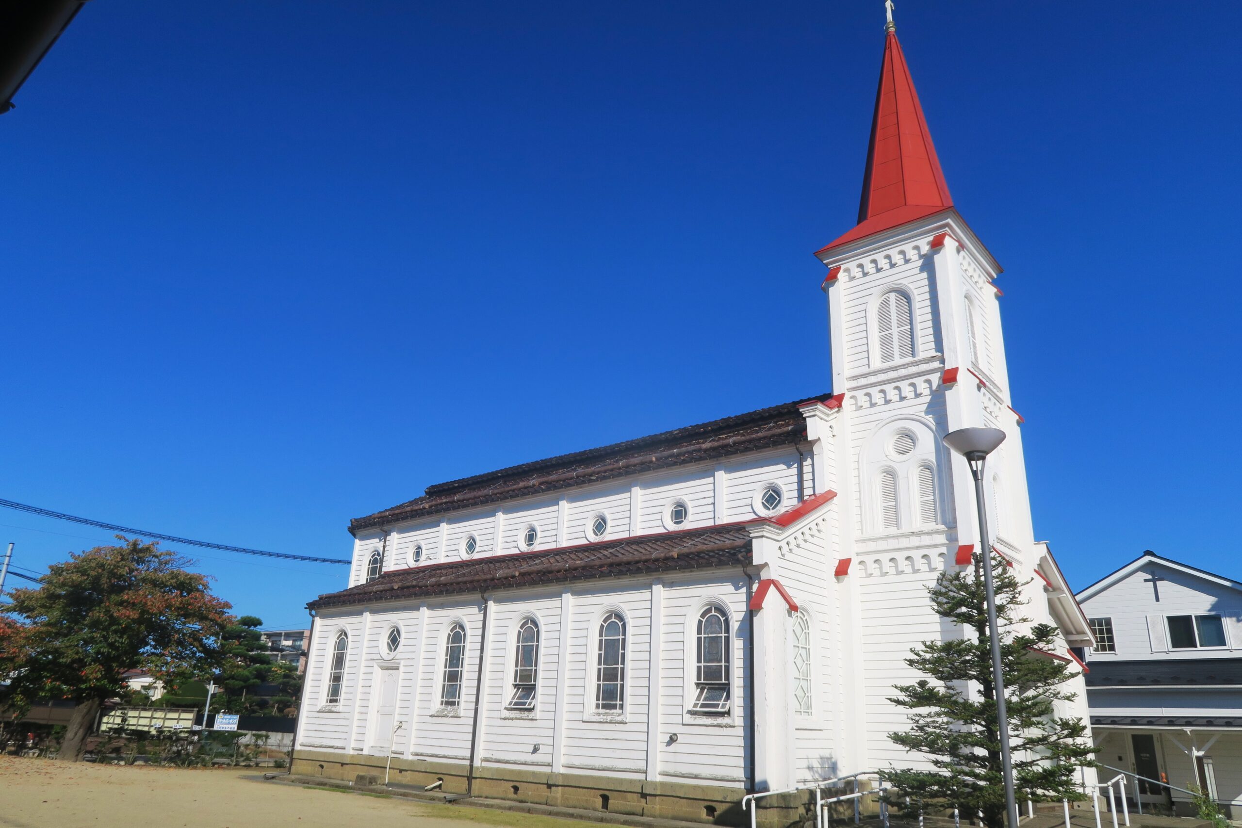 鶴岡公園から三雪橋へ向かう途中、庄内藩家老末松十蔵屋敷跡の古い武家門の奥に建ち、異彩を放ちつつ町並みには溶け込んでいるのが鶴岡カトリック教会天主堂です。日本における教会堂の建築設計を数多く手掛けたフランス人宣教師パピノ神父最後の設計によるもので、大工相馬富太郎が棟梁となって明治36年(1903)に完成した明治洋風建築の傑作とも謳われる国指定・重要文化財です。高さ23.7mの赤い尖塔を持ち、正面幅10.08m、奥行き23.7m、木造瓦葺きの真っ白な横板張りの瀟洒な外観をもつ天主堂は、フランスのデリヴランド教会をイメージして建てられました。まるでヨーロッパの教会そのもので、聖パウロ大寺院と同じ古代ローマの集会堂を継承した長方形のバジリカ型三廊式ロマネスク様式の教会建築物で、東北地方ではこの様式最古のものです。