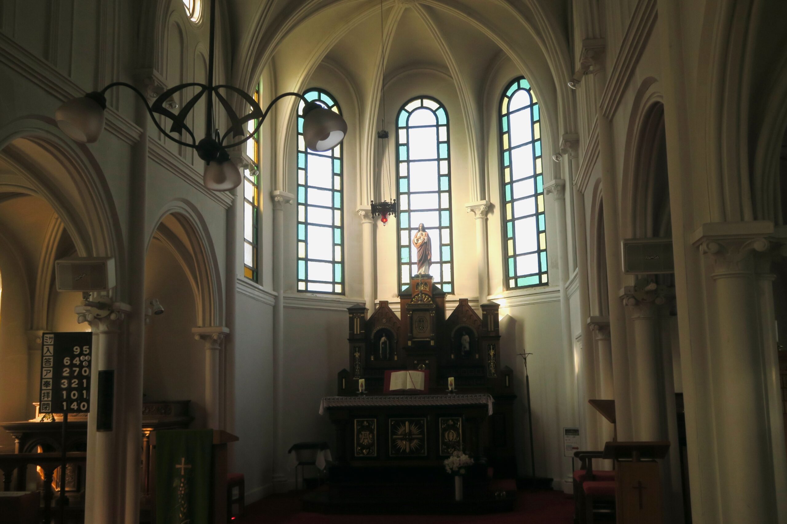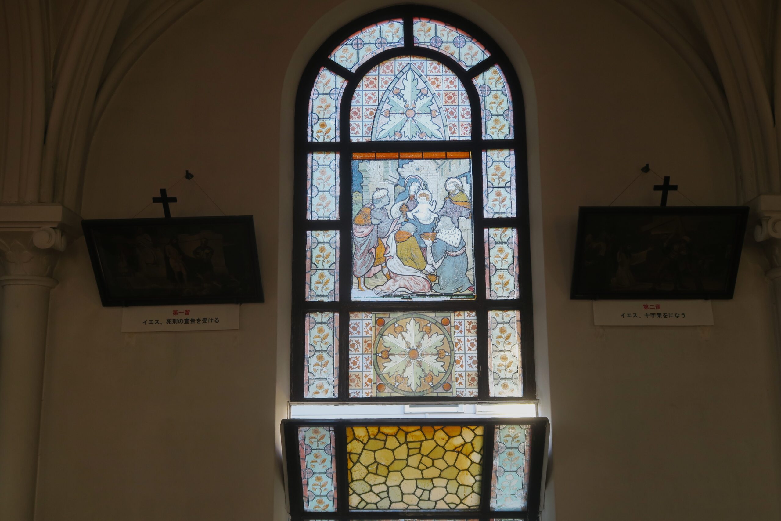 ロマネスク寺院特有の半円形の枠におさめられた「窓絵」から、聖堂内に陽光が入り、気高い空間をつくり出しています。ステンドグラスでも色ガラスを組み合わせた絵でもないこの教会の窓の絵は、通称「貼り絵」(プリンティッド・フィルム・ステンドグラス)と言われている独特の技法でつくられた宗教画。薄い透明な紙に描かれた聖画を外側から貼り、さらにその外側にガラスを設け二枚のガラスで挟んだもので高価なステンドグラスに代えて使用したと考えられるが、現在、この種の窓絵は日本ではこの教会だけです。