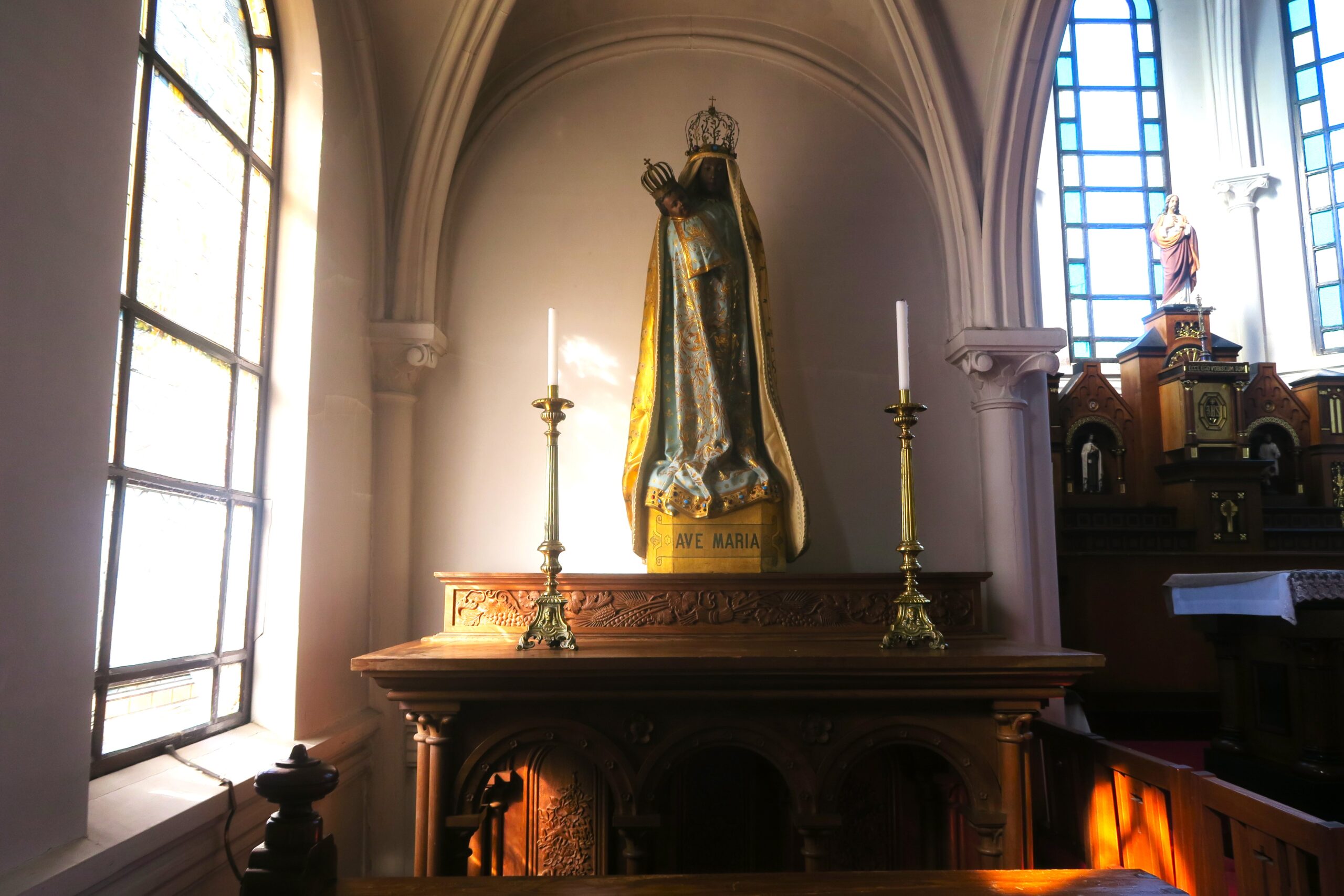 聖堂左側の副祭壇に立つ日本で唯一現存する「黒い聖母マリア」は、教会の創建時にフランスのノルマンディー州デリヴランド修道院から寄贈された世界でも希少なものです。様々な奇跡やエピソードを持ったマリア像の黒い顔を説明する一つの雅歌が旧約聖書にあります。『イスラエルの娘たちよ、私はケダルの天幕のように、サルマハの幕屋のように、黒いけれども美しい。私の焦げた色に目をとっめるな。私は陽にやけた。』と。デリヴランドの町を聖母祝日に歩いたこの像は、今、異国鶴岡に祀られています。