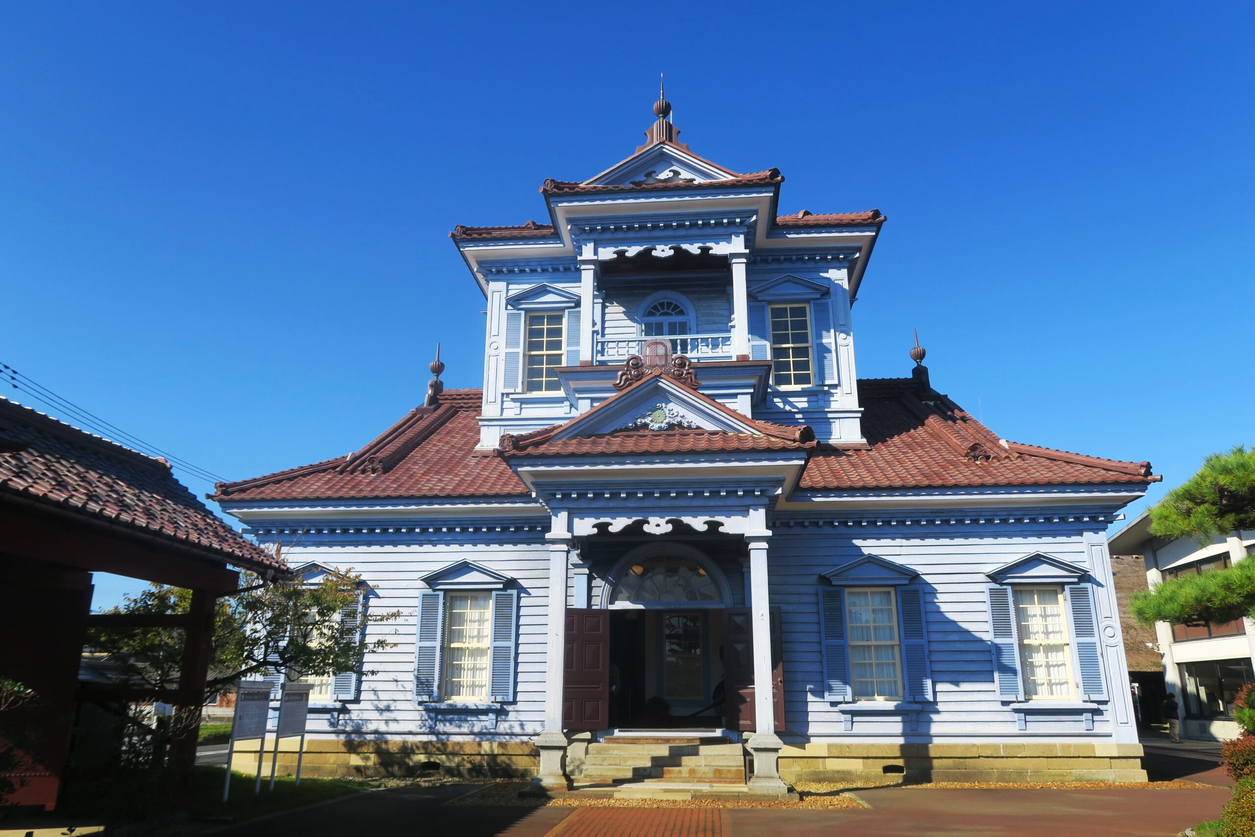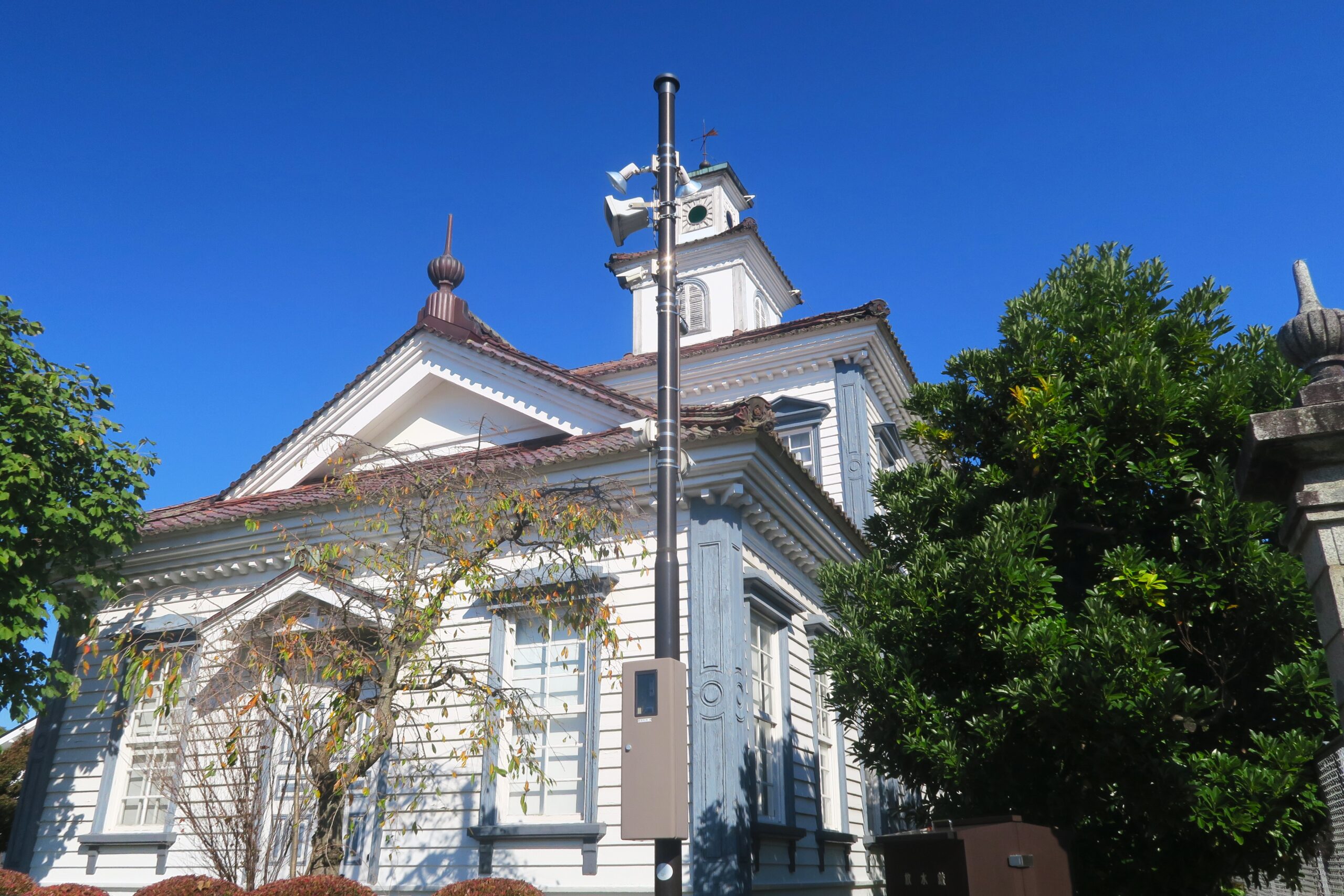 旧西田川郡役所は明治14年(1881)建造。明治天皇が東北巡幸のおり、鶴岡の行在所となった由緒ある建物。設計・施工は同じく高橋兼吉です。鹿鳴館時代を今に残すルネサンス風擬洋風建築で、中央玄関2階にバルコニー、建物中央には塔屋・時計塔がある木造2階建て、両翼1階建て、高さ20mを有する。外観は上げ下げ硝子窓・玄関ポーチの柱脚台と頚巻線形・軒先廻りの化粧陸垂木などのルネサンス様式がみられます。