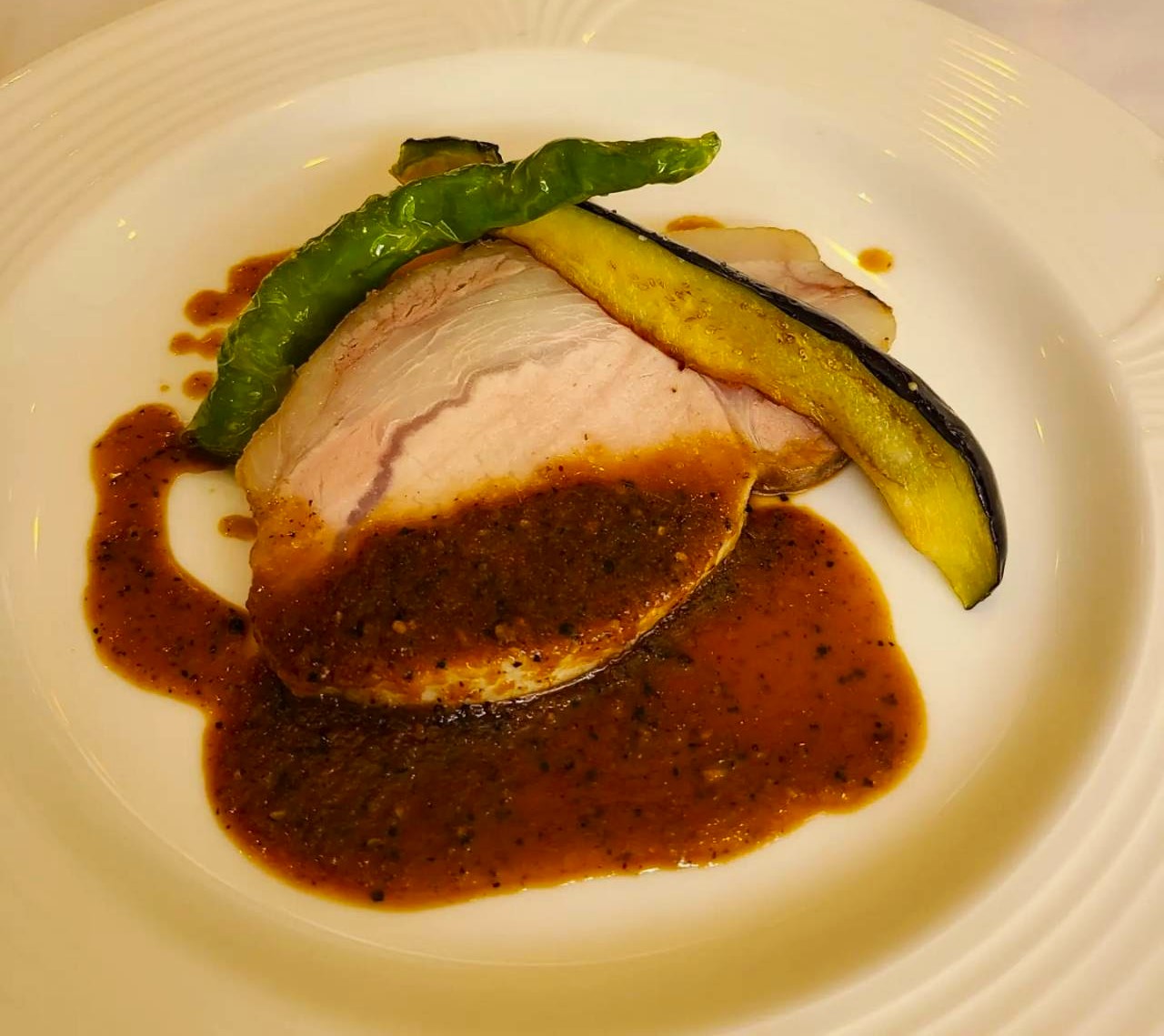 本日のおすすめメインディッシュで今回の「甲州産富士桜ポークのロースト 黒コショウの香るソース」に合わせるワインのひとつは「甲鐵百年 赤」もうひとつは「ミュール シャトーブリヤン 赤」をいただきました。サドヤ百周年記念ワイン「甲鐵百年 赤」は山梨県産マスカット・ベーリーAとカベルネ・ソーヴィニョンを使用していて富士山の麓で飼育されたジューシーな富士桜ポークを低温で焼き上げた肉質の甘味にフルーティな酸味とオーク由来の風味、バランスのとれた心地良い渋みとで長い余韻を楽しませてくれます。