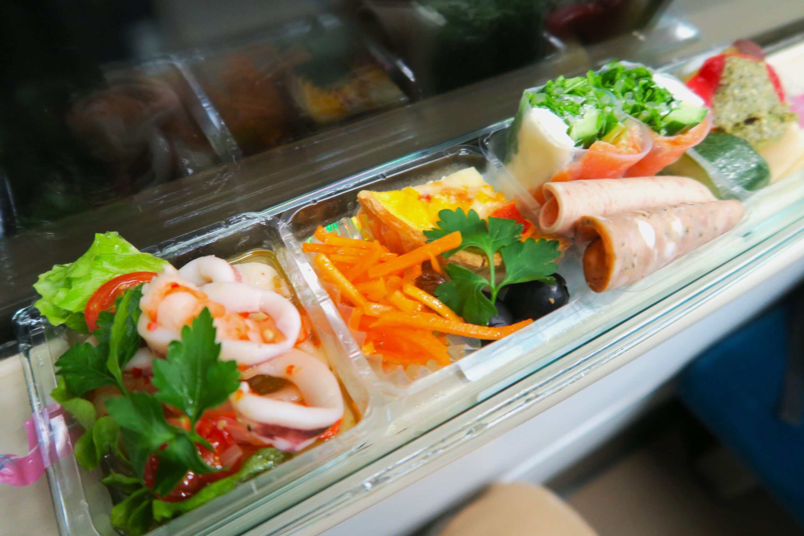 おつまみは山梨県産の食材を使用した料理が中心に充実していて、パック入りなのですべて持ち帰りも可能です。写真は「ワインと楽しむオードブル」で、列車内での晩酌に調達しました「イカのマリネ」や「キッシュ」「香味野菜の中華春巻き」などひとつひとつが丁寧に作られていて味のバリエーションも豊富で楽しめます。
