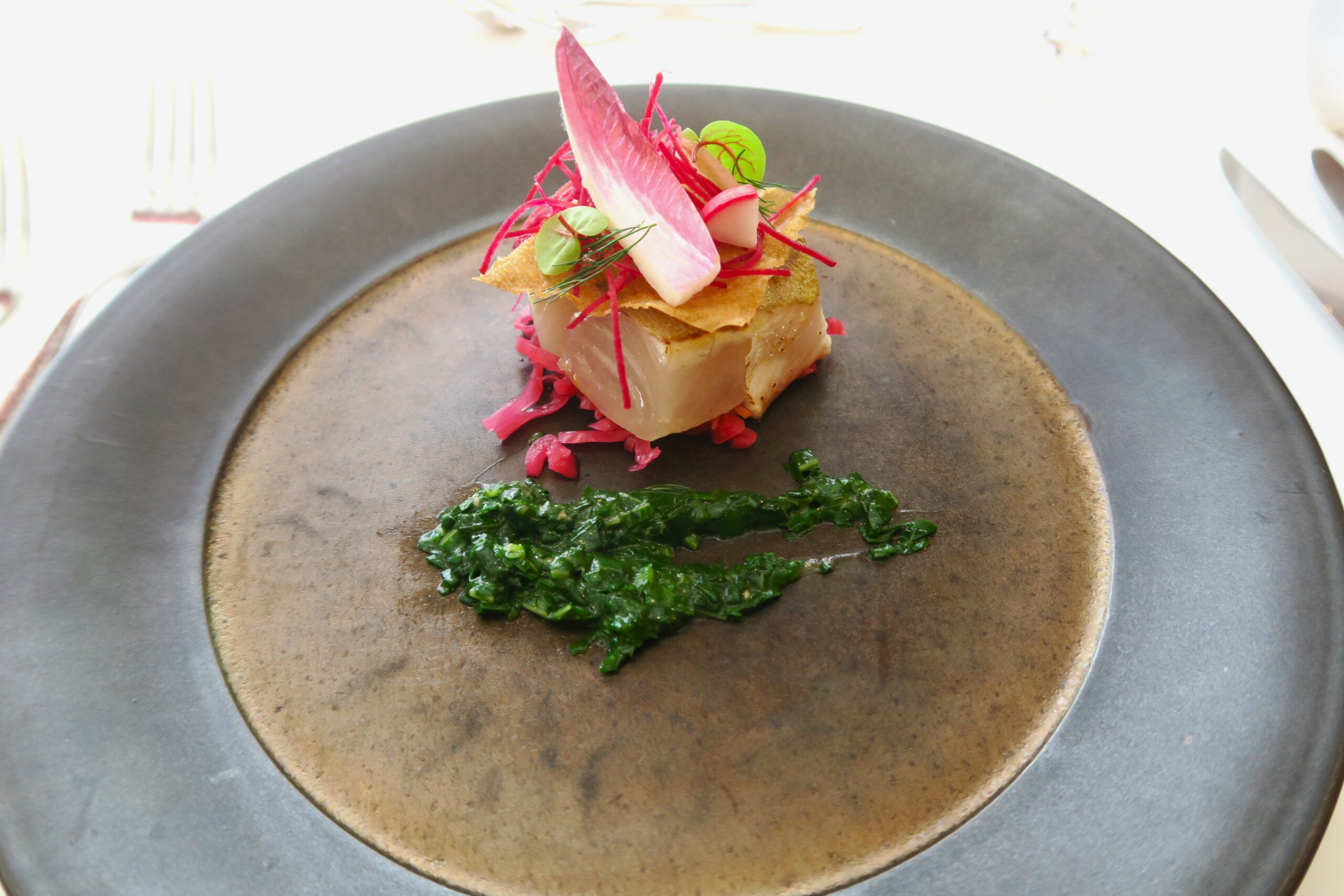 オードブルは「シマアジのマリネ バジルソース添え」そして合わせるワインは「サドヤスパークリング」。スパークリングの泡が陽射しに照らされて輝いています。チリ産のソービニヨンブランと山梨県産の甲州種をブレンドした辛口スパークリングワインです。緑がかった薄い黄金色からはフレッシュさを感じさせ、柑橘系の爽やかな香りとすっきり溌剌とした泡立ちのドライスパークリングになっています。