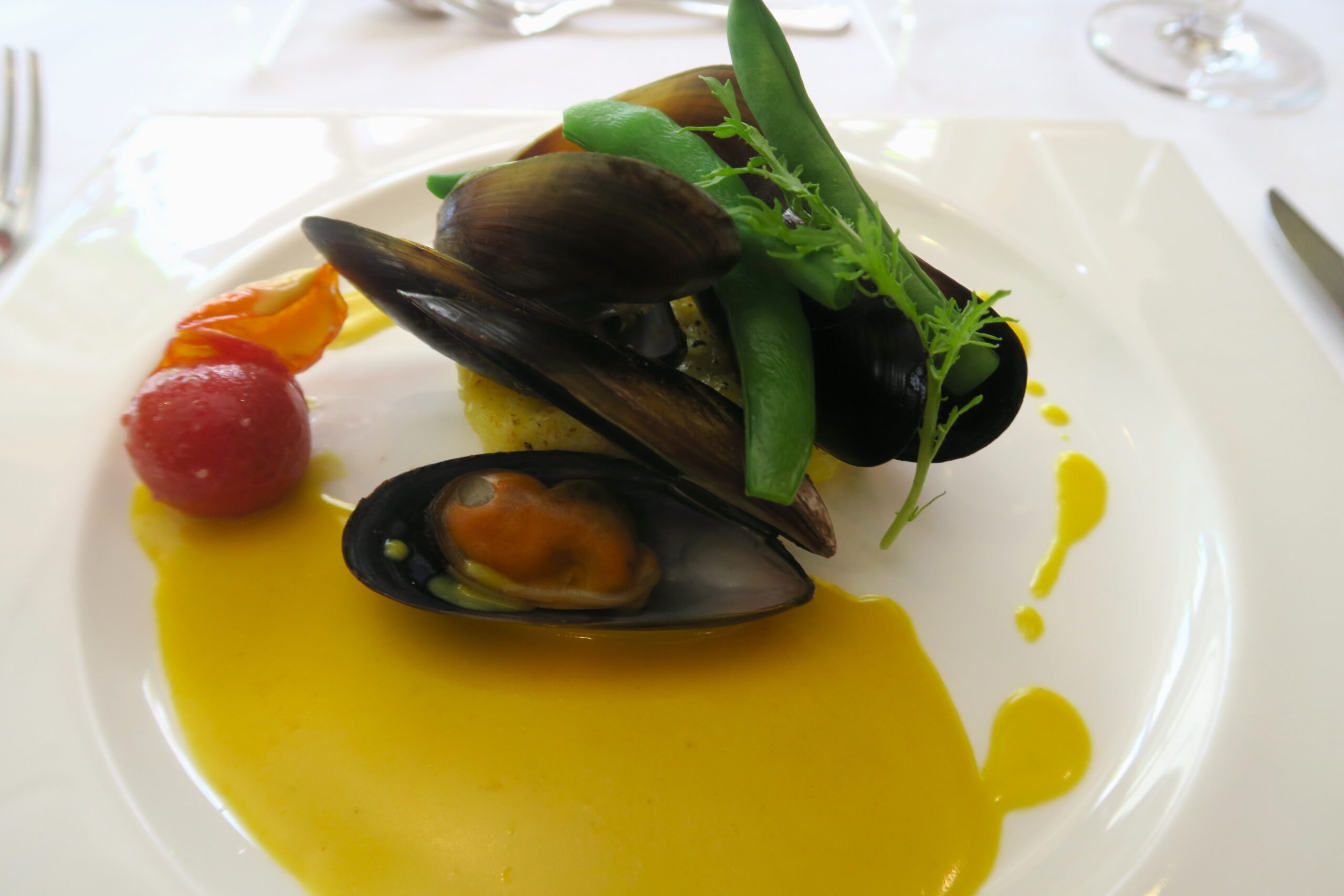 「ムール貝のナージュ サフランの焼きリゾット添え」には「PAGE-ONEシャルドネ」を。長野県高山村日滝原地区のシャルドネを使用し、ワインコンサルタント、沼田実氏とのコラボレーション企画のワインです。第14回フェミナリーズ世界ワインコンクール金賞を受賞しています。