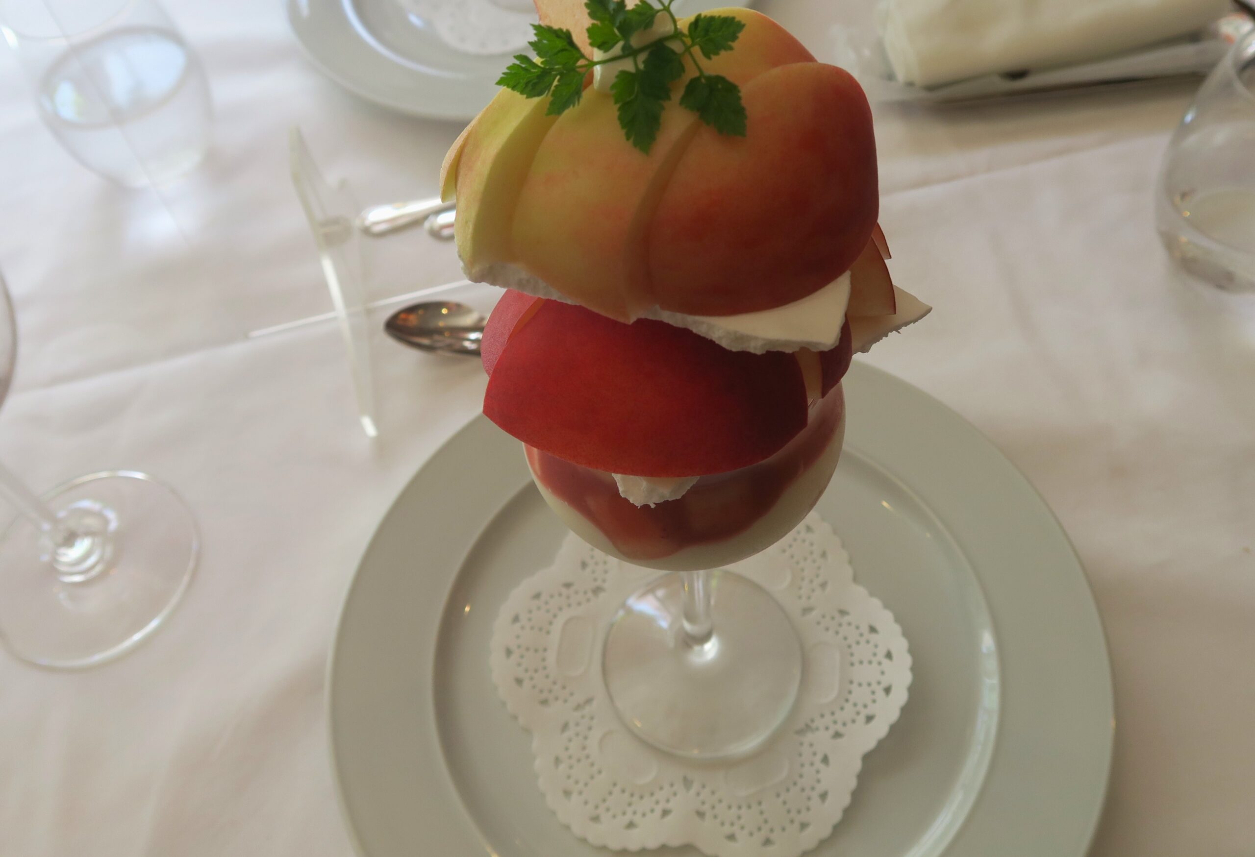 デザートはお待ちかねの「桃のパフェ」です。桃を1.5個分使ったエレガントな桃パフェ。山梨では皮ごと食べるのが地元流。