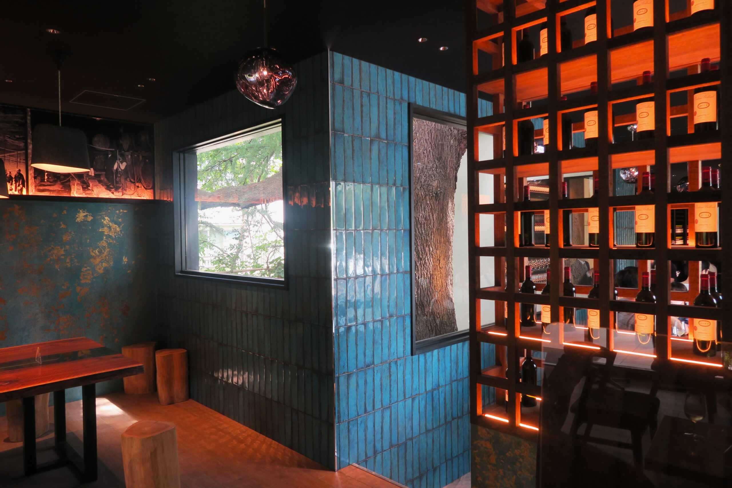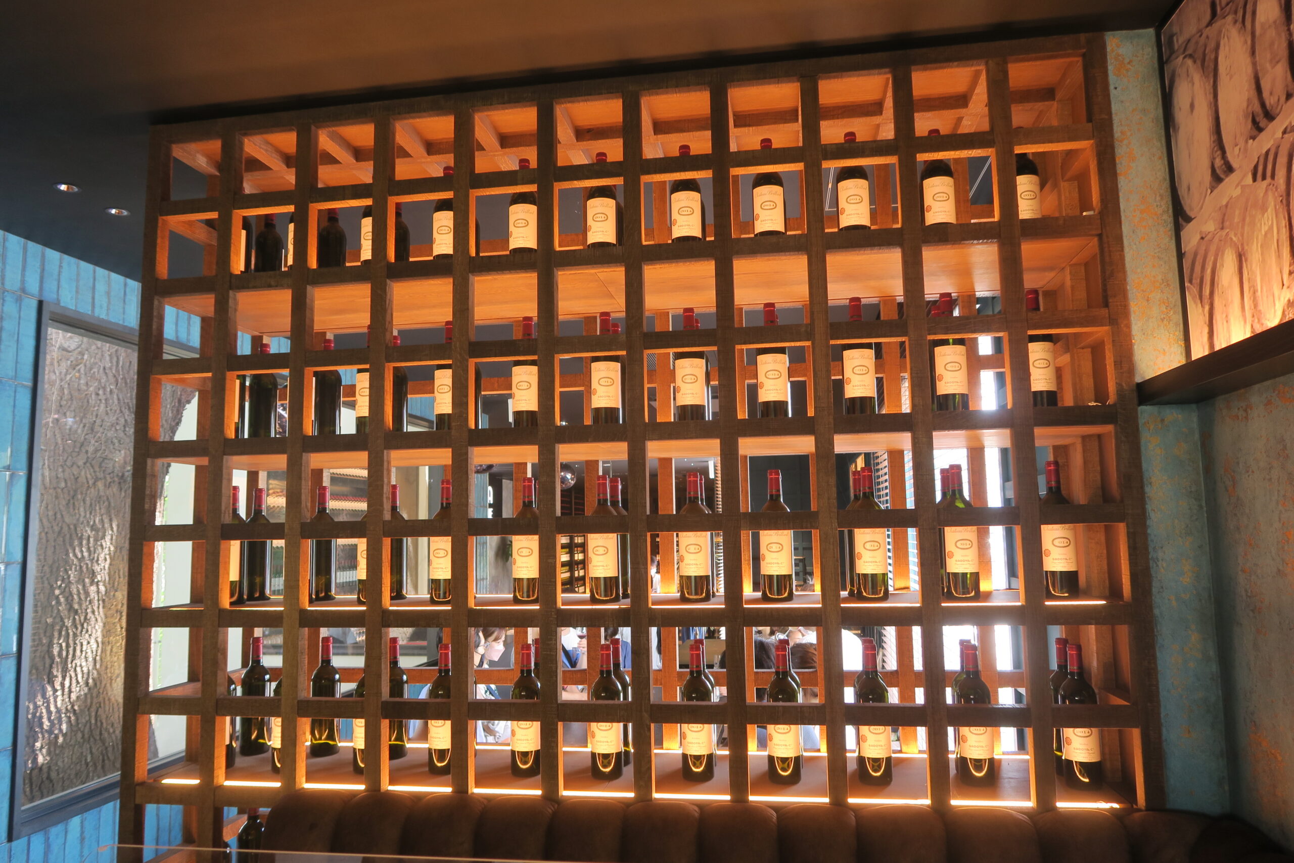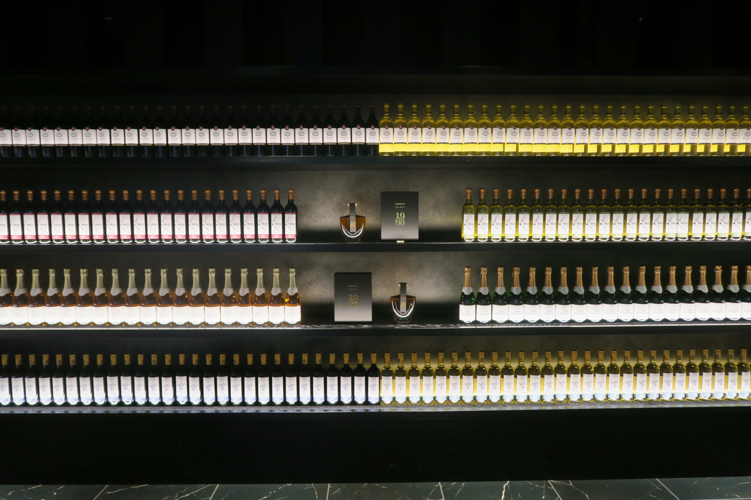 入口入って右手には購入できるワインを黒を基調としたシックな内装に約2500本ものワインを陳列し、間接照明を当てることでワインを劣化させることなく美しく浮かび上がらせています。