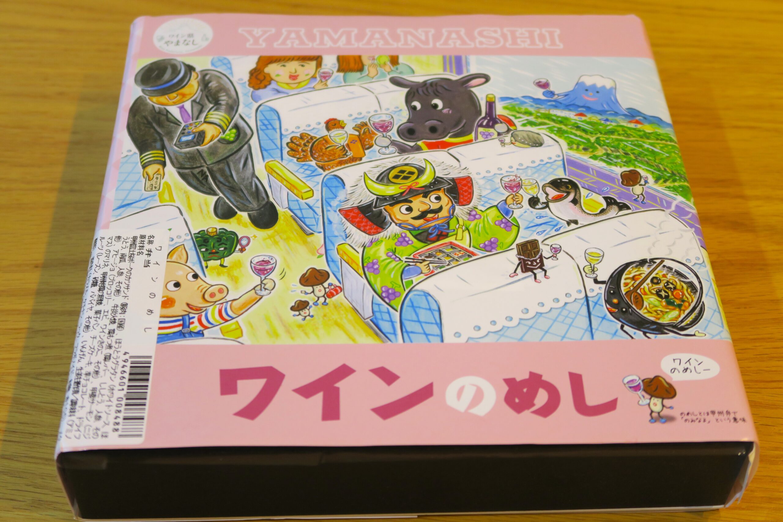 駅弁大将軍2021で「駅弁大将軍」を受賞したのが、山梨らしさ、楽しさ、旅感をふんだんに盛り込んだお弁当「ワインのめし」です。「そそられる」という言葉は、こういうときにこそ使うのであろうと、その名を聞いただけで思わず食べたいと思ってしまいます。パッケージの絵に目を転じれば、牛が、豚が、鶏にキノコがワイングラスを掲げて乾杯しています。武田信玄であろう兜の武将も弁当を前に乾杯です。おまけに車窓の富士山までもがパーティーに参加しています。車窓から見える雄大な景色を眺めながら、ワイン片手に山梨まらではの素材を活かした「ワインのめし」を楽しみます。