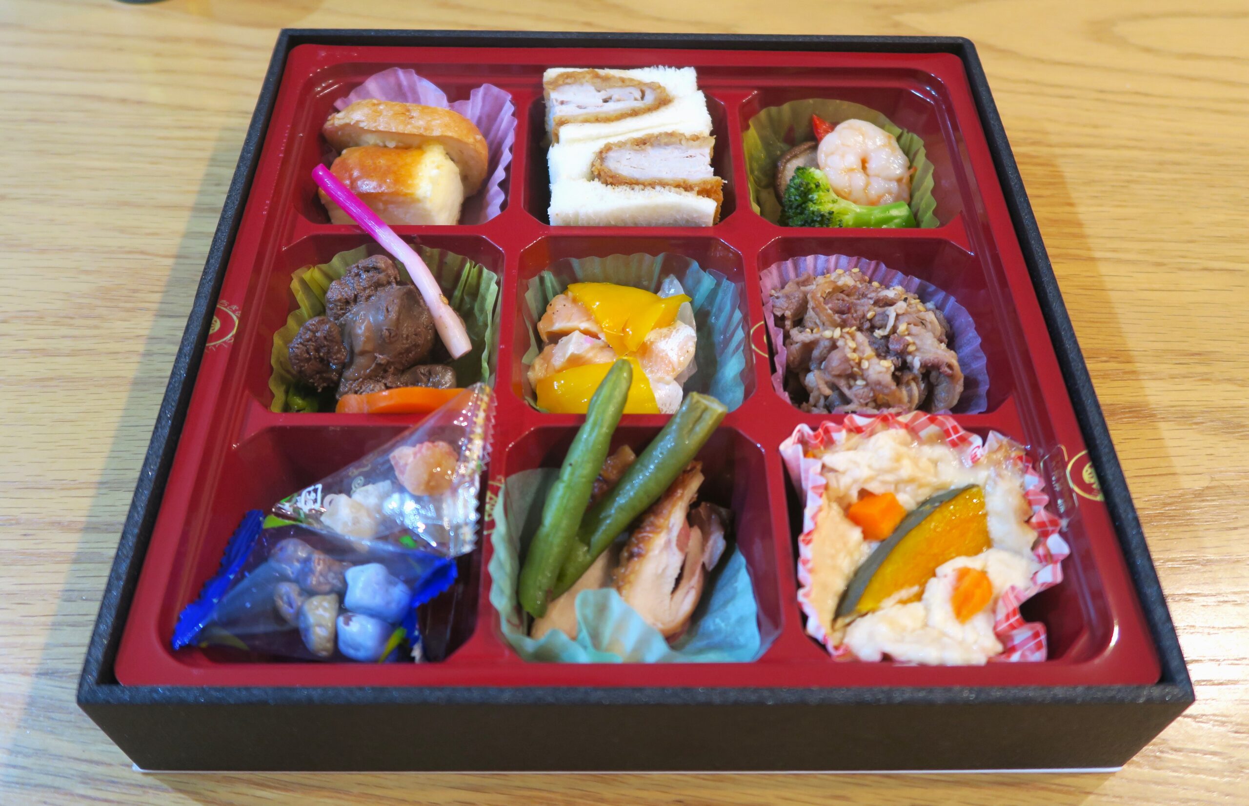 ここは山梨甲府駅。日本ワインの産地であり、“ワインのめし”ののめしとは甲州弁で「飲みなよ」という意味でもあります。料理は9マスにちょっとずつ、このちょっとずつ作戦に食欲が再びそそられるのです。「ワインきのこと小エビのアヒージョ」「牛肉炭火焼白ワイン仕立て」とワインが欲しくなるメニューが並び、山梨ならではの素材も「甲斐サーモンのマリネ」「甲州ほうとうグラタン」「甲州地鶏テリヤキチキン」「甲州鳥もつ煮」と姿を変え、ワインとマリアージュに期待を持たせてくれます。「甲州フジザクラポーク」は、フワ、サクの次にソースの濃い味が染みるみんあが好きな「カツサンド」で登場です。バターの効いた「レーズンパン」に「チーズケーキ」が寄り添って甘味の世界も提供してくれています。存分に山梨テイストが味わえるこの駅弁にどのワインをあわせようかと嬉しい悩みを与えてくれます。「ドライフルーツ」と「月の小石チョコレート」はおまけかな。