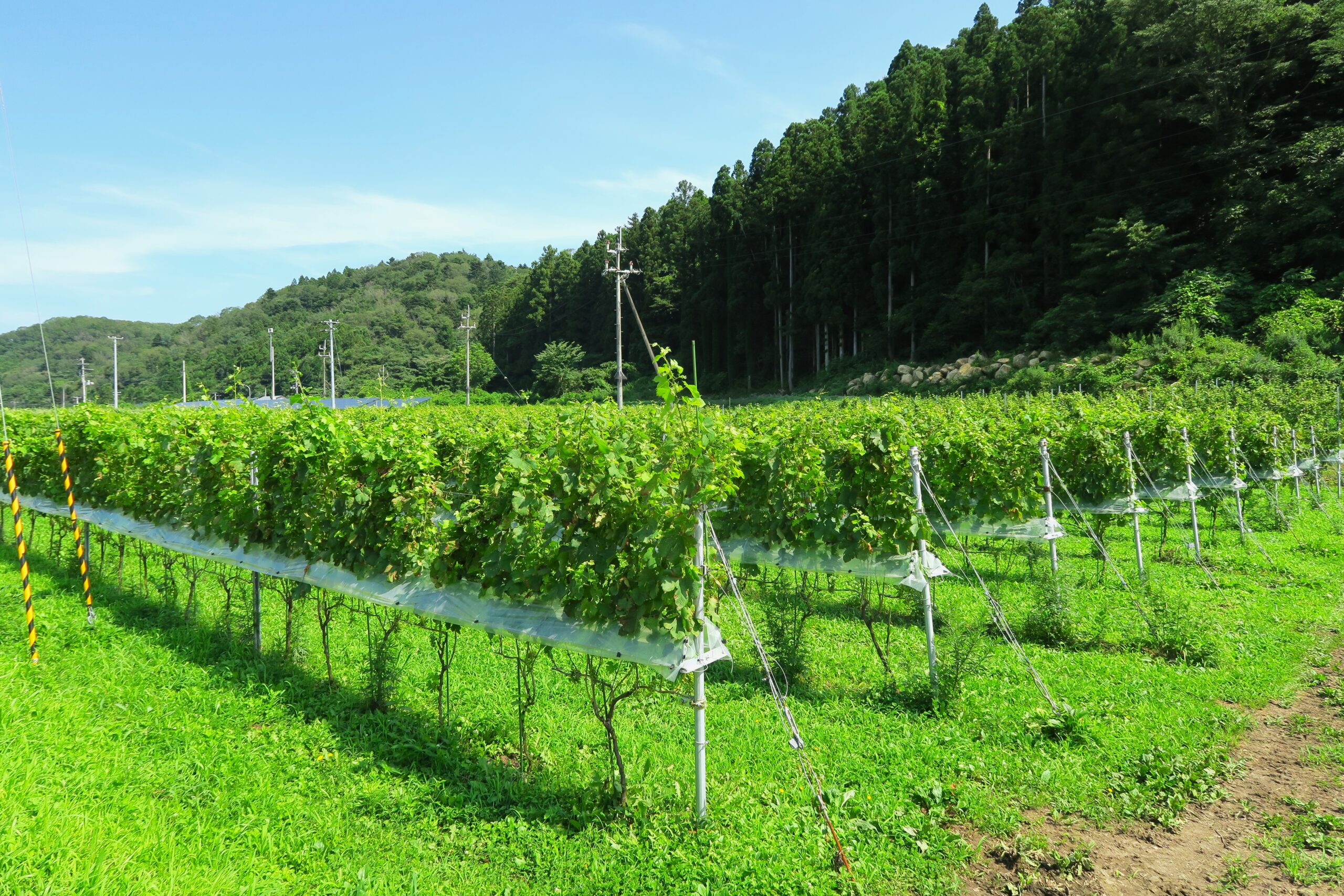 秋保の谷と川に流れる涼やかな風は夏の間もブドウ畑に畝間を吹き抜け、猛暑時の湿気を飛ばし、果実を冷やし、酸味を保ったままブドウを完熟させる天の恩恵となります。
